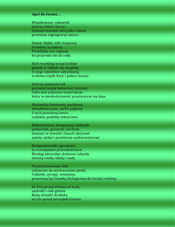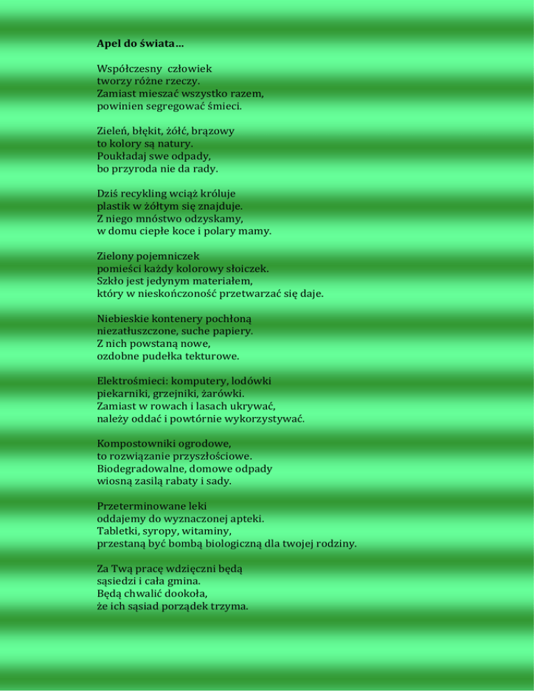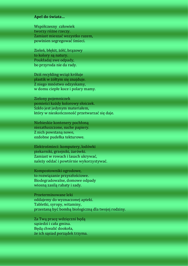 Apel do świata… Współczesny człowiek tworzy różne rzeczy. Zamiast mieszać wszystko razem, powinien segregować śmieci. Zieleń, błękit, żółć, brązowy to kolory są natury. Poukładaj swe odpady, bo przyroda nie da rady. Dziś recykling wciąż króluje plastik w żółtym się znajduje. Z niego mnóstwo odzyskamy, w domu ciepłe koce i polary mamy. Zielony pojemniczek pomieści każdy kolorowy słoiczek. Szkło jest jedynym materiałem, który w nieskończoność przetwarzać się daje. Niebieskie kontenery pochłoną niezatłuszczone, suche papiery. Z nich powstaną nowe, ozdobne pudełka tekturowe. Elektrośmieci: komputery, lodówki piekarniki, grzejniki, żarówki. Zamiast w rowach i lasach ukrywać, należy oddać i powtórnie wykorzystywać. Kompostowniki ogrodowe, to rozwiązanie przyszłościowe. Biodegradowalne, domowe odpady wiosną zasilą rabaty i sady. Przeterminowane leki oddajemy do wyznaczonej apteki. Tabletki, syropy, witaminy, przestaną być bombą biologiczną dla twojej rodziny. Za Twą pracę wdzięczni będą sąsiedzi i cała gmina. Będą chwalić dookoła, że ich sąsiad porządek trzyma.