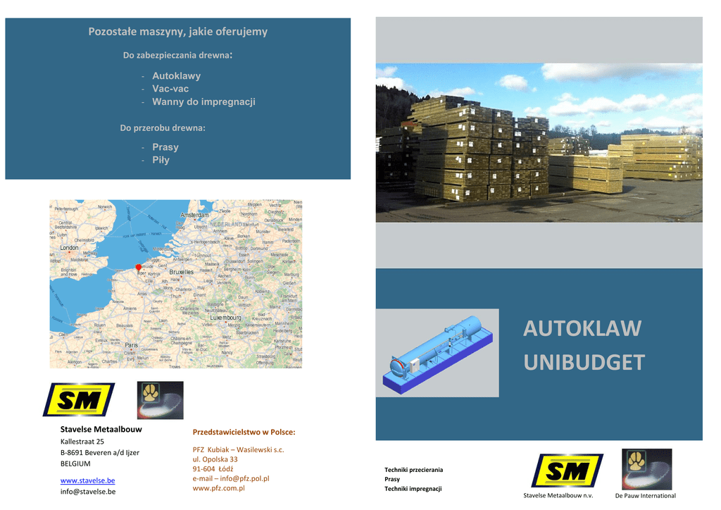 Pozostałe maszyny, jakie oferujemy Do zabezpieczania drewna: - Autoklawy - Vac-vac - Wanny do impregnacji Do przerobu drewna: - Prasy - Piły - AUTOKLAW UNIBUDGET Stavelse Metaalbouw Kallestraat 25 B-8691 Beveren a/d Ijzer BELGIUM www.stavelse.be [email protected] Przedstawicielstwo w Polsce: PFZ Kubiak – Wasilewski s.c. ul. Opolska 33 91-604 Łódź e-mail – [email protected] www.pfz.com.pl Techniki przecierania Prasy Techniki impregnacji Stavelse Metaalbouw n.v. De Pauw International Stavelse Metaalbouw posiada wieloletnie doświadczenie w konstrukcji urządzeń do ochrony drewna, co pozwala na dobór właściwego autoklawu dla potrzeb użytkownika. Nasze autoklawy są znane z zapewnienia doskonałej ekonomiki produkcji i daleko w tyle pozostawiają produkty konkurencyjne. Każdy autoklaw stanowi mocną, stabilną konstrukcję, z ruchomym, szynowym międzytorowiskiem, które umożliwia szybki i wygodny załadunek oraz rozładunek urządzenia. Z boku lub pod autoklawem znajdują się zbiorniki, w których przechowywane są chemikalia przeznaczone do impregnacji. Odpowiednie rozwiązanie za rozsądną cenę! Maszyny wyposażamy w standardowe komponenty od wiodących dostawców, części te bez problemu można także znaleźć na każdym rynku lokalnym. W magazynie posiadamy 40.000 części zamiennych, co zapewnia szybki serwis do każdego użytkownika. Wymiary pakietów zależnie od średnicy autoklawu: Długość: Ø 1,6m : wysokość szerokość Ø 1,8m : wysokość szerokość Ø 2m : wysokość szerokość Ø 2,6m : wysokość szerokość Ø 3m : wysokość szerokość Począwszy od 3,5metra rosnąco co 3 metry 1,0 m 1,0 m 1,2 m 1,2 m 1,3 m 1,2 m 1,8 m 1,2 m 2,4 m 1,2 m