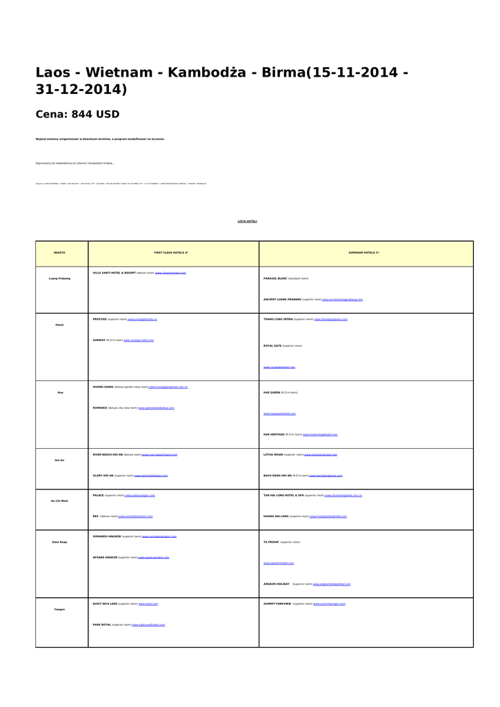 Laos - Wietnam - Kambodża - Birma(15-11-2014 31-12-2014) Cena: 844 USD Wyjazd możemy zorganizować w dowolnym terminie, a program modyfikować na życzenie. Zapraszamy do odwiedzenia aż czterech niezwykłych krajów... Program: LUANG PRABANG – HANOI – HALONG BAY – HUE ROYAL CITY – DA NANG - HOI AN ANCIENT TOWN– HO CHI MINH CITY – CU CHI TUNNELS – SIEM REAP/ANGKOR COMPLEX – YANGON - MANDALAY LISTA HOTELI MIASTO FIRST CLASS HOTELS 4* SUPERIOR HOTELS 3* VILLA SANTI HOTEL & RESORT (deluxe room) www.villasantihotel.com Luang Prabang PARASOL BLANC (standard room) ANCIENT LUANG PRABANG (superior room) www.ancientluangprabang.com PRESTIGE (superior room) www.prestigehotels.vn THANG LONG OPERA (superior room) www.thanglongopera.com Hanoi SUNWAY (R.O.H room) www.sunway-hotel.com ROYAL GATE (superior room) www.royalgatehotel.com HUONG GIANG (deluxe garden view room) www.huonggianghotel.com.vn Hue HUE QUEEN (R.O.H room) ROMANCE (deluxe city view room) www.parkviewhotelhue.com www.huequeenhotel.com HUE HERITAGE (R.O.H room) www.hueheritagehotel.com RIVER BEACH HOI AN (deluxe room) www.river-beachresort.com LOTUS HOIAN (superior room) www.hoianlotushotel.com GLORY HOI AN (superior room) www.gloryhotelhoian.com BACH DANG HOI AN (R.O.H room) www.bachdanghoian.com PALACE (superior room) www.palacesaigon.com TAN HAI LONG HOTEL & SPA (superior room) www.tanhailonghotel.com.vn REX (deluxe room) www.rexhotelvietnam.com HOANG HAI LONG (superior room) www.hoanghailonghotel.com Hoi An Ho Chi Minh SOMADEVI ANGKOR (superior room) www.somadeviangkor.com Siem Reap TA PROHM (superior room) APSARA ANGKOR (superior room) www.apsaraangkor.com www.taprohmhotel.com ANGKOR HOLIDAY DUSIT INYA LAKE (superior room) www.dusit.com Yangon PARK ROYAL (superior room) www.parkroyalhotels.com (superior room) www.angkorholidayhotel.com SUMMIT PARKVIEW (superior room) www.summityangon.com MIASTO FIRST CLASS HOTELS 4* RED CANAL (R.O.H suite room) www.hotelredcanal.com SUPERIOR HOTELS 3* NADI MYANMAR (superior room) www.gicmyanmar.com Mandalay MANDALAY CITY (superior room) www.mandalaycityhotel.com Dzień 1 - 2 WARSZAWA/ LUANG PRABANG Spotkanie na lotnisku w Warszawie na 2 godziny przed planowanym wylotem samolotu, odebranie dokumentów podróży i odprawa paszportowo - bagażowa. Przelot do Laosu na lotnisko Luang Prabang (przylot w godzinach porannych następnego dnia). Po przylocie na miejsce spotkanie z miejscowym kontrahentem i transfer do wybranego hotelu, zakwaterowanie w pokojach oraz czas na krótki odpoczynek i odświeżenie się przed popołudniowym programem. Uwaga: zakwaterowanie w hotelach jest od godziny 14:00, wymeldowanie o 12:00. Wcześniejsze zakwaterowanie lub późniejsze wymeldowanie uzależnione jest od dostępności pokoi oraz dodatkowo płatne. Po południu wyjazd na zwiedzanie stolicy Laosu. Wientian (Miasto Sandałowego Drzewa) to stolica i największe miasto Laosu położone w dolinie rzeki Mekong. Żyje w nim niewiele ponad 200,000 ludzi. W programie m.in: Świątynia Wat Xieng Thong (uznawana za najwspanialsza świątynie Luang Prabang, malowniczo położona na wysokiej skarpie nad Mekongiem); Stupa Wat Visoun; Świątynia Wat Aham; Świątynia Wat Mai - największa świątynia w Luang Prabang, wybudowana pod koniec XVIII w., należy do najczęściej odwiedzanych i fotografowanych świątyń w Luang Prabang. Turystów przyciąga niezwykle kolorowa, pozłacana fasada świątyni (powstała w 1960 roku), przedstawiająca przedostatnią inkarnacje Buddy wraz z scenami z tradycyjnego życia Laotańczyków. Następnie krótka wspinaczka (382 schody) do Świątyni Phousi na zachód słońca. Kolejnym punktem będzie wizyta na lokalnym targu (możliwość zakupów lokalnych wyrobów i pamiątek). Powrót do hotelu. Nocleg w Luang Prabang. Dzień 3 LUANG PRABANG / JASKINIE PAK OU / HANOI Śniadanie w hotelu. Wykwaterowanie z hotelu oraz wycieczka łodzią wzdłuż rzeki Mekong do Świętych Jaskiń Pak Ou: Tham Ting i Tham Phoum. Jaskinie Pak Ou, w ścianach klifu gór zbudowanych z piaskowca, leżą przy połączeniu rzeki Ou i Mekong, około 25 kilometrów od Luang Prabang. Jaskinie stanowiły dawniej składnice zniszczonych, świątynnych wizerunków Buddy (każdy z wizerunków Buddy jest święty i nie wolno ich niszczyć). Jaskinie te także wykorzystywali mnisi jako mieszkania. Obecnie obie jaskinie zawierają około 4,000 posagów Buddy, większość z nich została ofiarowana przez pielgrzymów. Mieszkańcy Luang Prabang wierzą, że jaskinie zamieszkuje wiele dobrych duchów. Krótka wizyta w wiosce Ban Xang Hai. Powrót do Luang Prabang. Jeśli czas na to pozwoli - czas wolny na zakupy w lokalnych marketach (uzależnione od godziny przelotu). Następnie transfer na lotnisko Luang Prabang i przelot do Hanoi (planowane przeloty w godzinach 16:40 - 17:40). Po przylocie do Hanoi spotkanie z lokalnym przewodnikiem oraz transfer do hotelu. Podczas przejazdu usłyszymy krótką historię miasta. Zakwaterowanie w hotelu, kolacja (we własnym zakresie) oraz czas wolny na samodzielne poznawanie miasta. Nocleg w hotelu w Hanoi. Dzień 4 HANOI / ZATOKA HALONG / HANOI Śniadanie w hotelu, następnie wyjazd w kierunku Zatoki Halong (przejazd autostrada zajmuje ok. 2,5 - 4 godziny). Podczas przejazdu możliwość podziwiania unikalnych krajobrazów oraz wysłuchania ciekawych anegdot na temat życia lokalnych mieszkańców. Po przyjeździe do zatoki udajemy się do portu na 4 - godzinna wycieczkę - rejs dużą drewniana łodzią po Zatoce Halong. Wietnamska Zatoka Ha Long doczekała się wielu legend. Nic dziwnego, zapierające dech w piersiach widoki działają na wyobraźnię. Zatoka Ha Long (Zatoka Opadających Smoków) jest jedna z największych atrakcji przyrodniczych Wietnamu i całej Azji. Na powierzchni półtora tysiąca kilometrów kwadratowych rozsianych jest prawie trzy tysiące skalnych (wapiennych i łupkowych) wysp i wysepek o charakterystycznym kształcie, tworząc niezwykle malownicz