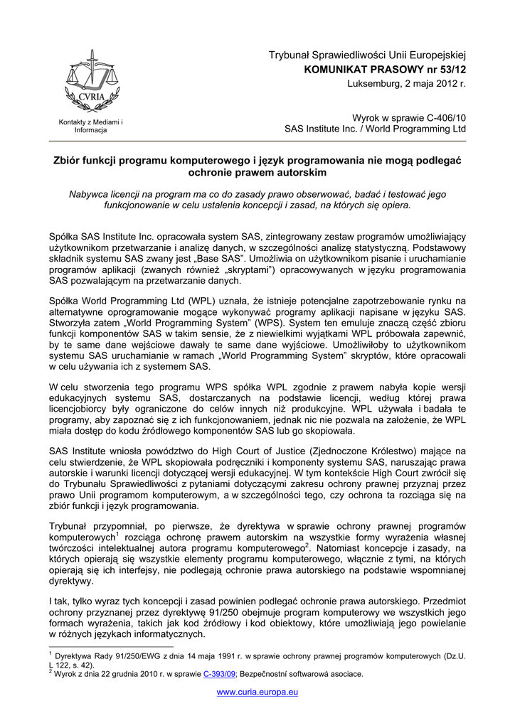 Trybunał Sprawiedliwości Unii Europejskiej KOMUNIKAT PRASOWY nr 53/12 Luksemburg, 2 maja 2012 r. Kontakty z Mediami i Informacja Wyrok w sprawie C-406/10 SAS Institute Inc. / World Programming Ltd Zbiór funkcji programu komputerowego i język programowania nie mogą podlegać ochronie prawem autorskim Nabywca licencji na program ma co do zasady prawo obserwować, badać i testować jego funkcjonowanie w celu ustalenia koncepcji i zasad, na których się opiera. Spółka SAS Institute Inc. opracowała system SAS, zintegrowany zestaw programów umożliwiający użytkownikom przetwarzanie i analizę danych, w szczególności analizę statystyczną. Podstawowy składnik systemu SAS zwany jest „Base SAS”. Umożliwia on użytkownikom pisanie i uruchamianie programów aplikacji (zwanych również „skryptami”) opracowywanych w języku programowania SAS pozwalającym na przetwarzanie danych. Spółka World Programming Ltd (WPL) uznała, że istnieje potencjalne zapotrzebowanie rynku na alternatywne oprogramowanie mogące wykonywać programy aplikacji napisane w języku SAS. Stworzyła zatem „World Programming System” (WPS). System ten emuluje znaczą część zbioru funkcji komponentów SAS w takim sensie, że z niewielkimi wyjątkami WPL próbowała zapewnić, by te same dane wejściowe dawały te same dane wyjściowe. Umożliwiłoby to użytkownikom systemu SAS uruchamianie w ramach „World Programming System” skryptów, które opracowali w celu używania ich z systemem SAS. W celu stworzenia tego programu WPS spółka WPL zgodnie z prawem nabyła kopie wersji edukacyjnych systemu SAS, dostarczanych na podstawie licencji, według której prawa licencjobiorcy były ograniczone do celów innych niż produkcyjne. WPL używała i badała te programy, aby zapoznać się z ich funkcjonowaniem, jednak nic nie pozwala na założenie, że WPL miała dostęp do kodu źródłowego komponentów SAS lub go skopiowała. SAS Institute wniosła powództwo do High Court of Justice (Zjednoczone Królestwo) mające na celu stwierdzenie, że WPL skopiowała podręczniki i komponenty systemu SAS, naruszając prawa autorskie i warunki licencji dotyczącej wersji edukacyjnej. W tym kontekście High Court zwrócił się do Trybunału Sprawiedliwości z pytaniami dotyczącymi zakresu ochrony prawnej przyznaj przez prawo Unii programom komputerowym, a w szczególności tego, czy ochrona ta rozciąga się na zbiór funkcji i język programowania. Trybunał przypomniał, po pierwsze, że dyrektywa w sprawie ochrony prawnej programów komputerowych1 rozciąga ochronę prawem autorskim na wszystkie formy wyrażenia własnej twórczości intelektualnej autora programu komputerowego2. Natomiast koncepcje i zasady, na których opierają się wszystkie elementy programu komputerowego, włącznie z tymi, na których opierają się ich interfejsy, nie podlegają ochronie prawa autorskiego na podstawie wspomnianej dyrektywy. I tak, tylko wyraz tych koncepcji i zasad powinien podlegać ochronie prawa autorskiego. Przedmiot ochrony przyznanej przez dyrektywę 91/250 obejmuje program komputerowy we wszystkich jego formach wyrażenia, takich jak kod źródłowy i kod obiektowy, które umożliwiają jego powielanie w różnych językach informatycznych. 1 Dyrektywa Rady 91/250/EWG z dnia 14 maja 1991 r. w sprawie ochrony prawnej programów komputerowych (Dz.U. L 122, s. 42). 2 Wyrok z dnia 22 grudnia 2010 r. w sprawie C-393/09; Bezpečnostní softwarowá asociace. www.curia.europa.eu Na podstawie tych rozważań Trybunał stwierdził, że ani zbiór funkcji programu komputerowego, ani język programowania i format plików danych używanych w ramach programu komputerowego w celu korzystania z określonych jego funkcji nie stanowią formy wyrażenia. Z tego względu elementy te nie korzystają z ochrony prawa autorskiego. Przyjęcie, że zbiór funkcji programu komputerowego mógłby być chroniony prawem autorskim, oznaczałoby bowiem umożliwienie monopolizowania koncepcji kosztem postępu technicznego i rozwoju przemysłowego. W tym kontekście Trybunał uściślił, że gdyby osoba trzecia uzyskała część kodu źródłowego lub kodu obiektowego dotyczącego języka programowania lub formatu plików danych używanych w ramach programu komputerowego i za pomocą tego kodu starała się stworzyć w swoim własnym programie komputerowym elementy podobne, takie postępowanie mogłoby zostać zakazane przez autora tego programu. W niniejszym zaś przypadku z wyjaśnień sądu krajowego wynika, że WPL nie miała dostępu do kodu źródłowego programu SAS Institute ani nie dokonała dekompilacji kodu obiektowego tego programu. Tylko dzięki obserwowaniu, badaniu i testowaniu zachowania się programu SAS Institute spółka WPL powieliła jego zbiór funkcji, używając tego samego języka programowania i tego samego formatu plików danych. Trybunał zauważył, po drugie, że z jednej strony stosownie do dyrektywy w sprawie ochrony programów komputerowych nabywca licencji na oprogramowanie ma prawo obserwować, badać lub testować funkcjonowanie tego oprogramowania w celu ustalenia koncepcji i zasad, na których opiera się każdy z elementów programu. Jakiekolwiek przepisy umowne sprzeczne z tym uprawnieniem są nieważne. Z drugiej strony ustalenie tych koncepcji i zasad może być dokonywane w ramach czynności dozwolonych na podstawie licencji. W rezultacie podmiot prawa autorskiego do programu komputerowego nie może zabronić, powołując się na umowę licencyjną, nabywcy tej licencji obserwowania, badania lub testowania funkcjonowania tego programu w celu ustalenia koncepcji i zasad, na których opiera się każdy z elementów tego programu, gdy dokonuje czynności objętych tą licencją oraz ładowania i uruchamiania koniecznego do używania programu, pod warunkiem że nabywca ten nie narusza praw wyłącznych podmiotu prawa autorskiego do tego programu. Ponadto zdaniem Trybunału nie dochodzi do naruszeni