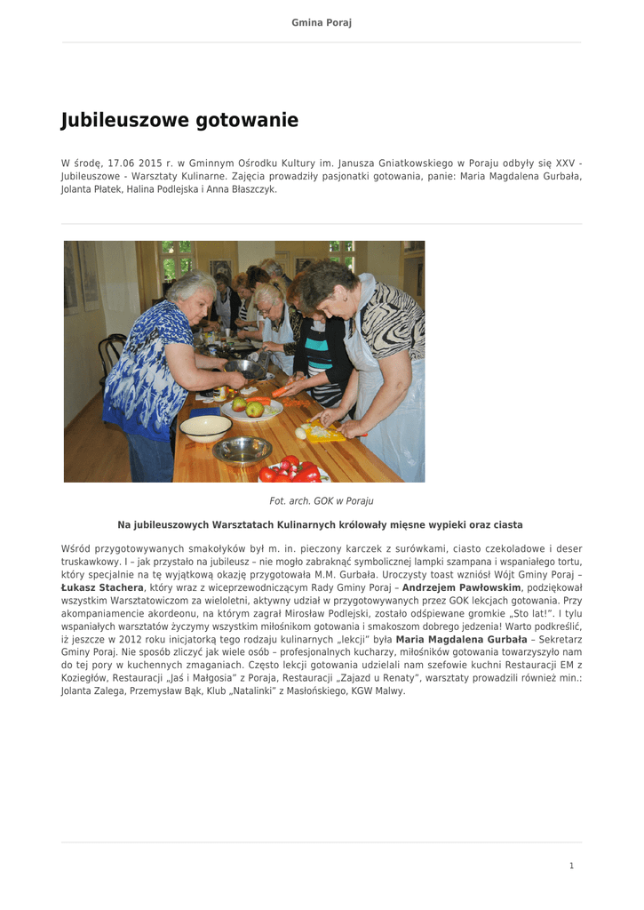 Gmina Poraj Jubileuszowe gotowanie W środę, 17.06 2015 r. w Gminnym Ośrodku Kultury im. Janusza Gniatkowskiego w Poraju odbyły się XXV Jubileuszowe - Warsztaty Kulinarne. Zajęcia prowadziły pasjonatki gotowania, panie: Maria Magdalena Gurbała, Jolanta Płatek, Halina Podlejska i Anna Błaszczyk. Fot. arch. GOK w Poraju Na jubileuszowych Warsztatach Kulinarnych królowały mięsne wypieki oraz ciasta Wśród przygotowywanych smakołyków był m. in. pieczony karczek z surówkami, ciasto czekoladowe i deser truskawkowy. I – jak przystało na jubileusz – nie mogło zabraknąć symbolicznej lampki szampana i wspaniałego tortu, który specjalnie na tę wyjątkową okazję przygotowała M.M. Gurbała. Uroczysty toast wzniósł Wójt Gminy Poraj – Łukasz Stachera, który wraz z wiceprzewodniczącym Rady Gminy Poraj – Andrzejem Pawłowskim, podziękował wszystkim Warsztatowiczom za wieloletni, aktywny udział w przygotowywanych przez GOK lekcjach gotowania. Przy akompaniamencie akordeonu, na którym zagrał Mirosław Podlejski, zostało odśpiewane gromkie „Sto lat!”. I tylu wspaniałych warsztatów życzymy wszystkim miłośnikom gotowania i smakoszom dobrego jedzenia! Warto podkreślić, iż jeszcze w 2012 roku inicjatorką tego rodzaju kulinarnych „lekcji” była Maria Magdalena Gurbała – Sekretarz Gminy Poraj. Nie sposób zliczyć jak wiele osób – profesjonalnych kucharzy, miłośników gotowania towarzyszyło nam do tej pory w kuchennych zmaganiach. Często lekcji gotowania udzielali nam szefowie kuchni Restauracji EM z Koziegłów, Restauracji „Jaś i Małgosia” z Poraja, Restauracji „Zajazd u Renaty”, warsztaty prowadzili również min.: Jolanta Zalega, Przemysław Bąk, Klub „Natalinki” z Masłońskiego, KGW Malwy. 1