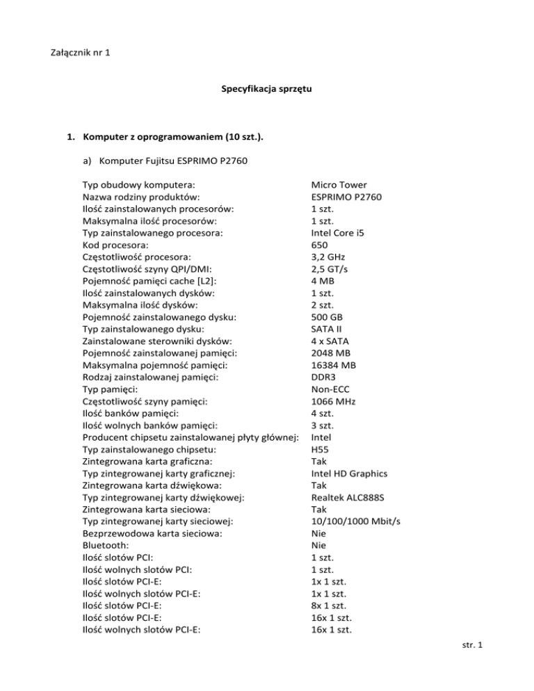 Załącznik nr 1 Specyfikacja sprzętu 1. Komputer z oprogramowaniem (10 szt.). a) Komputer Fujitsu ESPRIMO P2760 Typ obudowy komputera: Nazwa rodziny produktów: Ilość zainstalowanych procesorów: Maksymalna ilość procesorów: Typ zainstalowanego procesora: Kod procesora: Częstotliwość procesora: Częstotliwość szyny QPI/DMI: Pojemność pamięci cache [L2]: Ilość zainstalowanych dysków: Maksymalna ilość dysków: Pojemność zainstalowanego dysku: Typ zainstalowanego dysku: Zainstalowane sterowniki dysków: Pojemność zainstalowanej pamięci: Maksymalna pojemność pamięci: Rodzaj zainstalowanej pamięci: Typ pamięci: Częstotliwość szyny pamięci: Ilość banków pamięci: Ilość wolnych banków pamięci: Producent chipsetu zainstalowanej płyty głównej: Typ zainstalowanego chipsetu: Zintegrowana karta graficzna: Typ zintegrowanej karty graficznej: Zintegrowana karta dźwiękowa: Typ zintegrowanej karty dźwiękowej: Zintegrowana karta sieciowa: Typ zintegrowanej karty sieciowej: Bezprzewodowa karta sieciowa: Bluetooth: Ilość slotów PCI: Ilość wolnych slotów PCI: Ilość slotów PCI-E: Ilość wolnych slotów PCI-E: Ilość slotów PCI-E: Ilość slotów PCI-E: Ilość wolnych slotów PCI-E: Micro Tower ESPRIMO P2760 1 szt. 1 szt. Intel Core i5 650 3,2 GHz 2,5 GT/s 4 MB 1 szt. 2 szt. 500 GB SATA II 4 x SATA 2048 MB 16384 MB DDR3 Non-ECC 1066 MHz 4 szt. 3 szt. Intel H55 Tak Intel HD Graphics Tak Realtek ALC888S Tak 10/100/1000 Mbit/s Nie Nie 1 szt. 1 szt. 1x 1 szt. 1x 1 szt. 8x 1 szt. 16x 1 szt. 16x 1 szt. str. 1 Dodatkowe informacje n/t slotów PCI: • 1 x slot PCI (standard) • 1 x slot PCI-E 1x (standard) • 1 x slot PCI-E 8x (standard) [8x mechanicznie, 4x elektrycznie] • 1 x slot PCI (standard) Ilość wolnych kieszeni 3,5 (zewnętrznych): 0 szt. Ilość wolnych kieszeni 3,5 (wewnętrznych): 0 szt. Ilość wolnych kieszeni 5,25 (zewnętrznych): 1 szt. Interfejsy: • 8 x USB 2.0 • 1 x DVI (wyjście na monitor) • 1 x eSATA • PS/2 (klawiatura) • PS/2 (mysz) • 1 x RJ-45 (LAN) • 1 x wyjście liniowe • 1 x wejście liniowe • 1 x wejście na mikrofon • 1 x wejście na mikrofon (na froncie obudowy) • 1 x wyjście słuchawkowe (na froncie obudowy) Dodatkowe informacje o portach USB 2.0/3.0: • 4 x USB 2.0 (tylny panel) • 2 x USB 2.0 (przedni panel) • 2 x USB 2.0 (opcja) Dodatkowe informacje o portach eSATA: 1 x eSATA (tylny panel) Napędy wbudowane (zainstalowane): DVD±RW Super Multi (+ DVD-RAM) Dual Layer Moc zasilacza (zasilaczy): 300 Wat System operacyjny: Microsoft Windows 7 Professional PL Dołączone wyposażenie: Czytnik kart pamięci 20-in-1 Szerokość: 175 mm Wysokość: 353 mm Głębokość: 425 mm Masa netto: 11 kg b) Monitor Fujitsu L20T-2LED 20" / 1600x900 / 1000:1 / 5ms / 250cd/m2 / 176/170st. /16.7mln kolorów c) Oprogramowanie Microsoft OEM Office Basic Edition 2007 Polish, V2, 1plk 2. Drukarka HP LaserJet P2055dn (Kod producenta: CE459A) wraz z dodatkowym trzecim podajnikiem papieru na 500 arkuszy (1 szt.). str. 2 Kalkulacja cenowa: L.p. Opis 1. Komputer z oprogramowaniem: a) komputer Fujitsu ESPRIMO P2760 i5-650 (3.2) 2GB 500GB DVDSM W7P b) monitor Fujitsu L20T-2LED 20" / 1600x900 / 1000:1 / 5ms / 250cd/m2 / 176/170st. /16.7mln kolorów c) oprogramowanie Microsoft OEM Office Basic Edition 2007 Polish, V2, 1plk 2. Drukarka HP LaserJet P2055dn (Kod producenta: CE459A) wraz z dodatkowym trzecim podajnikiem papieru na 500 arkuszy (1 szt.) Ilość [szt.] Cena brutto [zł] Wartość brutto [zł] 10 1 Razem: str. 3