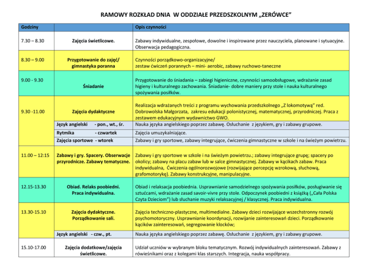 RAMOWY ROZKŁAD DNIA W ODDZIAŁE PRZEDSZKOLNYM „ZERÓWCE” Godziny Opis czynności 7.30 – 8.30 Zajęcia świetlicowe. 8.30 – 9.00 Przygotowanie do zajęć/ gimnastyka poranna 9.00 - 9.30 Śniadanie 9.30 -11.00 Zajęcia dydaktyczne Język angielski - pon., wt., śr. Rytmika - czwartek Zajęcia sportowe - wtorek 11.00 – 12:15 Czynności porządkowo-organizacyjne/ zestaw ćwiczeń porannych – mini- aerobic, zabawy ruchowo-taneczne Przygotowanie do śniadania – zabiegi higieniczne, czynności samoobsługowe, wdrażanie zasad higieny i kulturalnego zachowania. Śniadanie- dobre maniery przy stole i nauka kulturalnego spożywania posiłków. Realizacja wdrażanych treści z programu wychowania przedszkolnego „Z lokomotywą” red. Dobrowolska Małgorzata, zakresu edukacji polonistycznej, matematycznej, przyrodniczej. Praca z zestawem edukacyjnym wydawnictwo GWO. Nauka języka angielskiego poprzez zabawę. Osłuchanie z językiem, gry i zabawy grupowe. Zajęcia umuzykalniające. Zabawy i gry sportowe, zabawy integrujące, ćwiczenia gimnastyczne w szkole i na świeżym powietrzu. Zabawy i gry. Spacery. Obserwacje Zabawy i gry sportowe w szkole i na świeżym powietrzu.; zabawy integrujące grupę; spacery po przyrodnicze. Zabawy tematyczne. okolicy; zabawy na placu zabaw lub w salce gimnastycznej. Zabawy w kącikach zabaw. Praca indywidualna, Ćwiczenia ogólnorozwojowe (rozwijające percepcję wzrokową, słuchową, grafomotorykę). Zabawy konstrukcyjne, manipulacyjne. 12.15-13.30 Obiad. Relaks poobiedni. Praca indywidualna. 13.30-15.10 Zajęcia dydaktyczne. Porządkowanie sali. Język angielski - czw., pt. 15.10-17.00 Zabawy indywidualne, zespołowe, dowolne i inspirowane przez nauczyciela, planowane i sytuacyjne. Obserwacja pedagogiczna. Zajęcia dodatkowe/zajęcia świetlicowe. Obiad i relaksacja poobiednia. Usprawnianie samodzielnego spożywania posiłków, posługiwanie się sztućcami, wdrażanie zasad savoir-vivre przy stole. Odpoczynek poobiedni z książką („Cała Polska Czyta Dzieciom”) lub słuchanie muzyki relaksacyjnej / klasycznej. Praca indywidualna. Zajęcia techniczno-plastyczne, multimedialne. Zabawy dzieci rozwijające wszechstronny rozwój psychomotoryczny. Usprawnianie koordynacji, rozwijanie zainteresowań dzieci. Porządkowanie kącików zainteresowań, segregowanie klocków; Nauka języka angielskiego poprzez zabawę. Osłuchanie z językiem, gry i zabawy grupowe. Udział uczniów w wybranym bloku tematycznym. Rozwój indywidualnych zainteresowań. Zabawy z rówieśnikami oraz z kolegami klas starszych. Integracja, nauka współpracy.