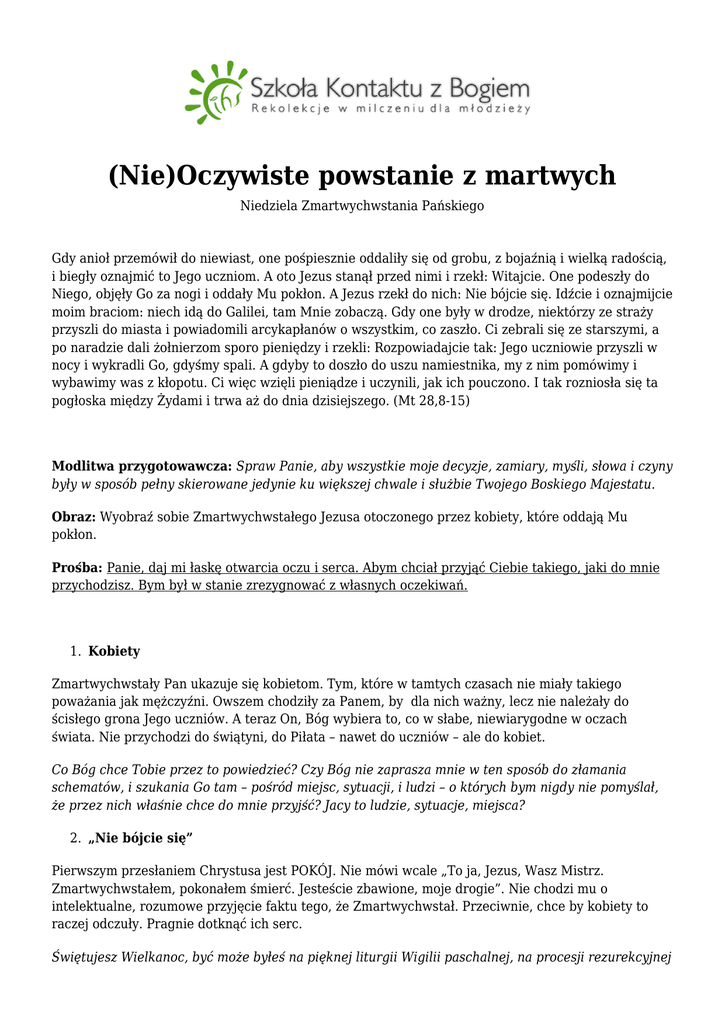 (Nie)Oczywiste powstanie z martwych Niedziela Zmartwychwstania Pańskiego Gdy anioł przemówił do niewiast, one pośpiesznie oddaliły się od grobu, z bojaźnią i wielką radością, i biegły oznajmić to Jego uczniom. A oto Jezus stanął przed nimi i rzekł: Witajcie. One podeszły do Niego, objęły Go za nogi i oddały Mu pokłon. A Jezus rzekł do nich: Nie bójcie się. Idźcie i oznajmijcie moim braciom: niech idą do Galilei, tam Mnie zobaczą. Gdy one były w drodze, niektórzy ze straży przyszli do miasta i powiadomili arcykapłanów o wszystkim, co zaszło. Ci zebrali się ze starszymi, a po naradzie dali żołnierzom sporo pieniędzy i rzekli: Rozpowiadajcie tak: Jego uczniowie przyszli w nocy i wykradli Go, gdyśmy spali. A gdyby to doszło do uszu namiestnika, my z nim pomówimy i wybawimy was z kłopotu. Ci więc wzięli pieniądze i uczynili, jak ich pouczono. I tak rozniosła się ta pogłoska między Żydami i trwa aż do dnia dzisiejszego. (Mt 28,8-15) Modlitwa przygotowawcza: Spraw Panie, aby wszystkie moje decyzje, zamiary, myśli, słowa i czyny były w sposób pełny skierowane jedynie ku większej chwale i służbie Twojego Boskiego Majestatu. Obraz: Wyobraź sobie Zmartwychwstałego Jezusa otoczonego przez kobiety, które oddają Mu pokłon. Prośba: Panie, daj mi łaskę otwarcia oczu i serca. Abym chciał przyjąć Ciebie takiego, jaki do mnie przychodzisz. Bym był w stanie zrezygnować z własnych oczekiwań. 1. Kobiety Zmartwychwstały Pan ukazuje się kobietom. Tym, które w tamtych czasach nie miały takiego poważania jak mężczyźni. Owszem chodziły za Panem, by dla nich ważny, lecz nie należały do ścisłego grona Jego uczniów. A teraz On, Bóg wybiera to, co w słabe, niewiarygodne w oczach świata. Nie przychodzi do świątyni, do Piłata – nawet do uczniów – ale do kobiet. Co Bóg chce Tobie przez to powiedzieć? Czy Bóg nie zaprasza mnie w ten sposób do złamania schematów, i szukania Go tam – pośród miejsc, sytuacji, i ludzi – o których bym nigdy nie pomyślał, że przez nich właśnie chce do mnie przyjść? Jacy to ludzie, sytuacje, miejsca? 2. „Nie bójcie się” Pierwszym przesłaniem Chrystusa jest POKÓJ. Nie mówi wcale „To ja, Jezus, Wasz Mistrz. Zmartwychwstałem, pokonałem śmierć. Jesteście zbawione, moje drogie”. Nie chodzi mu o intelektualne, rozumowe przyjęcie faktu tego, że Zmartwychwstał. Przeciwnie, chce by kobiety to raczej odczuły. Pragnie dotknąć ich serc. Świętujesz Wielkanoc, być może byłeś na pięknej liturgii Wigilii paschalnej, na procesji rezurekcyjnej o zmroku. Zajadasz się jajkami, ciastem. Korzystasz z wolnego czasu. Czy jednak zmartwychwstanie dotknęło twojego serca? Dopuściłeś tam Zmartwychwstałego? 3. Wyruszyć w drogę Co słyszą kobiety? „Idźcie”, a dalej „Niech uczniowie idą”. Zmartwychwstały zaprasza je do wyruszenia w drogę. Bóg postanawia zatem objawiać się w drodze. Wybiera dynamizm, proces. W ten sposób znowu przekracza ludzkie wyobrażenia, i oczekiwania. Nie jest Mesjaszem, który przychodzi w chwale i objawia swą moc, nie rozwiązuje ludzkich problemów. A zaprasza do wyruszenia w drogę. A ta wymaga od człowieka większej uważności, oznacza zmieniające się warunki. Bóg nie chce być statyczny, nie chce być zamknięty w klatkach ludzkiej wyobraźni czy inteligencji. Pragnie ciągle się wymykać i zaskakiwać. Czy czuję się zaproszony do poszukiwania Zmartwychwstałego w codziennym życiu? Czy chcę odpowiedzieć na Jego zaproszenie, czy raczej ograniczam Boga jedynie do liturgii i wyuczonych prawd wiary? Czy faktycznie chcę odpowiedzieć na Jego zaproszenie do wyruszenia w drogę, czy raczej pozostanę przy tym „co już wiem”? Rozmowa końcowa: Porozmawiaj z Jezusem o tym co teraz czujesz. Dziękuj Mu, albo proś o siłę, odwagę. Bądź autentyczny. Na zakończenie odmów: Ojcze nasz