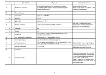 l.p. Opis elementu 1 Zadaszenie sceniczne 2 Parametry sceny Paramery konstrukcja przystosowana do podwieszenia sprzętu oświetleniowego do 1200 kg. Kratownica Quadrosystem (grubość ścianki 3 mm) a szerokość regulowana od 8-12 m b wysokość min 7 m c głębokość regulowana 6-10 m Podesty sceniczne z płynną regulacją wysokości 800 - 1400 mm 3 informacje dodatkowe bez poszycia dachowego (scena przeznaczona do montażu w Hali Sportowo-Widowiskowej) ilość sztuk - 60 atestowana płyta wodoodporna oraz antypoślizgowa w kolorze czarnym lub brązowym a a szerokość 2m b b długość 1m c c obciążenie min. 500 kg/m2 (5 kN/m2) równomiernie rozłożony przy wszystkich wysokościach 4 nogi teleskopowe kwadratowe dodatkowo 40 szt z regulacją 400-800mm 5 elementy mocujące odpowiednia ilość elementów mocujących 6 schody przegubowe z płynną regulacją wysokości do 1400 mm z poręczą z 1 strony wraz z systemem mocowania do podestu stopnie pokryte sklejką antypoślizgową 7 poręcze aluminiowe 32 m (16 szt) przystosowane do mocowania do podestów aluminium Ø35x2,0mm 8 Oświetlenie 1 48 kontrolowane kanały - dimmery 96 pamiętanych programów na 4 stronach 24 sceny Funkcja Blackout Funkcja Sound control przez wejście liniowe Sound-control :gniazdo RCA Wyjście DMX 512: 3-pin XLR złącze ze zmianą polaryzacji sterownik świateł 1 12 kanałowy dimmer min. 10A na kanał Zasilanie 1 lub 3 fazowe Sterowanie analogowe lub DMX Możliwość pracy bez sterownika zewnętrznego Synchronizacja kilku urządzeń przez tryb DMX Automatyczny bezpiecznik na każdym kanale Wyjście kanałów na tylnym panelu. Montaż rack 19" 4U 2 Dimmer 3 PAR64 4 okablowanie kabel gumowy 3x2.5 mm2 + wtyczki wodoodporne 30 szt. , listwa elektryczna 3-wtykowe wodoodporne szt.30 5 uchwyt do lamp 20 szt. 9 Szperacze sceniczne 10 Szkolenie z zakresu montażu i obsługi sprzętu z 3- krotnym montażem z żarówkami 1000W szt. 20 3 szt. 2