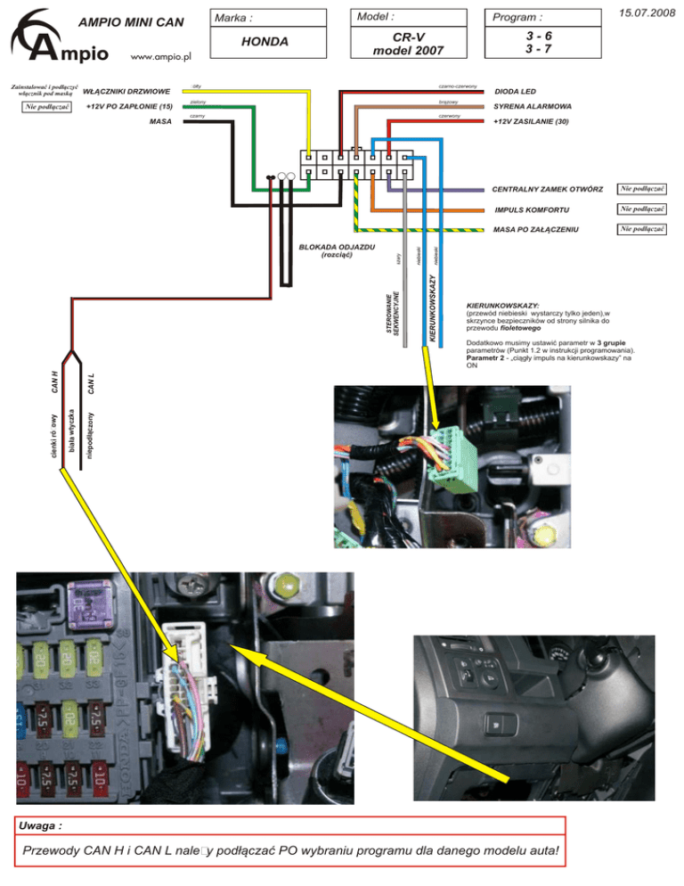 Marka : AMPIO MINI CAN HONDA www.ampio.pl Zainstalować i podłączyć WŁĄCZNIKI DRZWIOWE włącznik pod maską Nie podłączać +12V PO ZAPŁONIE (15) Model : Program : 15.07.2008 3-6 3-7 CR-V model 2007 żółty czarno-czerwony zielony brązowy czarny czerwony DIODA LED MASA SYRENA ALARMOWA +12V ZASILANIE (30) CENTRALNY ZAMEK OTWÓRZ Nie podłączać IMPULS KOMFORTU Nie podłączać MASA PO ZAŁĄCZENIU Nie podłączać BLOKADA ODJAZDU (rozciąć) KIERUNKOWSKAZY: (przewód niebieski wystarczy tylko jeden),w skrzynce bezpieczników od strony silnika do przewodu fioletowego niepodłączony biała wtyczka cienki różowy Dodatkowo musimy ustawić parametr w 3 grupie parametrów (Punkt 1.2 w instrukcji programowania). Parametr 2 - „ciągły impuls na kierunkowskazy” na ON Uwaga : Przewody CAN H i CAN L należy podłączać PO wybraniu programu dla danego modelu auta!