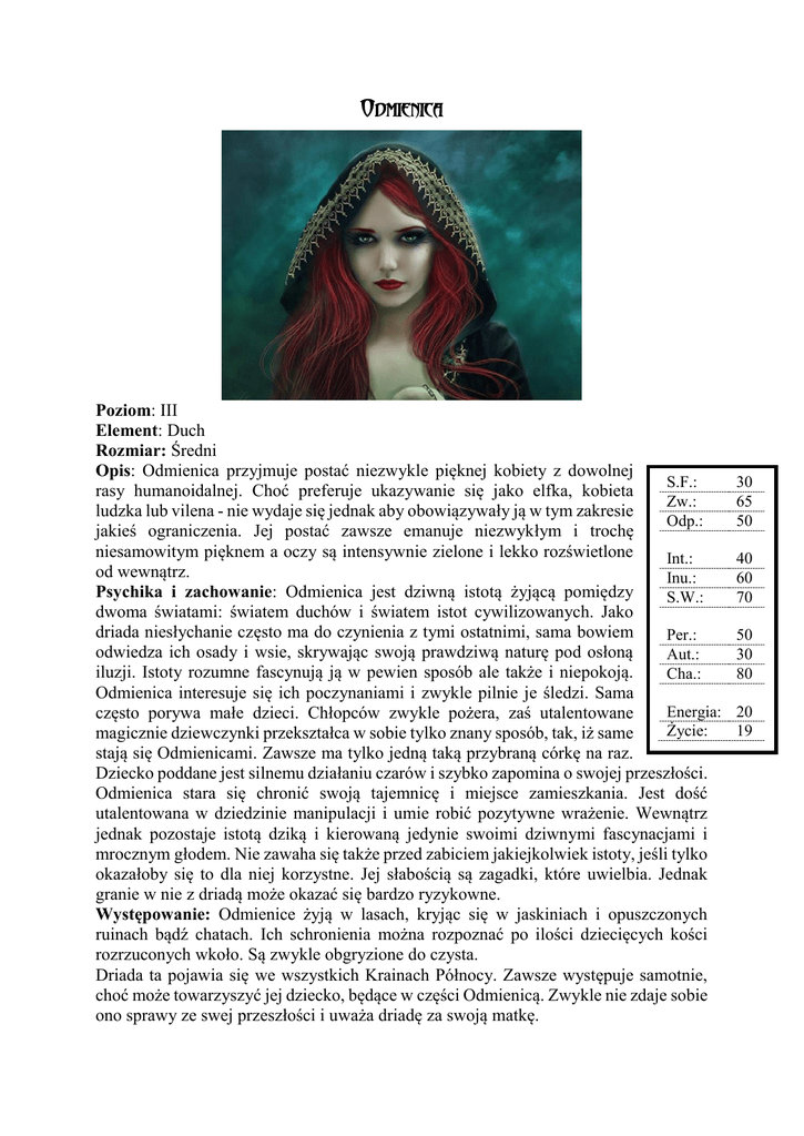 Odmienica Poziom: III Element: Duch Rozmiar: Średni Opis: Odmienica przyjmuje postać niezwykle pięknej kobiety z dowolnej S.F.: rasy humanoidalnej. Choć preferuje ukazywanie się jako elfka, kobieta Zw.: ludzka lub vilena - nie wydaje się jednak aby obowiązywały ją w tym zakresie Odp.: jakieś ograniczenia. Jej postać zawsze emanuje niezwykłym i trochę niesamowitym pięknem a oczy są intensywnie zielone i lekko rozświetlone Int.: od wewnątrz. Inu.: Psychika i zachowanie: Odmienica jest dziwną istotą żyjącą pomiędzy S.W.: dwoma światami: światem duchów i światem istot cywilizowanych. Jako driada niesłychanie często ma do czynienia z tymi ostatnimi, sama bowiem Per.: odwiedza ich osady i wsie, skrywając swoją prawdziwą naturę pod osłoną Aut.: iluzji. Istoty rozumne fascynują ją w pewien sposób ale także i niepokoją. Cha.: Odmienica interesuje się ich poczynaniami i zwykle pilnie je śledzi. Sama Energia: często porywa małe dzieci. Chłopców zwykle pożera, zaś utalentowane Życie: magicznie dziewczynki przekształca w sobie tylko znany sposób, tak, iż same stają się Odmienicami. Zawsze ma tylko jedną taką przybraną córkę na raz. Dziecko poddane jest silnemu działaniu czarów i szybko zapomina o swojej przeszłości. Odmienica stara się chronić swoją tajemnicę i miejsce zamieszkania. Jest dość utalentowana w dziedzinie manipulacji i umie robić pozytywne wrażenie. Wewnątrz jednak pozostaje istotą dziką i kierowaną jedynie swoimi dziwnymi fascynacjami i mrocznym głodem. Nie zawaha się także przed zabiciem jakiejkolwiek istoty, jeśli tylko okazałoby się to dla niej korzystne. Jej słabością są zagadki, które uwielbia. Jednak granie w nie z driadą może okazać się bardzo ryzykowne. Występowanie: Odmienice żyją w lasach, kryjąc się w jaskiniach i opuszczonych ruinach bądź chatach. Ich schronienia można rozpoznać po ilości dziecięcych kości rozrzuconych wkoło. Są zwykle obgryzione do czysta. Driada ta pojawia się we wszystkich Krainach Północy. Zawsze występuje samotnie, choć może towarzyszyć jej dziecko, będące w części Odmienicą. Zwykle nie zdaje sobie ono sprawy ze swej przeszłości i uważa driadę za swoją matkę. 30 65 50 40 60 70 50 30 80 20 19 Umiejętności: Krycie się +9, Manipulacja +6, Przetrwanie +15, Uniki +15, Instynkt +9, Kosmologia +6, Medycyna Ezoteryczna +6, Natura +6, Teoria Magii +6, Zielarstwo +9, Aktorstwo: +15, Empatia +9, Obserwacja +9, Uwodzenie +9. Zasady specjalne: W walce Odmienica posługuje się bronią stworzoną przez rasy rozumne, którą ukradła, kupiła lub odebrała zamordowanym ofiarom. Preferuje bronie drzewcowe, lecz umie także świetnie posługiwać się sztyletem. Woli atakować z zaskoczenia, aby szybko unieszkodliwić ofiarę. Z zasady jednak stara się trzymać na uboczu, maskująć swą naturę czarami iluzyjnymi. Używa ich także często po to, by zdezorientować swoje ofiary. Uwielbia także zadawać zagadki. Ofiara, która nie odpowie poprawnie traci K6 punktów Żywotności, są to obrażenia magiczne. Jedyną obroną jest poprawna odpowiedź i zadanie Odmienicy takiej zagadki, której nie będzie umiała rozwiązać. Istota ta może używać Elfiego Światła, ma ono jednak dziwną, fioletowo - błekitną barwę. Jest także utalentowana w zakresie Zdolności Astralnych (głownie w magii iluzyjnej): 4 P.M. 1 St. Wtajemniczenia: LD (A) 2 St. Wtajemniczenia: OoBE (2), Kształtowanie Astralu (4), Astralne Mistrzostwa Wejrzenie (1); Duch 5 3 St. Wtajemniczenia: Fantastyczna Orientacja (1), Marzenie (2), Umysł nad Wiatr 3 materią (1); Woda 3 4 St. Wtajemniczenia: Materializacja (A) Ziemia 3 Może także rzucać czary Elementarne, Łowieckie i Księżycowych Uroków: Poziom I – Medytacja Ducha, Znak Ducha, Woń Lasu, Cienisty Płaszcz, Księżycowy Ognik, Oślepienie, Srebrzysta Aura; Poziom II – Kształtowanie Ducha, Tarcza Ducha, Wzrok Ducha, Leśny Kamuflaż, Zatarcie Śladów, Cieniste Ukrycie, Księżycowa Mgła, Księżycowe Widmo, Rozmycie Obecności, Wirujące Cienie; Driadę chroni stała aura magiczna, zwykle nosi także na sobie lekką zbroję. Zdolności specjalne: - Elfi wzrok; - Ruchliwość; - Aura Magiczna; - Odporność na broń niemagiczną; - Świadomość Sieci; - Widzenie Astralne; - Przebudzenie Astralu; - Elfie Światło; - Szybki refleks; - Magiczne Zagadki; Biegłość Krótkie Drzewcowe P.A. 100 120 Obr. K6 + 3 K10 + 3 Krytyk: Inicjatywa: 3% 70 P.O. 60 Pancerz: Zbroja lekka: 3 obrony Aura magiczna: 3 obrony Ciekawostki: Odmienica pożera jedynie dzieci, ciała dorosłych pozostawia nietknięte. Posiada także zielony meszek między palcami rąk, po którym można ją rozpoznać, albowiem nie jest w stanie zamaskować go żadnym zaklęciem. Dziecko zmienione przez Odmienicę posiada Przebudzenie Astralu, zdolności OoBE i Kształtowanie Astralu na stopniu 1. Może także rzucać kilka zaklęć Księżycowych Uroków z Poziomu I.