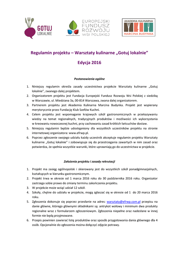 Regulamin projektu – Warsztaty kulinarne „Gotuj lokalnie” Edycja 2016 Postanowienia ogólne 1. Niniejszy regulamin określa zasady uczestnictwa projekcie Warsztaty kulinarne „Gotuj lokalnie”, zwanego dalej projektem. 2. Organizatorem projektu jest Fundacja Europejski Fundusz Rozwoju Wsi Polskiej z siedzibą w Warszawie, ul. Miedziana 3a, 00-814 Warszawa, zwana dalej organizatorem. 3. Partnerem projektu jest Akademia Kulinarna Marcina Budynka. Projekt jest wspierany merytorycznie przez Fundację Klub Szefów Kuchni. 4. Celem projektu jest wspomaganie krajowych szkół gastronomicznych w przekazywaniu wiedzy na temat regionalnych, tradycyjnych produktów i możliwości ich wykorzystania w kreowaniu nowoczesnej kuchni, przy zachowaniu zasad krótkich łańcuchów dostaw. 5. Niniejszy regulamin będzie udostępniony dla wszystkich uczestników projektu na stronie internetowej organizatora: www.efrwp.pl. 6. Poprzez zgłoszenie swojego udziału każdy uczestnik akceptuje regulamin projektu Warsztaty kulinarne „Gotuj lokalnie” i zobowiązuje się do przestrzegania zawartych w nim zasad oraz potwierdza, że spełnia wszystkie warunki, które uprawniają go do uczestnictwa w projekcie. Założenia projektu i zasady rekrutacji 1. Projekt ma zasięg ogólnopolski i skierowany jest do wszystkich szkół ponadgimnazjalnych, kształcących w kierunku gastronomicznym. 2. Projekt trwa w okresie od 1 marca 2016 roku do 30 października 2016 roku. Organizator zastrzega sobie prawo do zmiany terminu zakończenia projektu. 3. W projekcie może wziąć udział 12 szkół. 4. Szkoły, chętne do udziału w projekcie, mogą zgłaszać się w okresie od 1 do 20 marca 2016 roku. 5. Zgłoszenia dokonuje się poprzez przesłanie na adres: [email protected] przepisu na danie główne, którego głównymi składnikami są: antrykot wołowy i minimum dwa produkty regionalne wraz z formularzem zgłoszeniowym. Zgłoszenia niepełne oraz nadesłane w innej formie nie będą przyjmowane. 6. Przepis powinien zawierać listę produktów oraz sposób przygotowania dania głównego dla 4 osób. Opcjonalnie do zgłoszenia można dołączyć zdjęcie potrawy. Regulamin projektu – Warsztaty kulinarne „Gotuj Lokalnie 7. Za datę wpływu zgłoszenia uważa się dzień i godzinę, w którym przepis wraz z kompletnie wypełnionym formularzem zostaną zarejestrowane na koncie pocztowym: [email protected]. 8. Spośród nadesłanych zgłoszeń jury projektu wybierze 12 najlepszych przepisów, których autorzy zostaną zakwalifikowani do udziału w projekcie. 9. Każda ze szkół, która prześle zgłoszenie, zostanie poinformowana drogą elektroniczną o wynikach rekrutacji do 25 marca 2016 roku. Realizacja projektu 1. Zgłaszając swój udział, szkoła wskazuje dwóch nauczycieli-opiekunów projektu oraz grupę 1215 uczniów, którzy wezmą udział w projekcie. 2. Projekt składa się z trzech części: warsztatów i konkursu kulinarnego dla nauczycieli-opiekunów; warsztatów kulinarnych w szkołach, prowadzonych przez nauczycieli-opiekunów; konkursu kulinarnego dla uczniów. 3. Nauczyciele-opiekunowie, wytypowani przez szkołę, są zobowiązani do udziału w warsztatach i konkursie kulinarnym, które odbędą się w dniach 5-6 kwietnia 2016 roku w Warszawie. Spotkanie będzie obejmowało część teoretyczną: wprowadzenie do projektu i jego tematyki oraz praktyczną – warsztaty kulinarne i mini konkurs kulinarny. Koszty dojazdu na szkolenie, zakwaterowania oraz wyżywienia pokrywa organizator. 4. Konkurs kulinarny dla nauczycieli-opiekunów będzie polegał na przygotowaniu dania głównego, zgłoszonego podczas rekrutacji do projektu. Konkurs będzie odbywał się w oparciu o odrębny regulamin. 5. Nagrodą dla zdobywców trzech pierwszych miejsc w konkursie dla nauczycieli-opiekunów są dwudniowe warsztaty kulinarne w Grodnie k/Międzyzdrojów (ekipy 4-osobowe z każdej szkoły) w terminie pomiędzy 8 a 15 maja 2016 roku. 6. Nauczyciele-opiekunowie są zobowiązani przeprowadzić warsztaty kulinarne, obejmujące zajęcia teoretyczne i praktyczne dla wytypowanej grupy uczniów, w łącznym wymiarze 10 godzin lekcyjnych. Za przeprowadzone warsztaty nauczyciele otrzymają wynagrodzenie w wysokości 40 zł brutto za każdą przeprowadzoną godzinę lekcyjną, na podstawie odrębnej umowy, zawartej z organizatorem. 7. Szkoły, które zostaną zakwalifikowane do udziału w projekcie, otrzymają: materiały dydaktyczne do przeprowadzenia warsztatów – do 10 kwietnia 2016 roku, środki na konto szkoły z przeznaczeniem na zakup produktów na warsztaty w kwocie 500 zł – do 10 kwietnia 2016 roku. 8. Wraz z początkiem warsztatów w szkołach organizator ogłosi konkurs dla uczniów uczestniczących w projekcie. Konkurs będzie obejmował przygotowanie dania głównego, których podstawowym składnikiem będzie wołowina oraz minimum dwa produkty regionalne. Przepis nie może być powieleniem przepisu, podanego w zgłoszeniu do rekrutacji. 9. Termin nadsyłania zgłoszeń na konkurs dla uczniów upływa 24 czerwca 2016 roku. Jury w terminie do 15 sierpnia 2016 roku wybierze 10 przepisów dań, których autorzy zostaną zaproszeni na finał konkursu. 10. W terminie do 10 września 2016 roku organizator powiadomi listownie szkoły o zakwalifikowaniu się do finału. 2 Regulamin projektu – Warsztaty kulinarne „Gotuj Lokalnie 11. Finał konkursu odbędzie się we wrześniu/październiku 2016 roku. 12. Zwycięzcy konkursu otrzymają nagrodę – kurs w Akademii Kulinarnej Marcina Budynka wraz z wyżywieniem i zakwaterowaniem. Wszyscy finaliści otrzymają nagrody rzeczowe. 13. Szczegółowe zasady konkursu dla uczniów oraz jego finału zostaną zawarte w odrębnym regulaminie i przekazane nauczycielom-opiekunom w trakcie warsztatów kulinarnych dla nich. 14. Nauczyciel-opiekun, po zakończeniu warsztatów w szkole, jest zobowiązany złożyć sprawozdanie w formie określonej przez organizatora. 15. Wszelkie in