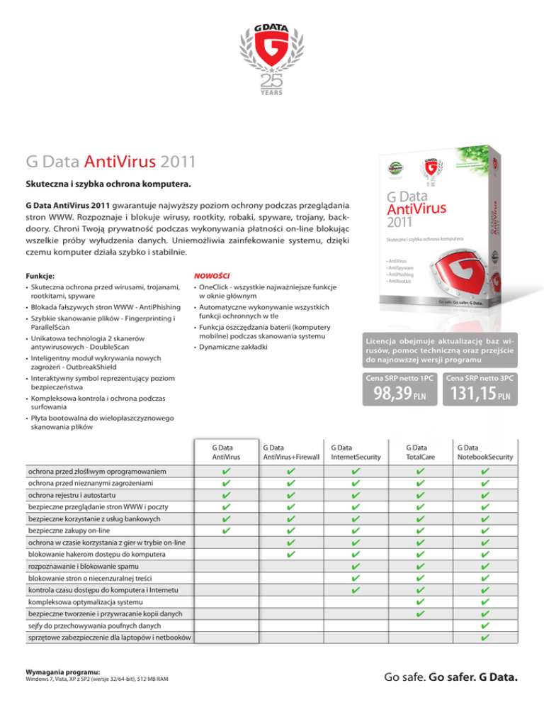 G Data AntiVirus 2011 Skuteczna i szybka ochrona komputera. G Data AntiVirus 2011 gwarantuje najwyższy poziom ochrony podczas przeglądania stron WWW. Rozpoznaje i blokuje wirusy, rootkity, robaki, spyware, trojany, backdoory. Chroni Twoją prywatność podczas wykonywania płatności on-line blokując wszelkie próby wyłudzenia danych. Uniemożliwia zainfekowanie systemu, dzięki czemu komputer działa szybko i stabilnie. Funkcje: Nowości • Skuteczna ochrona przed wirusami, trojanami, rootkitami, spyware • OneClick - wszystkie najważniejsze funkcje w oknie głównym • Blokada fałszywych stron WWW - AntiPhishing • Automatyczne wykonywanie wszystkich funkcji ochronnych w tle • Szybkie skanowanie plików - Fingerprinting i ParallelScan • Unikatowa technologia 2 skanerów antywirusowych - DoubleScan • Funkcja oszczędzania baterii (komputery mobilne) podczas skanowania systemu Licencja obejmuje aktualizację baz wirusów, pomoc techniczną oraz przejście do najnowszej wersji programu • Dynamiczne zakładki • Inteligentny moduł wykrywania nowych zagrożeń - OutbreakShield Cena SRP netto 1PC • Interaktywny symbol reprezentujący poziom bezpieczeństwa 98,39 PLN • Kompleksowa kontrola i ochrona podczas surfowania Cena SRP netto 3PC 131,15 PLN • Płyta bootowalna do wielopłaszczyznowego skanowania plików ochrona przed złośliwym oprogramowaniem ochrona przed nieznanymi zagrożeniami ochrona rejestru i autostartu bezpieczne przeglądanie stron WWW i poczty bezpieczne korzystanie z usług bankowych bezpieczne zakupy on-line ochrona w czasie korzystania z gier w trybie on-line blokowanie hakerom dostępu do komputera rozpoznawanie i blokowanie spamu blokowanie stron o niecenzuralnej treści kontrola czasu dostępu do komputera i Internetu kompleksowa optymalizacja systemu bezpieczne tworzenie i przywracanie kopii danych sejfy do przechowywania poufnych danych sprzętowe zabezpieczenie dla laptopów i netbooków Wymagania programu: Windows 7, Vista, XP z SP2 (wersje 32/64-bit), 512 MB RAM G Data AntiVirus G Data AntiVirus+Firewall G Data InternetSecurity G Data TotalCare G Data NotebookSecurity ✔ ✔ ✔ ✔ ✔ ✔ ✔ ✔ ✔ ✔ ✔ ✔ ✔ ✔ ✔ ✔ ✔ ✔ ✔ ✔ ✔ ✔ ✔ ✔ ✔ ✔ ✔ ✔ ✔ ✔ ✔ ✔ ✔ ✔ ✔ ✔ ✔ ✔ ✔ ✔ ✔ ✔ ✔ ✔ ✔ ✔ ✔ ✔ ✔ ✔ ✔ ✔ ✔ Go safe. Go safer. G Data.