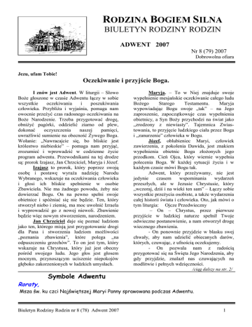 RODZINA BOGIEM SILNA BIULETYN RODZINY RODZIN ADWENT 2007 Nr 8 (79) 2007 Dobrowolna ofiara Jezu, ufam Tobie! Oczekiwanie i przyjście Boga. I znów jest Adwent. W liturgii – Słowo BoŜe głoszone w czasie Adwentu łączy w sobie wszystkie oczekiwania i poszukiwania człowieka. PrzybliŜa i wyjaśnia, pomaga nam owocnie przeŜyć czas radosnego oczekiwania na BoŜe Narodzenie. Trzeba przygotować drogę, obniŜyć pagórki, oddzielić ziarno od plew, dokonać oczyszczenia naszej pamięci, uwraŜliwić sumienie na obecność śywego Boga. Wołanie: „Nawracajcie się, bo bliskie jest królestwo niebieskie” – pomaga nam przyjąć, zrozumieć i wprowadzić w codzienne Ŝycie program adwentu. Przewodnikami na tej drodze są: prorok Izajasz, Jan Chrzciciel, Maryja i Józef. Izajasz to prorok, który poprzez swoją osobę i postawę wyraŜa nadzieję Narodu Wybranego, wskazuje na oczekiwania człowieka i głosi ich bliskie spełnienie w osobie Zbawiciela. Nie ma Ŝadnego powodu, Ŝeby nie dowierzać Bogu. On na pewno spełni swoje obietnice i spóźniać się nie będzie. Ten, który stworzył niebo i ziemię, ma moc uwolnić Izraela i wyprowadzić go z nowej niewoli. Zbawienie będzie więc nowym stworzeniem, narodzeniem. Jan Chrzciciel daje się poznać ludziom jako ten, którego misją jest przygotowanie drogi dla Pana i stworzenia ludziom moŜliwości „poznania zbawienia”, które polega „na odpuszczeniu grzechów”. To on jest tym, który wskazuje na Chrystusa, który juŜ jest obecny pośród swojego ludu. Jego głos jest głosem mocnym, przynoszącym uciszenie niepokojów głęboko zakorzenionych w ludzkich umysłach. Maryja. – To w Niej znajduje swoje wypełnienie mesjańskie oczekiwanie całego ludu BoŜego Starego Testamentu. Maryja wypowiadając Bogu swoje „tak” – na Jego zaproszenie, zapoczątkowuje czas wypełnienia obietnicy, a Syn BoŜy przychodzi na świat jako „zrodzony z niewiasty”. Tajemnica Zwiastowania, to przyjęcie ludzkiego ciała przez Boga i „zanurzenie” człowieka w Bogu. Józef, oblubieniec Maryi, człowiek zawierzenia, z pokolenia Dawida, jest znakiem wypełnienia obietnic Boga złoŜonych jego przodkom. Cień Ojca, który wiernie wypełnia polecenia Boga. W kaŜdej sytuacji Ŝycia i w kaŜdym czasie mówi Bogu tak. Adwent, który przeŜywamy, nie jest jedynie czasem wspominania wydarzeń przeszłych, ale w Jezusie Chrystusie, który „wczoraj, dziś i na wieki ten sam” – Łączy sobie wszystkie przeŜycia osobiste, a takŜe wydarzenia całej historii świata i człowieka. Oto, jak mówi o tym liturgia: Ojcze Przedwieczny – On – Chrystus, przez pierwsze przyjście w ludzkiej naturze spełnił Twoje odwieczne postanowienie, a nam otworzył drogę wiecznego zbawienia. - On ponownie przyjdzie w blasku swej chwały, aby nam udzielić obiecanych darów, których, czuwając, z ufnością oczekujemy. - On pozwala nam z radością przygotować się na Święta Jego Narodzenia, aby gdy przyjdzie, znalazł nas czuwających na modlitwie i pełnych wdzięczności. /ciąg dalszy na str. 2/ Symbole Adwentu Roraty, Msza św. ku czci Najświętszej Maryi Panny sprawowana podczas Adwentu. Biuletyn Rodziny Rodzin nr 8 (78) Adwent 2007 1 Oczekiwanie i przyjście Boga. c.d. Czas adwentu jest szczególnym darem Boga. Oczekiwanie, które przeŜywamy jest wielką pomocą, aby przygotować się na przyjęcie Chrystusa do naszej codzienności, otworzyć serca i umysły, otworzyć drzwi naszych domów. Adwent bowiem, to nasze Ŝycie, które przygotowuje nas na najwaŜniejszy moment, a będzie nim – Spotkanie z Chrystusem w Domu Ojca. „Nie moglibyśmy z całym przekonaniem wołać: „Przyjdź Panie Jezu”, jeŜeli On juŜ by nie przyszedł. Co więcej, nie moglibyśmy teŜ mówić z całą stanowczością i przekonaniem: „On jest tutaj obecny”, jeŜeli nie bylibyśmy przekonani w wierze, Ŝe On przyjdzie, aby udoskonalić swoje królestwo na wieki”. (O. Casel) Czas adwentu – jest sprawdzianem czy rzeczywiście oczekujemy Chrystusa, czy jest w nas tęsknota za Bogiem. Świat, w którym Ŝyjemy proponuje nam zupełnie coś innego: rzeczy, zakupy, niesamowity pośpiech, kłujące w oczy reklamy, zagubienie. Trzeba nam trwać w czujnym oczekiwaniu przepełnionym wiarą, modlitwą i otwartością, co pozwoli nam dostrzegać i odczytywać znaki wskazujące na przyjście Pana w kaŜdych okolicznościach i momentach naszego codziennego Ŝycia – chodzenia w obecności Boga. NaleŜy podąŜać śladami Chrystusa, a nie kroczyć krętymi drogami i Ŝyć tak, jakby Boga nie było. Nawrócić się – to znaczy spojrzeć na wszystko inaczej w świetle obecności Chrystusa - tak, jak Maryja i Józef. Trzeba nam mieć pokorne serce i wolne od egoizmu, aby kierować się cierpliwą miłością względem bliźnich. Ma temu słuŜyć większe wyciszenie, rezygnacja z czytania codziennych gazet, asceza w korzystaniu z oglądania telewizji, internetu. Czytanie i rozwaŜanie kaŜdego dnia Słowa BoŜego, w miarę moŜliwości uczestnictwo w roratach, wspólna modlitwa wieczorna, Apel Maryjny. KaŜda, kaŜdy z nas, nasze rodziny winny zastanowić się, jak najowocniej dla nas przeŜyć ten błogosławiony czas. Jeśli nie będzie prawdziwego Adwentu nie będzie teŜ BoŜego Narodzenia, chociaŜ mogą być święta – zabraknie Kogoś najwaŜniejszego. W trzecią niedzielę adwentu modlimy się: „BoŜe, Ty widzisz, z jaką wiarą oczekujemy Świąt Narodzenia Pańskiego, spraw, abyśmy przygotowali nasze serca i z radością mogli obchodzić wielką tajemnicę naszego zbawienia”. Bóg widzi. Wypada, abyśmy i my zobaczyli, jak przygotujemy się na BoŜe Narodzenie w naszej Rodzinie. Ks. Feliks Folejewski SAC Ojciec Duchowny Rodziny Rodzin Symbole Adwentu Świeca adwentowa - roratka : Świeca roratnia symbolizowała Najświętszą Maryję Pannę jako Jutrzenkę „przed przyjściem”– Jezusa Chrystusa. Wieniec Adwentowy Umieszczamy w kościołach i w doma