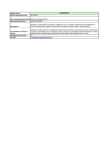 Miejsce pracy Nazwa stanowiska pracy INTERSPORT sprzedawca Okres obowiązywania oferty do końca listopada 2014 r. aktywna sprzedaż Opis stanowiska pracy Wymagania Co pracodawca oferuje w zamian Wymagane dokumenty Kontakt otwartość i zorientowanie na klienta, umiejętnośc pracy w zespole, doświadczenie sprzedażowe w branży sportowej mile widziane, pasjonowanie się sportem będzie atutem, dyspozycyjność atrakcyjny system premiowy, profesjonalne szkolenia produktowe, elastyczny czas pracy, dynamiczne i przyjazne środowisko pracy, atrakcyjne zniżki na zakupy we wszystkich salonach Intersport w Polsce, dofinansowanie dodatkowego ubezpieczenia medycznego oraz ubezpieczenia na życie CV [email protected]