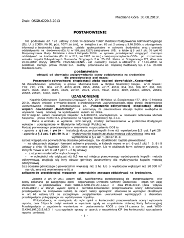 Miedziana Góra 30.08.2013r. Znak: OSGR.6220.3.2013 POSTANOWIENIE Na podstawie art. 123 ustawy z dnia 14 czerwca 1960r. Kodeks Postępowania Administracyjnego (Dz. U. z 2000r. Nr 98, poz. 1071 ze zm), w związku z art. 63 ust. 2 ustawy z 3.10.2008r. o udostępnianiu informacji o środowisku i jego ochronie, udziale społeczeństwa w ochronie środowiska oraz o ocenach oddziaływania na środowisko (Dz. U. nr 199, poz.1227) dalej ustawa UIŚ, a także § 3 ust.1 pkt 39 i pkt 40 Rozporządzenia Rady Ministrów z dnia 9 listopada 2010r. w sprawie przedsięwzięć mogących znacząco oddziaływać na środowisko (Dz. U. nr 213, poz.1397 ze zm.) - dalej rozporządzenie OOŚ- po rozpatrzeniu wniosku Kopalni Odkrywkowych Surowców Drogowych S.A. 25-116 Kielce ul. Ściegiennego 177, które dnia 23.06.2013r. złożyły UMOWE PRZENIESIENIA - akt notarialny Repet. A 4489/2013 z 17.05.2013r. na podstawie którego prawa KOSD S.A. zostały przeniesione na Kopalnię Kostomłoty Sp. z o.o 26-085 Miedziana Góra, postanawiam odstąpić od obowiązku przeprowadzania oceny oddziaływania na środowisko dla przedsięwzięcia pod nazwą: Poszerzenie odkrywkowej eksploatacji złoża wapieni dewońskich „Kostomłoty” na nieruchomości położonej w gminie Miedziana Góra w obrębie Kostomłoty Drugie, nr nr działek : 71/2, 71/3, 71/4, 80/4, 491/2, 491/3, 491/4, 491/5, 491/6, 491/7, 491/8, 334, 335, 336, 337, 338, 339, 352/1, 353/5, 353/7, 353/8, 353/9, 2216/1, 27/74, 27/76, 493/2, 494/3, 496/1, 2055/3, 2055/5, 2058/3, 2058/5, 2059/1, 340/2, 390/1. UZASADNIENIE Kopalnie Odkrywkowe Surowców Drogowych S.A. 25-116 Kielce ul. Ściegiennego 177, dnia 19 kwietnia 2013r. złożyły wniosek o wydanie decyzji o środowiskowych uwarunkowaniach, która określi środowiskowe uwarunkowania realizacji przedsięwzięcia pn. „Poszerzenie odkrywkowej eksploatacji złoża wapieni dewońskich „Kostomłoty” z informacją, że przedmiotowa decyzja będzie niezbędna do uzyskania nowej koncesji na wydobywanie kopalin ze złoża. Od 17 maja br. aktem notarialnym Repertor. A 4489/2013, sporządzonym w kancelarii notariusza Michała Kasperka, prawa KOSD S.A. przeniesiono na Kopalnię Kostomłoty Sp. z o.o . Dane o wniosku o wydanie w/w decyzji, zostały zamieszczenie w publicznie dostępnym wykazie i udostępnione w Biuletynie Informacji Publicznej. Rodzaj planowanego przedsięwzięcia w rozumieniu rozporządzenia OOŚ to: - zgodnie z § 3 ust. 1 pkt 39 - instalacje do przerobu kopalin inne niż wymienione § 2 ust. 1 pkt 26 - zgodnie z § 3 ust. 1 pkt 40 lit. a - wydobywanie kopalin ze złoża metodą odkrywkową inne niż wymienione w § 2 ust 1. pkt 27 lit. a: a) bez względu na powierzchnię obszaru górniczego, bo działalność będzie prowadzona: - na obszarach objętych formami ochrony przyrody, o których mowa w art. 6 ust.1 pkt 1 5, 8 i 9 ustawy z dnia 16 kwietnia 2004 r. o ochronie przyrody, lub w otulinach form ochrony przyrody, o których mowa w art. 6 ust 1 pkt 1 – 3 tej ustawy - z użyciem materiałów wybuchowych - w odległości nie większej niż 0,5 km od miejsca planowanego wydobywania kopalin metoda odkrywkową, znajduje się inny obszar górniczy ustanowiony dla wydobywania kopalin metodą odkrywkową 3 b) z obszaru górniczego o powierzchni większej niż 2 ha lub o wydobyciu większym niż 20 000 m na rok, inne niż wymienione w lit. a zaliczane do przedsięwzięć mogących potencjalnie znacząco oddziaływać na środowisko. Zgodnie z art. 64 ust.1 ustawy UIŚ, kwalifikowania przedsięwzięcia do przeprowadzenia w/w oceny dokonano po zasięgnięciu opinii Regionalnego Dyrektora Ochrony Środowiska - organ ten zajął stanowisko w postanowieniu znak: WOO.II-4240.197.2013.AS.3 z dnia 19.06.2013r. (data wpływu 24.06.2013r.) w którym wyraził opinię o potrzebie-konieczności przeprowadzania oceny oddziaływania przedsięwzięcia na środowisko i ustalił, że raport należy sporządzić stosownie do wymogów określonych w art. 66 ustawy UIŚ ze szczególnym uwzględnieniem uwarunkowań wynikających z charakteru przedsięwzięcia polegającego na wydobywaniu kopaliny. Wnioskodawca, w nawiązaniu do w/w opinii o konieczności przeprowadzenia oceny i wykonania raportu, dnia 3 lipca br. złożył wniosek o wyrażenie zgody na uzupełnienie złożonej Karty Informacyjnej Przedsięwzięcia o zagadnienia wymienione w postanowieniu RDOŚ z dnia 19 czerwca br. znak: WOOII.4240.197.2013.AS.3 i rozstrzygnięcie sprawy w oparciu o uzupełnioną KIP bez konieczności sporządzania raportu ponieważ: - 1 - - Przedsięwzięcie będzie realizowane na gruntach, które już zostały przekształcone działalnością górniczą - Eksploatacja prowadzona na podstawie dotychczasowej koncesji została zakończona a planowane przedsięwzięcie to powiększenie o ok. 1,8 ha 7-mio hektarowego istniejącego obszaru eksploatacji Kopalni Kostomłoty przy wydobyciu 90 tys. m3/rok. Będzie to kontynuacja eksploatacji złoża, co oznacza, że nie bedzie wprowadzanych zmian w charakterze dotychczasowego zagospodarowania terenu. Kopalnia „Kostomłoty” bezpośrednio sąsiaduje z funkcjonująca kopalnią „Laskowa” o 23 hektarowym obszarze eksploatacji i wydobyciu 250 tys m3/rok. Wobec powyższego, obszar oddziaływania kopalni Kostomłoty mieścił się i będzie się mieścił w obszarze oddziaływania kopalni „Laskowa” i wynika z kontynuacji działalności nie spowoduje więc zmian w dotychczasowym oddziaływaniu na środowisko. - Maszyny i urządzenia dotychczas stosowane w zakładzie przeróbczym , zostaną zastąpione nowszymiwydajniejszymi co pozwoli zmniejszyć ich ilość oraz ograniczyć wpływ na środowisko - Przeróbka kopaliny będzie realizowana już w wyrobisku, które będzie zagłębione w stosunku do naturalnego poziomu terenu a nie jak dotychczas na nie zmienionym poziomie terenu. Dzięki takiemu rozwiązaniu, naturalne bariery ograniczą rozprzestrzenianie się hałasu i zapylenia, które praktyczn