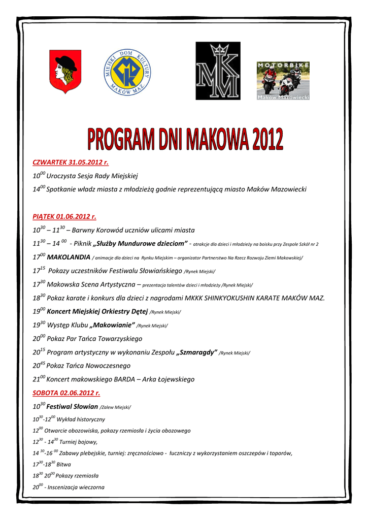 CZWARTEK 31.05.2012 r. 1000 Uroczysta Sesja Rady Miejskiej 1400 Spotkanie władz miasta z młodzieżą godnie reprezentującą miasto Maków Mazowiecki PIĄTEK 01.06.2012 r. 1030 – 1130 – Barwny Korowód uczniów ulicami miasta 1130 – 14 00 - Piknik „Służby Mundurowe dzieciom” - atrakcje dla dzieci i młodzieży na boisku przy Zespole Szkół nr 2 1700 MAKOLANDIA / animacje dla dzieci na Rynku Miejskim – organizator Partnerstwo Na Rzecz Rozwoju Ziemi Makowskiej/ 1715 Pokazy uczestników Festiwalu Słowiańskiego /Rynek Miejski/ 1730 Makowska Scena Artystyczna – prezentacja talentów dzieci i młodzieży /Rynek Miejski/ 1830 Pokaz karate i konkurs dla dzieci z nagrodami MKKK SHINKYOKUSHIN KARATE MAKÓW MAZ. 1900 Koncert Miejskiej Orkiestry Dętej /Rynek Miejski/ 1930 Występ Klubu „Makowianie” /Rynek Miejski/ 2000 Pokaz Par Tańca Towarzyskiego 2015 Program artystyczny w wykonaniu Zespołu „Szmaragdy” /Rynek Miejski/ 2045 Pokaz Tańca Nowoczesnego 2100 Koncert makowskiego BARDA – Arka Łojewskiego SOBOTA 02.06.2012 r. 1030 Festiwal Słowian /Zalew Miejski/ 30 00 10 -12 Wykład historyczny 00 12 Otwarcie obozowiska, pokazy rzemiosła i życia obozowego 30 30 12 - 14 Turniej bojowy, 30 14 -16 00 30 30 30 00 Zabawy plebejskie, turniej: zręcznościowo - łuczniczy z wykorzystaniem oszczepów i toporów, 17 -18 Bitwa 18 20 Pokazy rzemiosła 00 20 - Inscenizacja wieczorna 13 00 I Zlot Motocyklowy (1200 zbiórka na stacji paliw BP, formowanie parady, runda honorowa ulicami miasta na Stadion Miejski, powitanie uczestników) 1300 „Warto umieć pomóc w potrzebie drugiemu człowiekowi” pokaz udzielania pierwszej pomocy przedmedycznej 1400 Prezentacja motocykli /konkursy z nagrodami/ 1500 Pokaz Akrobacji Motocyklowych STUNT 19 00 Występ Zespołu AVOCADO – /Stadion Miejski/ 21 00 Występ Gwiazdy Wieczoru – VOLVER /Stadion Miejski/ 22 30 Zabawa taneczna – /Stadion Miejski/ NIEDZIELA 03.06.2012 r. 8 00 Zawody Wędkarskie /Zalew/ 900 Turniej Dzikich Drużyn w Piłce Nożnej /Stadion Miejski/ Imprezy Towarzyszące: - Wystawa regionalisty Wiesława Łaskarzewskiego - Festiwal Książki Multikulturowej / Miejski Dom Kultury – 31.05.2012 r./ - Wesołe Miasteczko
