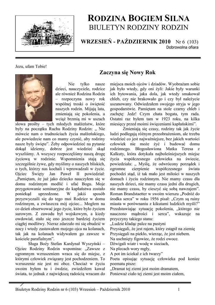 RODZINA BOGIEM SILNA BIULETYN RODZINY RODZIN WRZESIEŃ - PAŹDZIERNIK 2010 Nr 6 (103) Dobrowolna ofiara Jezu, ufam Tobie! Zaczyna się Nowy Rok Nie tylko nasze dzieci, nauczyciele, rodzice ale równieŜ Rodzina Rodzin – rozpoczyna nowy rok wspólnej troski o świętość naszych rodzin. Mijają lata, zmieniają się pokolenia, a wciąŜ brzmią mi w uszach słowa prośby – tych młodych małŜeństw, które były na początku Ruchu Rodziny Rodzin: „ Nie mówcie nam o trudnościach Ŝycia małŜeńskiego, ale powiedzcie nam co mamy czynić, aby rodziny nasze były święte”. śeby odpowiedzieć na pytanie dokąd idziemy, dobrze jest wiedzieć skąd wyszliśmy. A wszyscy rozpoczęliśmy naszą drogę Ŝyciową w rodzinie. Wspomnienia stają się szczególnie Ŝywe, gdy myślimy o naszych bliskich, o tych, którzy nas kochali i wprowadzali w Ŝycie. Ojciec Święty Jan Paweł II powiedział: „Pamiętam, Ŝe juŜ jako dziecko nauczyłem się w domu rodzinnym modlić i ufać Bogu. Moje przygotowanie seminaryjne do kapłaństwa zostało uprzedzone. W jakiś sposób poniekąd przyzwyczaili się do tego moi Rodzice w domu rodzinnym, a zwłaszcza mój ojciec... Mogłem na co dzień obserwować jego Ŝycie, które było Ŝyciem surowym. Z zawodu był wojskowym, a kiedy owdowiał, stało się ono jeszcze bardziej Ŝyciem ciągłej modlitwy. Nieraz zdarzało mi się obudzić w nocy i wtedy zastawałem mojego ojca na kolanach, tak jak na kolanach widywałem go zawsze w kościele parafialnym”. Sługa BoŜy Stefan Kardynał Wyszyński – Ojciec Rodziny Rodzin wspomina: „Zawsze z ogromnym wzruszeniem wraca się do miejsc, z którymi człowiek związany jest pochodzeniem. To wzruszenie nie jest mi obce. ChociaŜ w Ŝyciu swoim byłem tu i ówdzie, zwiedziłem kawał świata, to jednak z największą radością wracam do miejsca moich ojców i dziadów. WyobraŜam sobie jak było wtedy, gdy oni Ŝyli: Jakie były warunki ich bytowania, jaka dola, jak wtedy smakował chleb, czy nie brakowało go i czy był naleŜycie uszanowany. Odwiedzałem swojego stryja w jego gospodarstwie. Pamiętam na stole czarny chleb i zachętę: Jedz! Czym chata bogata, tym rada. Ostatni raz byłem tam w 1923 roku, na kilka miesięcy przed moimi święceniami kapłańskimi”. Zmieniają się czasy, rodziny tak jak Ŝycie ludzi podlegają róŜnym przeobraŜeniom, ale trzeba wiedzieć co jest najwaŜniejsze, bez jakich wartości człowiek nie moŜe Ŝyć i budować domu rodzinnego. Błogosławiona Matka Teresa z Kalkuty, która dotykała najboleśniejszych miejsc Ŝycia współczesnego człowieka na świecie, powiedziała: „ Myślę, Ŝe odwrócony porządek i ogromne cierpienie współczesnego świata pochodzi stąd, iŜ tak mało jest miłości w naszych domach i Ŝyciu rodzinnym. Nie mamy czasu dla naszych dzieci, nie mamy czasu jedni dla drugich, nie mamy czasu, by cieszyć się sobą nawzajem”. Roman Brandstaetter w swoim wierszu „PodróŜ do środka serca” w roku 1956 pisał: „Czym są ruiny miasta w porównaniu z kikutami ludzkich myśli?” Przedstawiając sytuację pokolenia, „którego nie nauczono mądrości i serca”, wskazuje na przyczyny takiego stanu: „Ludzie kładąc palce na pustyni Przysięgali, Ŝe jest rajem, który zstąpił na ziemię Przysięgali na piekło, wierząc, Ŝe jest niebem. Na uschnięty figowiec, Ŝe rodzi owoce. Dźwigali wiatr i wodę w sieciach, Na plecach wory mgły, A pot im ściekał z ich twarzy” Poeta opisując sytuację człowieka pod koniec poematu pisze: „Dramat tej ziemi jest moim dramatem, PoniewaŜ ciało tej ziemi jest moim ciałem, Biuletyn Rodziny Rodzin nr 6 (103) Wrzesień – Październik 2010 1 Jej oczy są moimi oczami, Jej ręce są moimi rękami. Wychodzę na skrzyŜowanie dróg, tysięcy dróg, I widzę: W samym środku mojego serca Stoi samotny człowieczek Z pustym sidłem na ptaki I nie wie Co ze sobą począć”. Jesteśmy w szczęśliwej sytuacji, jako ludzie wierzący, poniewaŜ nie jesteśmy pozostawieni samymi sobie. Do nas wszystkich Chrystus zwraca się z prośbą: „Przyjdźcie wszyscy, którzy utrudzeni i obciąŜeni jesteście, a ja was pokrzepię. Weźcie moje jarzmo na siebie i uczcie się ode Mnie, bo jestem cichy i pokorny sercem, a znajdziecie ukojenie dla dusz waszych”. Mt 11,28 Rodzina bierze początek w miłości, jaką Stwórca ogarnia stworzony świat. Jest rzeczą waŜną, aby przez cały nowy rok, tak jak czyniliśmy to wcześniej, odwoływać się do świadectw miłości i troski Kościoła o rodzinę ludzką. Rodzina jest drogą Kościoła. Kościół na tej drodze stawia drogowskazy – jakŜe często ludzie, którzy uwaŜają się za wierzących, nie umieją z nich korzystać, jak sobie nie zdają sprawy z obdarowania tą przynaleŜnością do Kościoła. Pani Wanda Półtawska – bliska współpracowniczka Ojca Świętego Jana Pawła II w sprawach rodziny – opowiedziała zdarzenie. Taksówkarz, który wiózł ją na lotnisko ni stąd, ni zowąd zaczął narzekać, Ŝe Kościół chce rządzić w Polsce. Pyta go w czym to się przejawia? – „No w tym, Ŝe się wtrąca w to, jak ludzie mają Ŝyć” . Jacy ludzie? – „No wszyscy”. A pan jest katolikiem? I zaskakująca odpowiedź: „Tak i chodzę do kościoła: księŜa mają być w kościele i do ludzi się nie wtrącać! ” Wprawdzie w naszym środowisku nie spotykamy się z taką opinią, ale problemy tzw. prywatyzacji Ŝycia religijnego, moralnego pojawiają się. W niektórych rodzinach rodzice, ale teŜ i dzieci przeŜywają róŜne bolesne doświadczenia. Nowy Rok naszej wspólnej troski, będzie wzajemną pomocą, szukaniem rozwiązań, utwierdzaniem się we wspólnej modlitwie i współpracy, aby rodziny nasze były silne Bogiem. W liście Apostolskim na nowe tysiąclecie chrześcijaństwa PapieŜ Jan Paweł II pisał: „Czynić Kościół domem i szkołą komunii: oto wielkie wyzwanie, jakie czeka nas w rozpoczynającym się tysiącl