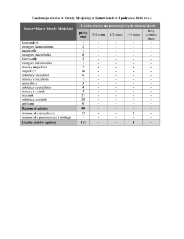 Ewidencja etatów w Straży Miejskiej w Katowicach w I półroczu 2016 roku Stanowiska w Straży Miejskiej komendant zastępca komendanta naczelnik zastępca naczelnika kierownik zastępca kierownika starszy inspektor inspektor młodszy inspektor starszy specjalista specjalista młodszy specjalista starszy strażnik strażnik młodszy strażnik aplikant Razem strażnicy stanowiska urzędnicze stanowiska pomocnicze i obsługi Liczba etatów ogółem Liczba etatów na poszczególnych stanowiskach inny pełny 3/4 etatu 1/2 etatu 1/4 etatu wymiar etat etatu 1 2 1 0 5 1 7 16 6 1 3 4 3 21 28 0 99 12 1 111 1 -