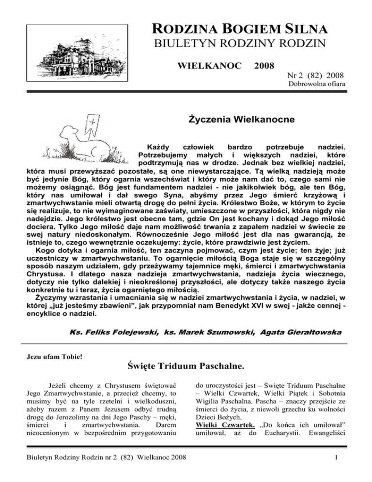 RODZINA BOGIEM SILNA BIULETYN RODZINY RODZIN WIELKANOC 2008 Nr 2 (82) 2008 Dobrowolna ofiara śyczenia Wielkanocne KaŜdy człowiek bardzo potrzebuje nadziei. Potrzebujemy małych i większych nadziei, które podtrzymują nas w drodze. Jednak bez wielkiej nadziei, która musi przewyŜszać pozostałe, są one niewystarczające. Tą wielką nadzieją moŜe być jedynie Bóg, który ogarnia wszechświat i który moŜe nam dać to, czego sami nie moŜemy osiągnąć. Bóg jest fundamentem nadziei - nie jakikolwiek bóg, ale ten Bóg, który nas umiłował i dał swego Syna, abyśmy przez Jego śmierć krzyŜową i zmartwychwstanie mieli otwartą drogę do pełni Ŝycia. Królestwo BoŜe, w którym to Ŝycie się realizuje, to nie wyimaginowane zaświaty, umieszczone w przyszłości, która nigdy nie nadejdzie. Jego królestwo jest obecne tam, gdzie On jest kochany i dokąd Jego miłość dociera. Tylko Jego miłość daje nam moŜliwość trwania z zapałem nadziei w świecie ze swej natury niedoskonałym. Równocześnie Jego miłość jest dla nas gwarancją, Ŝe istnieje to, czego wewnętrznie oczekujemy: Ŝycie, które prawdziwie jest Ŝyciem. Kogo dotyka i ogarnia miłość, ten zaczyna pojmować, czym jest Ŝycie; ten Ŝyje; juŜ uczestniczy w zmartwychwstaniu. To ogarnięcie miłością Boga staje się w szczególny sposób naszym udziałem, gdy przeŜywamy tajemnice męki, śmierci i zmartwychwstania Chrystusa. I dlatego nasza nadzieja zmartwychwstania, nadzieja Ŝycia wiecznego, dotyczy nie tylko dalekiej i nieokreślonej przyszłości, ale dotyczy takŜe naszego Ŝycia konkretnie tu i teraz, Ŝycia ogarniętego miłością. śyczymy wzrastania i umacniania się w nadziei zmartwychwstania i Ŝycia, w nadziei, w której „juŜ jesteśmy zbawieni”, jak przypomniał nam Benedykt XVI w swej - jakŜe cennej encyklice o nadziei. Ks. Feliks Folejewski, ks. Marek Szumowski, Agata Gierałtowska Jezu ufam Tobie! Święte Triduum Paschalne. JeŜeli chcemy z Chrystusem świętować Jego Zmartwychwstanie, a przecieŜ chcemy, to musimy być na tyle rzetelni i wielkoduszni, aŜeby razem z Panem Jezusem odbyć trudną drogę do Jerozolimy na dni Jego Paschy – męki, śmierci i zmartwychwstania. Darem nieocenionym w bezpośrednim przygotowaniu Biuletyn Rodziny Rodzin nr 2 (82) Wielkanoc 2008 do uroczystości jest – Święte Triduum Paschalne – Wielki Czwartek, Wielki Piątek i Sobotnia Wigilia Paschalna. Pascha – znaczy przejście ze śmierci do Ŝycia, z niewoli grzechu ku wolności Dzieci BoŜych. Wielki Czwartek. „Do końca ich umiłował” umiłował, aŜ do Eucharystii. Ewangeliści 1 opisując wydarzenia z ostatniej Wieczerzy, podkreślają całkowitą ofiarę Jezusa złoŜoną z miłości, która dokona się na KrzyŜu. Ta miłość objawia się w sposób bardzo konkretny – Jezus umywa nogi Apostołom. Mówi, Ŝe miłość to słuŜba, to pochylenie się ku człowiekowi aŜ do jego nóg. Uczymy się od Jezusa, który mówi „Dałem wam bowiem przykład…” Uczymy się wchodzić w tę miłość na co dzień. Znak umywacie nóg ma przypominać nam, Ŝe to konkretne przykazanie miłości – jak wszystkie inne – winno być praktykowane w codzienności. Miłość, której uczymy się od Chrystusa, jest najpiękniejszym darem, którym dzielimy się z naszymi najbliŜszymi jak kromką chleba. W Wielki Czwartek świętujemy ten pierwszy moment, kiedy Pan wziął wino i przemienił je w swoją Krew. Pan Jezus ustanowił Eucharystyczną Ofiarę Ciała i Krwi swojej, aby w niej na całe wieki, utrwalić Ofiarę KrzyŜa. Powierzył ten Dar nad Darami Kościołowi – a więc wspólnocie ludzi, którzy uwierzyli Jemu. Powierzył Dar swej Męki i Zmartwychwstania – tym, którzy tę obecność będą kontynuowali: są nimi Apostołowie i ich następcy Biskupi, Kapłani. Potwierdza się prawda, „Ŝe najpiękniejszym Darem Miłości jest Obecność” – obecność Boga w Ŝyciu człowieka. Eucharystia jest „źródłem i zarazem szczytem całego Ŝycia chrześcijańskiego”. Mam prawo wszystkie moje sprawy uwaŜać w jakiś sposób za Jego. Mój chleb jest owocem mojej pracy i Jego błogosławieństwa. Słuchając BoŜego Słowa, przyjmując Komunię Świętą – trwając we wspólnocie na modlitwie – poddaję całe swoje Ŝycie przemieniającej miłości Chrystusa, uczę się być na co dzień Człowiekiem eucharystycznym. Darem dla domowników wspólnej wiary i tych wszystkich do których Bóg mnie prowadzi, którzy przychodzą do mnie. Święty Brat Albert klęcząc niekiedy godzinami przed Najświętszym Sakramentem powiedział: „muszę być dobry jak chleb”. Nie moŜna oddzielić udziału przy stole Pana od obowiązku miłości bliźniego. W ten niepowtarzalny wieczór z wiarą gromadzimy się wokół ołtarza, zjednoczeni z całym Kościołem dziękujemy za Eucharystię i kapłaństwo, pełni ufności zobowiązujemy się Ŝyć na co dzień obecnością Boga. Wielki Piątek. Gromadzimy się przy KrzyŜu. Myślą i sercem towarzyszymy Chrystusowi, który taką drogę wybrał, aby uratować człowieka. Wsłuchując się w opis Męki Pana Biuletyn Rodziny Rodzin nr 2 (82) Wielkanoc 2008 naszego wierzymy, Ŝe Jego KrzyŜ nie jest oznaką zwycięstwa ciemności, ale ostatecznym nad nią zwycięstwem. Nienawiść świata, grzech skazały Jezusa na śmierć krzyŜową, ale Bóg z wysoka objawił swoją bezgraniczną miłość. Na Kalwarii w niebo wznoszą się trzy krzyŜe, pod krzyŜem Chrystusa – jakby dwa jego ramiona – stoją Maryja i uczeń Jan. PrzeraŜającą ciszę ogromnego cierpienia rozdziera wołanie: „Pragnę” – wielkie pragnienie Jezusa – aby ta ofiara została przyjęta przez kaŜdego człowieka. W Jego Męce i Śmierci jest nowe Ŝycie człowieka. Rozkładając swoje ręce na krzyŜu, Chrystus napełnił cały świat miłością Ojca bogatego w miłosierdzie. Rozpięty na drzewie krzyŜa Jezus woła: „Wspomnijcie na mękę Moją i jeŜeli nie uw