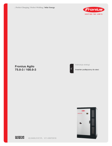 / Perfect Charging / Perfect Welding / Solar Energy 42,0426,0127,PL 011-05072016 Instrukcja obsługi PL Fronius Agilo 75.0-3 / 100.0-3 Inwerter podłączony do sieci 2 PL Szanowny użytkowniku! Wprowadzenie Dziękujemy za obdarzenie nas zaufaniem oraz gratulujemy wyboru produktu firmy Fronius o wysokiej jakości technicznej. Niniejsza instrukcja obsługi pomoże Państwu się z nim zaznajomić. Czytając uważnie instrukcję, poznają Państwo szeroki zakres zastosowań niniejszego produktu firmy Fronius. Tylko w ten sposób mogą Państwo najlepiej wykorzystać zalety produktu. Prosimy również o przestrzeganie instrukcji bezpieczeństwa, by zapewnić większe bezpieczeństwo w miejscu użytkowania produktu. Uważne obchodzenie się z produktem pomaga utrzymać jego trwałość i niezawodność. Są to niezbędne warunki osiągania należytych rezultatów jego użycia. 3 4 PL Spis treści Przepisy bezpieczeństwa........................................................................................................................... Objaśnienie do wskazówek bezpieczeństwa ........................................................................................ Informacje ogólne ................................................................................................................................. Użytkowanie zgodne z przeznaczeniem............................................................................................... Warunki otoczenia ................................................................................................................................ Wykwalifikowany personel .................................................................................................................... Środki bezpieczeństwa w miejscu ustawienia ...................................................................................... Dane dotyczące poziomu emisji hałasu................................................................................................ Klasyfikacja kompatybilności elektromagnetycznej urządzeń (EMC) ................................................... Środki zapobiegające zakłóceniom elektromagnetycznym................................................................... Przyłącze sieciowe................................................................................................................................ Instalacje elektryczne............................................................................................................................ Działania chroniące przed skutkami wyładowań elektrostatycznych .................................................... Środki bezpieczeństwa w normalnym trybie pracy ............................................................................... Znak bezpieczeństwa ........................................................................................................................... Utylizacja............................................................................................................................................... Bezpieczeństwo danych ....................................................................................................................... Prawa autorskie .................................................................................................................................... Informacje ogólne Ochrona osób i urządzeń........................................................................................................................... Bezpieczeństwo .................................................................................................................................... Ochrona osób i urządzeń...................................................................................................................... Izolacja galwaniczna ............................................................................................................................. Monitorowanie sieci .............................................................................................................................. Ostrzeżenia na urządzeniu ................................................................................................................... Użytkowanie zgodne z przeznaczeniem .................................................................................................... Użytkowanie zgodne z przeznaczeniem............................................................................................... Zastosowanie ....................................................................................................................................... Postanowienia dotyczące instalacji fotowoltaicznej .............................................................................. Zasada działania........................................................................................................................................ Zasada działania................................................................................................................................... Chłodzenie falownika przez wymuszony obieg powietrza .................................................................... Redukcja wartości znamionowej mocy ................................................................................................. Uziemienie modułu solarnego............................................................................................................... Falownik w systemie fotowoltaicznym ....................................................................................................... Informacje ogólne ................................................................................................................................. Zadania ................................................................................................................................................. Przek
