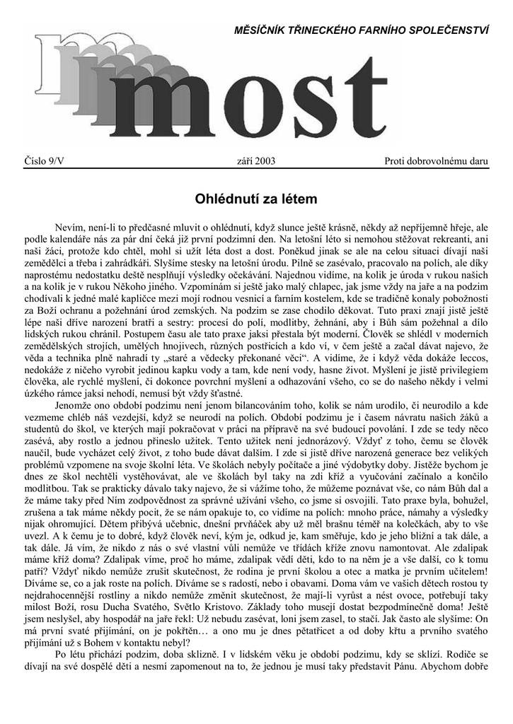 MĚSÍČNÍK TŘINECKÉHO FARNÍHO SPOLEČENSTVÍ Číslo 9/V září 2003 Proti dobrovolnému daru Ohlédnutí za létem Nevím, není-li to předčasné mluvit o ohlédnutí, když slunce ještě krásně, někdy až nepříjemně hřeje, ale podle kalendáře nás za pár dní čeká již první podzimní den. Na letošní léto si nemohou stěžovat rekreanti, ani naši žáci, protože kdo chtěl, mohl si užít léta dost a dost. Poněkud jinak se ale na celou situaci dívají naši zemědělci a třeba i zahrádkáři. Slyšíme stesky na letošní úrodu. Pilně se zasévalo, pracovalo na polích, ale díky naprostému nedostatku deště nesplňují výsledky očekávání. Najednou vidíme, na kolik je úroda v rukou našich a na kolik je v rukou Někoho jiného. Vzpomínám si ještě jako malý chlapec, jak jsme vždy na jaře a na podzim chodívali k jedné malé kapličce mezi mojí rodnou vesnicí a farním kostelem, kde se tradičně konaly pobožnosti za Boží ochranu a požehnání úrod zemských. Na podzim se zase chodilo děkovat. Tuto praxi znají jistě ještě lépe naši dříve narození bratři a sestry: procesí do polí, modlitby, žehnání, aby i Bůh sám požehnal a dílo lidských rukou chránil. Postupem času ale tato praxe jaksi přestala být moderní. Člověk se shlédl v moderních zemědělských strojích, umělých hnojivech, různých postřicích a kdo ví, v čem ještě a začal dávat najevo, že věda a technika plně nahradí ty „staré a vědecky překonané věci“. A vidíme, že i když věda dokáže leccos, nedokáže z ničeho vyrobit jedinou kapku vody a tam, kde není vody, hasne život. Myšlení je jistě privilegiem člověka, ale rychlé myšlení, či dokonce povrchní myšlení a odhazování všeho, co se do našeho někdy i velmi úzkého rámce jaksi nehodí, nemusí být vždy šťastné. Jenomže ono období podzimu není jenom bilancováním toho, kolik se nám urodilo, či neurodilo a kde vezmeme chléb náš vezdejší, když se neurodí na polích. Období podzimu je i časem návratu našich žáků a studentů do škol, ve kterých mají pokračovat v práci na přípravě na své budoucí povolání. I zde se tedy něco zasévá, aby rostlo a jednou přineslo užitek. Tento užitek není jednorázový. Vždyť z toho, čemu se člověk naučil, bude vycházet celý život, z toho bude dávat dalším. I zde si jistě dříve narozená generace bez velikých problémů vzpomene na svoje školní léta. Ve školách nebyly počítače a jiné výdobytky doby. Jistěže bychom je dnes ze škol nechtěli vystěhovávat, ale ve školách byl taky na zdi kříž a vyučování začínalo a končilo modlitbou. Tak se prakticky dávalo taky najevo, že si vážíme toho, že můžeme poznávat vše, co nám Bůh dal a že máme taky před Ním zodpovědnost za správné užívání všeho, co jsme si osvojili. Tato praxe byla, bohužel, zrušena a tak máme někdy pocit, že se nám opakuje to, co vidíme na polích: mnoho práce, námahy a výsledky nijak ohromující. Dětem přibývá učebnic, dnešní prvňáček aby už měl brašnu téměř na kolečkách, aby to vše uvezl. A k čemu je to dobré, když člověk neví, kým je, odkud je, kam směřuje, kdo je jeho bližní a tak dále, a tak dále. Já vím, že nikdo z nás o své vlastní vůli nemůže ve třídách kříže znovu namontovat. Ale zdalipak máme kříž doma? Zdalipak víme, proč ho máme, zdalipak vědí děti, kdo to na něm je a vše další, co k tomu patří? Vždyť nikdo nemůže zrušit skutečnost, že rodina je první školou a otec a matka je prvním učitelem! Díváme se, co a jak roste na polích. Díváme se s radostí, nebo i obavami. Doma vám ve vašich dětech rostou ty nejdrahocennější rostliny a nikdo nemůže změnit skutečnost, že mají-li vyrůst a nést ovoce, potřebují taky milost Boží, rosu Ducha Svatého, Světlo Kristovo. Základy toho musejí dostat bezpodmínečně doma! Ještě jsem neslyšel, aby hospodář na jaře řekl: Už nebudu zasévat, loni jsem zasel, to stačí. Jak často ale slyšíme: On má první svaté přijímání, on je pokřtěn… a ono mu je dnes pětatřicet a od doby křtu a prvního svatého přijímání už s Bohem v kontaktu nebyl? Po létu přichází podzim, doba sklizně. I v lidském věku je období podzimu, kdy se sklízí. Rodiče se dívají na své dospělé děti a nesmí zapomenout na to, že jednou je musí taky představit Pánu. Abychom dobře rozuměli: je sklizeň: čas, kdy si Pán volá i mně a zajisté se ptá: Kde je to, co jsem ti před lety svěřil? Bylo by asi optimální, kdyby Pán žní tuto otázku nemusel položit, kdyby mohl říci hned na uvítanou: Mám radost ze tvých dětí, líbí se mi jejich duše, rád v nich bydlím. I já jako kněz s tím počítám: nejsem sice ženatý, nemám své biologické děti, ale rád bych, - a jistě nejen já, ale každý kněz slyšel na uvítanou: „Mám radost z těch, které jsem ti svěřil, které jsi křtil, oddával, pohřbíval, učil náboženství… Já je dobře znám, jsou mým chrámem, jsou zralým klasem… pojď služebníku dobrý a věrný…“ Nezapomínejme na to zvláště když nám Pán dává prožít zase nový kalendářní konec léta a podzim, čas sklizně. P. František Pielgrzymka do Medjugorja Orędzie z 25 lipca 2003 roku „Drogie dzieci! Dziś również wzywam was do modlitwy. Kochane dzieci, módlcie się dopóty, dopóki modlitwa nie stanie się dla was radością. Tylko w taki sposób każdy z was odkryje w sercu pokój a dusza uzyska zadowolenie. Będziecie odczuwać wobec innych potrzebę świadczenia o miłości, którą odczuwacie w waszym sercu i w życiu. Jestem z wami i oręduję przed Bogiem za wami wszystkimi. Dziękuję, że odpowiedzieliście na moje wezwanie.” Medjugorje jest wyjątkowym miejscem, do którego zdążają pielgrzymki z całego ś