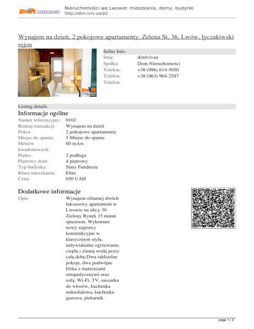 Nieruchomości we Lwowie: mieszkania, domy, budynki http://dim.lviv.ua/pl/ Wynajem na dzień, 2 pokojowe apartamenty, Zelena St, 36, Lwów, łyczakiwski rejon Seller Info Imię: Spółka: Telefon: Telefon: Telefon: dimlvivua Dom Nieruchomości +38 (096) 614-5050 +38 (063) 964-2587 Listing details Informacje ogólne Numer referencyjny: Rodzaj transakcji: Pokoi: Miejsc do spania: Metrów kwadratowych: Piętro: Piętrowy dom: Typ budynku: Klasa mieszkania: Cena: 0102 Wynajem na dzień 2 pokojowe apartamenty 5 Miejsc do spania 60 m.kw. 2 podłoga 4 piętrowy Stary Funduszu Elita 650 UAH Dodatkowe informacje Opis: Wynajem elitarnej dwóch luksusowy apartament w Lwowie na ulicy 36 Zielony Rynek 15 minut spacerem. Wykonane nowy naprawy konstrukcyjne w klasycznym stylu, indywidualne ogrzewanie, ciepłą i zimną wodą przez całą dobę.Dwa oddzielne pokoje, dwa podwójne łóżka z materacami ortopedycznymi oraz sofą, Wi-Fi, TV, suszarka do włosów, kuchenka mikrofalowa, kuchenka gazowa, piekarnik page 1 / 2 Nieruchomości we Lwowie: mieszkania, domy, budynki http://dim.lviv.ua/pl/ elektryczny, lodówka, żelazko, naczynia. Mieszkanie ma wszystko co potrzeba do relaksu i komfortu. Liczba miejsc 5 (2 + 2 + 1). Квартири Львів подобово без посередників Lokalizacja Kraj: Obwód: Miasto: Rejon: Ulice: Numer domu: Ukraina Obwód Lwowski Lwów łyczakiwski rejon Zelena St 36 page 2 / 2 Powered by TCPDF (www.tcpdf.org)