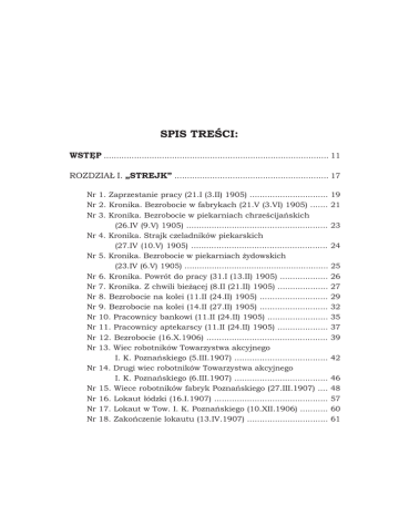 SPIS TREŚCI: WSTĘP ......................................................................................... 11 ROZDZIAŁ I. „STREJK” ............................................................. 17 Nr 1. Zaprzestanie pracy (21.I (3.II) 1905) ............................... Nr 2. Kronika. Bezrobocie w fabrykach (21.V (3.VI) 1905) ....... Nr 3. Kronika. Bezrobocie w piekarniach chrześcijańskich (26.IV (9.V) 1905) ........................................................ Nr 4. Kronika. Strajk czeladników piekarskich (27.IV (10.V) 1905) ...................................................... Nr 5. Kronika. Bezrobocie w piekarniach żydowskich (23.IV (6.V) 1905) .......................................................... Nr 6. Kronika. Powrót do pracy (31.I (13.II) 1905) ................... Nr 7. Kronika. Z chwili bieżącej (8.II (21.II) 1905) .................... Nr 8. Bezrobocie na kolei (11.II (24.II) 1905) ........................... Nr 9. Bezrobocie na kolei (14.II (27.II) 1905) ........................... Nr 10. Pracownicy bankowi (11.II (24.II) 1905) ........................ Nr 11. Pracownicy aptekarscy (11.II (24.II) 1905) .................... Nr 12. Bezrobocie (16.X.1906) ................................................ Nr 13. Wiec robotników Towarzystwa akcyjnego I. K. Poznańskiego (5.III.1907) ..................................... Nr 14. Drugi wiec robotników Towarzystwa akcyjnego I. K. Poznańskiego (6.III.1907) ..................................... Nr 15. Wiece robotników fabryk Poznańskiego (27.III.1907) .... Nr 16. Lokaut łódzki (16.I.1907) ............................................. Nr 17. Lokaut w Tow. I. K. Poznańskiego (10.XII.1906) ........... Nr 18. Zakończenie lokautu (13.IV.1907) ................................ 19 21 23 24 25 26 27 29 32 35 37 39 42 46 48 57 60 61 6 „Wolność czy zbrodnia?”. Rewolucja 1905-1907 ROZDZIAŁ II. „STAN WZMOCNIONEJ OCHRONY” ................ 63 Nr 19. W sprawie bezrobocia (27.I (9.II) 1905) ......................... 65 Nr 20. Od piotrkowskiego gubernatora. (21.I (3.II) 1905) ......... 67 Nr 21. Uchwała fabrykantów łódzkich (26.I (8.II) 1905) ........... 69 Nr 22. Narady fabrykantów (29.I (11.II) 1905) ......................... 70 Nr 23. Kronika. Wizyta gubernatora (7.I (20.I) 1905) ............... 73 Nr 24. Kronika. Wizyta gubernatora (8.I (21.I) 1905) ................. 74 Nr 25. Obowiązkowe postanowienie w rozwinięciu Najwyżej ogłoszonego stanu wojennego (15.VI (28.VI) 1905) ....... 76 Nr 26. Ważna uchwała fabrykantów (8.VI.1906) ...................... 77 Nr 27. Wywiad. U M. Poznańskiego (8.I.1907) ......................... 78 ROZDZIAŁ III. „PANOWIE, ŹLE SOBIE POCZYNACIE” .......... 81 3.1. MANIFESTACJE ULICZNE. POWSTANIE CZERWCOWE ... 83 Nr 28. Przebieg ostatnich zaburzeń w Łodzi przedstawia się według „Warsz. Dniew” (26.IV (9.V) 1905) ................ 83 Nr 29. Wypadki w Łodzi (11.VI (24.VI) 1905) ........................... 85 Nr 30. Echa wypadków w Łodzi (14.VI (27.VI) 1905) ................ 91 Nr 31. Lista osób (7.III (20.III) 1905) ....................................... 94 Nr 32. Krwawy tydzień (15.VI (28.VI) 1905) ............................. 102 Nr 33. Kronika. Napad na dom rozpusty (21.V (3.VI) 1905) ..... 104 Nr 34. Dzień wczorajszy (2.II.1906) ....................................... 105 3.2. WALKI BRATOBÓJCZE ................................................ 108 Nr 35. Zabójstwo robotnika (8.I.1906) ................................... 108 Nr 36. Kronika. Pogrzeb (9.I.1906) ........................................ 111 Nr 37. Nowe ofiary (21.III.1906) ............................................ 112 Nr 38. Walki bratobójcze (23.X.1906) .................................... 114 Nr 39. Wolność, czy zbrodnia? (8.XI.1906) ............................ 117 Nr 40. Walki bratobójcze (8.XI.1906) ..................................... 119 Nr 41. Czerwona sotnia (6.IV.1907) ....................................... 121 Nr 42. W sprawie obecnych walk bratobójczych (19.IV.1907) ... 125 3.3. AKCJE BOJOWE. ZAMACHY ........................................ 128 Nr 43. Kronika. Wybuch bomby (21.II (6.III) 1905) ................ 128 Nr 44. Kronika. Wybuch bomby (19.III (11.IV) 1905) ............. 129 Nr 45. Echa wybuchu bomby (21.III (3.IV) 1905) ................... 130 S pis 7 tre śc i Nr 46. Nr 47. Nr 48. Nr 49. Napad na pociąg w Rogowie. Zrabowanie miliona (9.XI.1906) ................................................................ Napad na pocztę (17.V.1907) ...................................... Krwawy odwet (18.V.1907) ......................................... Krwawy dzień (16.VIII.1906) ....................................... 133 138 140 143 3.4. ŚMIERĆ FABRYKANTA ................................................. 147 Nr 50. Zabójstwo ś. p. J. Kunitzera (2.X (19.X) 1905) ............ 147 Nr 51. Ś. P. Juliusz Kunitzer (2.X (19.X) 1905) ...................... 149 Nr 52. Kronika. Zabójstwo dyrektora D. Rosenthala (24.V.1907) ............................................................... 151 Nr 53. Zabójstwo Mieczysława Silbersteina (14.IX.1907) ....... 152 ROZDZIAŁ IV. PRZED WYBORAMI ......................................... 155 Nr 54. W przededniu samorządu miejskiego (21.IX (4.X) 1905) ....................................................... 157 Nr 55. W przededniu samorządu miejskiego. II (22.IX (5.X) 1905) ...................................................... 160 Nr 56. Gwałt (27.I.1906) ....................................................... 165 Nr 57. Przed wyborami (15.I.1906) ........................................ 167 Nr 58. Wybory (20.IV.1906) .................................................. 171 Nr 59. Wybory (3.V.1906) ..................................................... 178 Nr 60. Trzeci maj (3.V.1906) ................................................. 180 Nr 61. Interpelacja Koła Polskiego i D-ra Rząda (14.VII.1906) ... 182 Nr 62. Przed wyborami (19.