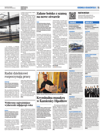 BĄDŹ NA BIEŻĄCO Zalane boisko z szansą na nowe otwarcie Tonie Zarząd Infrastruktury Sportowej rozpoczął z klubem LKS Tonianka rozmowy w sprawie umowy dzierżawy boiska, które od lat jest zalewane. Wszystko przez żeremia bobrów na potoku Sudoł. Istniejący od ponad 80 lat, jedyny w okolicy klub piłkarski, w ostatnich miesiącach był zmuszony zawiesić swoją działalność. Wszystkiemu winne są bobry, które na potoku Sudoł stale powiększają swoje żeremia i tamy. Z powodu tych ostatnich pobliskie boisko sportowe znalazło się w dużej części pod wodą, co uniemożliwiło treningi. W efekcie władze klubu zalegają z opłatami za dzierżawę boiska – nie korzystają z niego, więc nie mają pieniędzy. – Co miesiąc przychodzą kolejne polecenia zapłaty. Nie mamy możliwości ich uregulować, ponieważ z miasta nie otrzymujemy żadnej pomocy finansowej – tłumaczy Jacek Linca, wiceprezes LKS Tonianka. Zarząd Infrastruktury Sportowej, który jest właści- Zeskanuj kod QR i czytaj codziennie informacje z Twojej dzielnicy na stronie internetowej „Dziennika Polskiego” cielem boiska, wyszedł z propozycją zmiany umowy dzierżawy – z płatnej na nieodpłatne użyczenie. Rozmowy w tej sprawie mają rozpocząć się na początku stycznia. – Jeżeli jednak władze LKS Tonianka nie byłyby zainteresowane dalszym korzystaniem z tego terenu, mają prawo wystąpić o rozwiązanie umowy – wyjaśnia Jerzy Sasorski, rzecznik ZIS. Wiceprezes Tonianki nie bierze jednak pod uwagę możliwości przeprowadzki klubu. – To boisko jest częścią naszej historii i tradycji. Nie wyobrażam sobie grać w innym miejscu – podkreśla. ZIS wystąpił również do Regionalnej Dyrekcji Ochrony Środowiska z wnioskiem o odszkodowanie za zniszczenia spowodowane przez bobry. Z takiego obrotu sprawy cieszy się wiceprezes LKS Tonianka. – Ewentualne pieniądze z odszkodowania mogłyby zostać przeznaczone na rozwiązanie problemu bobrów oraz na rekultywację boiska – podkreśla Jacek Linca. PODGÓRZE O sprawach dzielnicy piszą: PAULINA SZYMCZEWSKA, tel. 12 61 99 306, i ARKADIUSZ MACIEJOWSKI, tel. 12 61 99 138 „Zawiła Cmentarz” jeżdżą bez zmian, a następnie ulicami Zawiłą i Zakopiańską do Borku Fałęckiego, gdzie wracają na swoją stałą trasę do Wieliczki. Przed dojazdem do Borku Fałęckiego nie zatrzymują się na przystanku „Góra Borkowska”. Natomiast w kierunku przeciwnym autobusy kursują bez zmian. Piotr Drabik [email protected] Nowo wybrani radni dzielnicowi po raz pierwszy w tej kadencji zgromadzą się dzisiaj na sesjach i złożą ślubowanie. We wszystkich 18 dzielnicach Krakowa pierwsze sesje rad dzielnic odbędą się w tym samym terminie: dziś o godz. 18. Porządek obrad również będzie podobny – nowo wybrani (PSZ) Wybierzmy najważniejsze wydarzenie mijającego roku Konkurs Otwarcie Kraków Areny, kanonizacja Jana Pawła II, referendum czy start budżetu obywatelskiego? Rusza konkurs na wydarzenie roku 2014. W miejskim serwisie Magiczny Kraków, czyli na stronie www.krakow.pl, rozpoczął się internetowy konkurs na „Wydarzenie 2014 roku”. Internauci mogą wybrać jedno spośród dziesięciu ważnych wydarzeń, które miały miejsce w Krakowie w mijającym roku. Są wśród nich m.in. oddane do użytku inwestycje (jak np. Kraków Arena w Czyżynach), ale nie zabrakło również ważnych tegorocznych uroczystości. W plebiscycie biorą też udział takie wydarzenia jak pierwsze referendum miejskie (miało miejsce w maju) czy budżet obywatelski. Głosować można na jedno z zaproponowanych wydarzeń. Wśród uczestników zostaną rozlosowane nagrody. (PSZ) FOT. PAWEŁ STACHNIK Radni dzielnicowi rozpoczynają pracę radni złożą ślubowanie, a następnie wybiorą przewodniczących swoich rad dzielnic. Sesje są otwarte dla mieszkańców. Każdy może przyjść i śledzić obrady, porozmawiać z radnymi o sprawach ważnych dla dzielnicy, a także zgłaszać swe uwagi, wnioski itp. Pełna lista rad dzielnic Krakowa z adresami ich siedzib jest na www.bip.krakow.pl. PODGÓRZE A Znany już wielu podgórzanom Targ Pietruszkowy, który od kilku tygodni odbywa się co sobotę (w godz. 8 – 13) w podziemiach KS Korona, bije rekordy popularności. W pomieszczeniach o powierzchni blisko 200 mkw. kupujący mieszczą się z trudem. Dlatego od najbliższego tygodnia organizatorzy zapraszają na targ także w środy, w godz. 15 – 19. Przypomnijmy, Targ Pietruszkowy to impreza, podczas której można kupić smaczne, lokalne produkty od małopolskich rolników i przetwórców. Nadkom. Dariusz Piekarski sporządził portret pamięciowy (PSZ) Kryminalna masakra w Kamienicy Hipolitów PODGÓRZE A Dom Kultury „Podgórze” przy ul. Sokolskiej 13 zaprasza dziś o godz. 19.30 na kolejne spotkanie z cyklu „Zapomniani kompozytorzy”. Gospodarzem wieczoru – poświęconego Oskarowi Kolbergowi – będzie Paweł Albiński. Wstęp wolny. Książka Czaszkę ofiary zabitej strzałem w głowę, pistolet w parasolce i portret pamięciowy można było zobaczyć w Kamienicy Hipolitów, gdzie odbyła się premiera nowego wydania książki znanego krakowskiego pisarza Mariusza Wollnego. Tym razem twórca postaci Kacpra Ryksa zaprezentował powieść sensacyjno-kryminalną pt.„ObliczePana”.Akcjarozgrywa się m.in. w Krakowie, a jednymzelementówfabułyjestcenny relikwiarz przechowywany w kościele św. Floriana. Prezentacja przebiegła pod hasłem „Masakra w Kamienicy Hipolitów”. Widzowie mogli zobaczyć makabryczne eksponaty z Muzeum Zakładu Medycyny Sądowej, wśród których była czaszka osoby zabitej strzałem w głowę i domowym sposobem wykonana broń palna, w tym pistolet w parasolce oraz składana szabla. Z kolei rysownik portretów pamięciowychnadkom.Dariusz Piekarski sporządził na miejscu (według opisu świadków) portret pamięciowy groźnego przestępcy, którego zresztą... rozpoznano wśród obecnych. (PS) O sprawach dzielnicy p