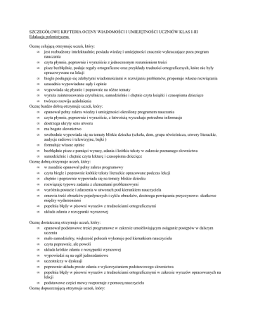 SZCZEGÓŁOWE KRYTERIA OCENY WIADOMOŚCI I UMIEJĘTNOŚCI UCZNIÓW KLAS I-III Edukacja polonistyczna Ocenę celującą otrzymuje uczeń, który: • jest rozbudzony intelektualnie; posiada wiedzę i umiejętności znacznie wykraczające poza program nauczania • czyta płynnie, poprawnie i wyraziście z jednoczesnym rozumieniem treści • pisze bezbłędnie, podaje reguły ortograficzne oraz przykłady trudności ortograficznych, które nie były opracowywane na lekcji • biegle posługuje się zdobytymi wiadomościami w rozwijaniu problemów, proponuje własne rozwiązania • uzasadnia wypowiadane sądy i opinie • wypowiada się płynnie i poprawnie na różne tematy • wyraża zainteresowania czytelnicze, samodzielnie i chętnie czyta książki i czasopisma dziecięce • twórczo rozwija uzdolnienia Ocenę bardzo dobrą otrzymuje uczeń, który: • opanował pełny zakres wiedzy i umiejętności określony programem nauczania • czyta płynnie, poprawnie i wyraziście, z łatwością wyszukuje potrzebne informacje • dostrzega ukryty sens utworu • ma bogate słownictwo • swobodnie wypowiada się na tematy bliskie dziecku (szkoła, dom, grupa rówieśnicza, utwory literackie, audycje radiowe i telewizyjne, bajki ) • formułuje własne opinie • bezbłędnie pisze z pamięci wyrazy, zdania i krótkie teksty w zakresie poznanego słownictwa • samodzielnie i chętnie czyta lekturę i czasopisma dziecięce Ocenę dobrą otrzymuje uczeń, który: • w zasadzie opanował pełny zakres programowy • czyta biegle i poprawnie krótkie teksty literackie opracowane podczas lekcji • chętnie i poprawnie wypowiada się na tematy bliskie dziecku • rozwiązuje typowe zadania z elementami problemowymi • wyróżnia postacie i zdarzenia w utworach pod kierunkiem nauczyciela • omawia treść obrazków pojedynczych i cyklu obrazków, dostrzega powiązania przyczynowo- skutkowe między wydarzeniami • popełnia błędy w pisowni wyrazów z trudnościami ortograficznymi • układa zdania z rozsypanki wyrazowej Ocenę dostateczną otrzymuje uczeń, który: • opanował podstawowe treści programowe w zakresie umożliwiającym osiąganie postępów w dalszym uczeniu • mało samodzielny, większość poleceń wykonuje pod kierunkiem nauczyciela • czyta poprawnie, ale powoli • układa krótkie zdania z rozsypanki wyrazowej • wypowiedzi są na ogół jednozdaniowe • uczestniczy w dyskusji • poprawnie układa proste zdania z wykorzystaniem podstawowego słownictwa • popełnia błędy w pisowni wyrazów z trudnościami ortograficznymi w zakresie wyrazów opracowanych na lekcji • podstawowe części mowy rozpoznaje z pomocą nauczyciela Ocenę dopuszczającą otrzymuje uczeń, który: • ma braki w opanowaniu podstawowych treści programowych, ale realizował wymagania konieczne, dające mu wiedzę i umiejętności niezbędne w dalszym kształceniu • rozumie proste zagadnienia w sposób jednoznaczny • potrafi współpracować w grupie • czyta słabo, powoli, sylabizuje • wypowiada się najczęściej pojedynczymi wyrazami lub prostymi zdaniami nie zawsze poprawnymi pod względem logicznym • nie potrafi stosować poznanych i opracowywanych w czasie lekcji zasad ortograficznych • często nie odrabia prac domowych Ocenę niedostateczną otrzymuje uczeń, który: • posiada duże braki w wiadomościach i umiejętnościach, które uniemożliwiają dalsze zdobywanie wiedzy • jest daleki od spełnienia wymagań stawianych przez program • nie potrafi rozwiązać zadań o elementarnym stopniu trudności nawet przy pomocy nauczyciela • ciągle nie przygotowuje się do lekcji • ma lekceważący stosunek do przedmiotu • nie chce korzystać z pomocy nauczyciela, kolegów • nie wykazuje żadnych postępów w nauce Edukacja przyrodnicza Ocenę celującą otrzymuje uczeń, który: • spełnia wszystkie wymagania na ocenę bardzo dobrą • potrafi kojarzyć i łączyć wiadomości z różnych dziedzin życia • twórczo i samodzielnie rozwija swoje zainteresowania • wykorzystuje zdobyte wiadomości w rozwiązywaniu problemów praktycznych • wie, gdzie znajdują się miejsca pamięci narodowej w jego najbliższej okolicy • z własnej inicjatywy przeprowadza hodowle i doświadczenia Ocenę bardzo dobrą otrzymuje uczeń, który: • opanował pełny zakres wiedzy i umiejętności określony programem nauczania • formułuje własne opinie i sądy • wyraża własny stosunek do wypowiedzi innych • podejmuje rolę lidera grupy • samodzielnie rozwiązuje zadania i problemy w sposób twórczy w sytuacjach trudnych i nietypowych • określa zjawiska towarzyszące poszczególnym porom roku • wykazuje umiejętności stosowania w praktyce poszczególnych znaków drogowych oraz zasad przechodzenia przez jezdnię Ocenę dobrą otrzymuje uczeń, który: • w zasadzie opanował materiał programowy • rozwiązuje typowe zadania z elementami problemowymi • potrafi współpracować w grupie zarówno jako lider, jak i partner, wyciągać wnioski, różnicować ważność informacji • zna swój adres zamieszkania • zna niektóre znaki drogowe • przestrzega zasad poruszania się po drogach i przechodzenia przez jezdnię • umie się odpowiednio ubrać w zależności od pory roku • wie co powinien jeść, aby być zdrowym • wie jak bezpiecznie wypoczywać w lesie, nad wodą, w górach, w mieście , na wsi • rozumie konieczność ochrony przyrody Ocenę dostateczną otrzymuje uczeń, który: • ma braki w opanowaniu podstawowych treści programowych, ale realizował wymagania konieczne, dające mu wiedzę i umiejętności niezbędne w dalszym życiu • uczestniczy w dyskusji • potrafi wypowiedzieć się na dany temat • nie zawsze odrabia pracę domową • zna pojęcia: miejscowość, miasto, wieś, dzielnica • zna nazwy pór roku • zna przydatność znaczków odblaskowych i jest w nie wyposażony • zna niektóre ptaki i ssaki hodowan
