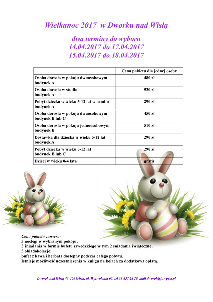Wielkanoc 2017 w Dworku nad Wisłą dwa terminy do wyboru 14.04.2017 do 17.04.2017 15.04.2017 do 18.04.2017 Cena pakietu dla jednej osoby Osoba dorosła w pokoju dwuosobowym budynek A 480 zł Osoba dorosła w studiu budynek A 520 zł Pobyt dziecka w wieku 5-12 lat w studiu budynek A 290 zł Osoba dorosła w pokoju dwuosobowym budynek B lub C 450 zł Osoba dorosła w pokoju jednoosobowym budynek B 510 zł Dostawka dla dziecka w wieku 5-12 lat budynek A 290 zł Pobyt dziecka w wieku 5-12 lat budynek B lub C 290 zł Dzieci w wieku 0-4 lata gratis Cena pakietu zawiera: 3 noclegi w wybranym pokoju; 3 śniadania w formie bufetu szwedzkiego w tym 2 śniadania świąteczne; 3 obiadokolacje; bufet z kawą i herbatą dostępny podczas całego pobytu. Istnieje możliwość uczestniczenia w kuligu na kołach za dodatkową opłatą. Dworek nad Wisłą 43-460 Wisła, ul. Wyzwolenia 65, tel 33 855 28 20, mail [email protected]