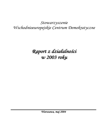 Stowarzyszenie Wschodnioeuropejskie Centrum Demokratyczne Raport z działalności w 2003 roku Warszawa, maj 2004 Wstęp Stowarzyszenie Wschodnioeuropejskie Centrum Demokratyczne wspiera środowiska obywatelskie w krajach post-sowieckich we wprowadzaniu demokratycznych zmian, w szczególności poprzez wspieranie lokalnych inicjatyw społecznych oraz niezależnych mediów. Stowarzyszenie, niezależna organizacja pozarządowa, prowadzi działalność typu non-profit od 2001 roku, kontynuując tradycje oraz korzystając w swej pracy z kilkuletniego doświadczenia i dorobku programu białoruskiego Fundacji na rzecz Demokracji w Europie Wschodniej (IDEE). Swoją uwagę skupia na sytuacji społecznej na Białorusi oraz Ukrainie i do społeczeństw tych właśnie krajów kieruje swoje programy, realizowane na poziomie lokalnym, adresowane do poszczególnych środowisk i grup. Dzięki szczegółowej wiedzy o mechanizmach działania i problemach tych grup umiejętnie dostosowuje realizowane programy do ich potrzeb oraz możliwości. W 2003 roku zespół Stowarzyszenia skoncentrował się na kontynuacji programów w dwóch istotnych dla niego obszarach - projektów skierowanych do niezależnych mediów oraz aktywizujących liderów młodzieżowych organizacji pozarządowych na Ukrainie oraz Białorusi. Ponadto Stowarzyszenie zakończyło dwuletni projekt kształcenia grupy trenerskiej dla organizacji pozarządowych na Białorusi oraz prowadziło Internetową Kampanię Informacyjną. Zespół podejmował również działania związane z koordynowaniem współpracy międzynarodowej na rzecz Białorusi oraz włączał się w przedsięwzięcia organizowane przez inne organizacje, w szczególności skupione w Grupie Zagranica. Równolegle prowadzone były prace usprawniające organizacyjną stronę Stowarzyszenia, poszukiwania współpracowników zespołu realizującego projekty oraz osób wspierających pracę organów statutowych. Poszerzono grono wolontariuszy aktywnie pracujących na rzecz Stowarzyszenia oraz podjęto próby integrowania nowo powstałego zespołu koordynatorów. Pod koniec roku minęła pierwsza kadencja władz Stowarzyszenia, wybrano Zarząd i Komisję Rewizyjną na kolejne 3 lata. Rok 2003 to również kolejny rok systematycznej pracy nad stabilizacją sytuacji finansowej Stowarzyszenia i zapewnienia jego płynnej działalności. Realizacja planowanych założeń dotyczących polityki finansowej przyniosła efekt w postaci zmniejszenia straty lat ubiegłych. 2 Programy realizowane w 2003 roku Zarząd Stowarzyszenia, zgodnie z przyjętą strategią rozwoju, za najważniejsze w 2003 roku uznał trzy kierunki rozwoju prowadzonych programów: I. projekty medialne - kontynuacja wsparcia niezależnej prasy lokalnej w Białorusi oraz uruchomienie nowego projektu dla gazet w Ukrainie. Projekty te pozwoliły nawiązać dobre kontakty z grupą trenerów Stowarzyszenia Gazet Lokalnych; II. projekt młodzieżowy dla Białorusi i Ukrainy, zakłada równoległe prowadzenie prac w obu krajach, projekt ukraiński się rozwinął, projekt białoruski wymagał istotnej zmiany koncepcji pod koniec roku. Program jest kontynuowany i ma stanowić podstawę do wypracowania dalszych działań Stowarzyszenia w obu krajach; III.współpraca z organizacjami z Litwy, Słowacji, Czech, Ukrainy i Rosji, które realizują projekty w Białorusi. Systematyczne spotkania tych organizacji i stała wymiana informacji, którą koordynuje Stowarzyszenie pozwoli lepiej zorganizować pracę w krajach sąsiadujących z Białorusią. Ponadto zakończono realizacje dwuletniego programu szkolenia trenerów dla organizacji pozarządowych w Białorusi. I. Projekty medialne Projekt wsparcia białoruskiej prasy niezależnej Celem długoletniego programu jest stworzenie i wsparcie lokalnych gazet niezależnych, ze szczególnym uwzględnieniem wschodniej części Białorusi. Dzięki przyjęciu w 2003 roku takiego systemu wsparcia prasy niezależnej, dążącego do wyrównania poziomu jej rozwoju w całej Białorusi - większość miast wschodniej Białorusi (z wyjątkiem Homla i Mohylewa) posiada już swoje gazety niezależne. W 2003 roku szczególne wsparcie otrzymały projekty dotyczące niezależnego systemu dystrybucji prasy, czasopism niezależnych, gazet nie zarejestrowanych. Na całoroczną działalność złożyły się dwa konkursy grantowe (rozdysponowano kwotę 33.500 USD na rzecz 16 podmiotów) oraz seminaria. Partnerem projektu na Białorusi była Fundacja Rozwoju Prasy Regionalnej z Mińska. Fundacja zajmowała się organizacją konsultacji dla gazet w zakresie ich planów rozwojowych oraz gromadziła zgłoszenia do konkursu grantowego. W wyniku realizacji programu finansowanie otrzymały nowopowstałe na rynku białoruskim gazety m.in. Teleskop (Mosty), Vitebskaja Trybuna (Orsha), Panorama (Novopolacak), Pinskaya Niedielya i Miascovy Czas (Pińsk). Ważnymi inwestycjami w rozwój gazet w pierwszej połowie roku były granty dla: gazety Volnoye Hlybokoye, Rehion Viesti (Svietlahorsk) oraz Rehion (Vałożyn). W drugiej połowie roku strategicznym partnerem było Wydawnictwo Mol-Press, które wydaje gazetę w Novopołocku, Homlu oraz Pińsku. Jako pilotażowe zostały wydane granty na wzmocnienie sieci dystrybucji dwóch gazet: Kurier iz Borisova, Birża informacyi. Środki te pozwolą wypracować koncepcję rozwoju niezależnej dystrybucji gazet. Gazeta lokalna jako małe przedsiębiorstwo - polskie doświadczenia dla gazet na Ukrainie W projekcie wzięli udział wydawcy i redaktorzy naczelni oraz dziennikarze 30 gazet z miast rejonowych Ukrainy Zachodniej i Wschodniej, wydawanych w obwodach połtawskim, sumskim, czernihowskim, charkowskim, czerkaskim, tarnopolskim, równieńskim żytomierskim, chmielnickim i iwanofrankiwskim.. Partnerem w Polsce było Stowarzyszenie Gazet Lokalnych, partnerami koordynującymi działania na Ukrainie są Żowta Hazeta z Połtawy i Ternopilska Hazeta z Tarnopola. Celem cyklu seminarió