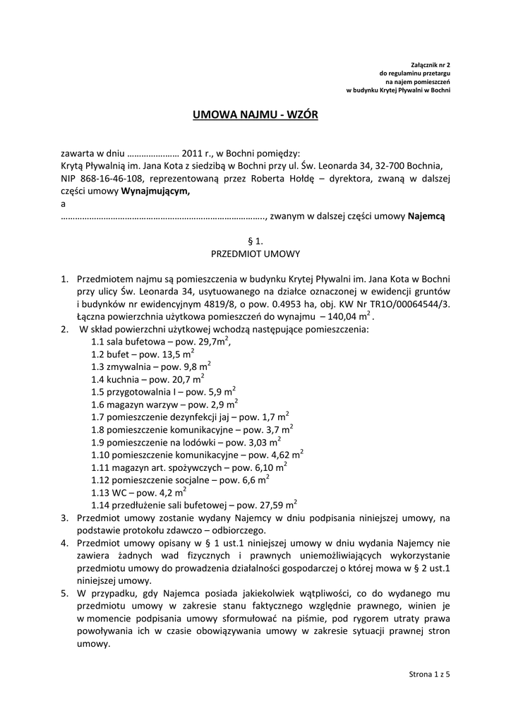 Załącznik nr 2 do regulaminu przetargu na najem pomieszczeń w budynku Krytej Pływalni w Bochni UMOWA NAJMU - WZÓR zawarta w dniu …………….…… 2011 r., w Bochni pomiędzy: Krytą Pływalnią im. Jana Kota z siedzibą w Bochni przy ul. Św. Leonarda 34, 32-700 Bochnia, NIP 868-16-46-108, reprezentowaną przez Roberta Hołdę – dyrektora, zwaną w dalszej części umowy Wynajmującym, a ………………………………………………………………………….., zwanym w dalszej części umowy Najemcą § 1. PRZEDMIOT UMOWY 1. Przedmiotem najmu są pomieszczenia w budynku Krytej Pływalni im. Jana Kota w Bochni przy ulicy Św. Leonarda 34, usytuowanego na działce oznaczonej w ewidencji gruntów i budynków nr ewidencyjnym 4819/8, o pow. 0.4953 ha, obj. KW Nr TR1O/00064544/3. Łączna powierzchnia użytkowa pomieszczeń do wynajmu – 140,04 m2 . 2. W skład powierzchni użytkowej wchodzą następujące pomieszczenia: 1.1 sala bufetowa – pow. 29,7m2, 1.2 bufet – pow. 13,5 m2 1.3 zmywalnia – pow. 9,8 m2 1.4 kuchnia – pow. 20,7 m2 1.5 przygotowalnia I – pow. 5,9 m2 1.6 magazyn warzyw – pow. 2,9 m2 1.7 pomieszczenie dezynfekcji jaj – pow. 1,7 m2 1.8 pomieszczenie komunikacyjne – pow. 3,7 m2 1.9 pomieszczenie na lodówki – pow. 3,03 m2 1.10 pomieszczenie komunikacyjne – pow. 4,62 m2 1.11 magazyn art. spożywczych – pow. 6,10 m2 1.12 pomieszczenie socjalne – pow. 6,6 m2 1.13 WC – pow. 4,2 m2 1.14 przedłużenie sali bufetowej – pow. 27,59 m2 3. Przedmiot umowy zostanie wydany Najemcy w dniu podpisania niniejszej umowy, na podstawie protokołu zdawczo – odbiorczego. 4. Przedmiot umowy opisany w § 1 ust.1 niniejszej umowy w dniu wydania Najemcy nie zawiera żadnych wad fizycznych i prawnych uniemożliwiających wykorzystanie przedmiotu umowy do prowadzenia działalności gospodarczej o której mowa w § 2 ust.1 niniejszej umowy. 5. W przypadku, gdy Najemca posiada jakiekolwiek wątpliwości, co do wydanego mu przedmiotu umowy w zakresie stanu faktycznego względnie prawnego, winien je w momencie podpisania umowy sformułować na piśmie, pod rygorem utraty prawa powoływania ich w czasie obowiązywania umowy w zakresie sytuacji prawnej stron umowy. Strona 1 z 5 §2 PRAWA I OBOWIĄZKI NAJEMCY 1. Najemca oświadcza, że w dniu wydania przedmiotu umowy przedmiot ten obejmuje w posiadanie zależne na podstawie niniejszej umowy z zamiarem wykorzystania go do prowadzenia działalności gospodarczej przedmiotem której będzie prowadzenie lokalu gastronomicznego (typu kawiarnia, bufet). 2. Najemca w celu wykorzystania przedmiotu umowy zgodnie z postanowieniami § 2 ust.1 umowy uprawniony jest do jego dostosowania do własnych potrzeb zgodnie z postanowieniami zawartymi w treści umowy. 3. Ciężar zgodności prowadzonej przy wykorzystaniu przedmiotu umowy działalności gospodarczej z porządkiem prawnym spoczywa wyłącznie na Najemcy. Obowiązek spoczywający na Najemcy dotyczy okoliczności uzyskania wszelkich pozwoleń, koncesji, zezwoleń i badań wymaganych przez powołane do tego organy zgodnie z ich kompetencjami usankcjonowanymi przez obowiązujące przepisy prawa. Czynności te podejmowane są przez Najemcę na własny koszt i ryzyko. 4. Najemca w celu realizacji postanowień § 2 ust.2 niniejszej umowy uprawniony jest do poczynienia na przedmiot umowy nakładów w celu dostosowanie go do własnych potrzeb w tym wykonania wszelkich prac adaptacyjnych za uprzednim pisemnym powiadomieniem Wynajmującego o zamiarze i zakresie ich wykonania co najmniej na 7 dni przed planowanym rozpoczęciem tych prac. 5. Wynajmującemu przysługuje prawo zgłoszenia sprzeciwu wyrażonego na piśmie przed przystąpieniem do realizacji zamierzeń Najemcy, jeśli prace te mogłyby na trwałe zmienić przedmiot umowy (przywrócenie do stanu poprzedniego związane byłoby z koniecznością przeprowadzenia prac remontowych czy też budowlanych), względnie zagrozić bezpieczeństwu jego użytkowania. 6. W sytuacji wniesienia przez Wynajmującego sprzeciwu o którym mowa w § 2 ust.5 umowy strony niniejszej umowy w drodze negocjacji z zachowaniem poszanowania interesu prawnego drugiej strony zobowiązane są do uzgodnienia zakresu i rozmiaru prac, o których mowa w § 2 ust.4 niniejszej umowy. W wypadku gdy negocjacje stron zakończą się fiaskiem strony niniejszej umowy uprawnione są do wypowiedzenia niniejszej umowy na warunkach określonych w jej postanowieniach. 7. W przypadku rozpoczęcia przez Najemcę prac o których mowa w § 2 ust.2 niniejszej umowy, bez pisemnego powiadomienia Wynajmującego oraz pomimo zgłoszonego sprzeciwu, przy braku wzajemnych ustaleń, zobowiązany jest on do zapłaty na rzecz Wynajmującego kary umownej w wysokości poniesionych nakładów wycenionych przez biegłego w zakresie stosownych uprawnień. Wynajmujący uprawniony jest do dochodzenia odszkodowania przekraczającego wysokość kary umownej oraz, niezależnie od dochodzenia powyżej opisanych roszczeń, do wypowiedzenia niniejszej umowy na warunkach określonych w jej postanowieniach. 8. Najemca bez uprzedniej pisemnej zgody Wynajmującego nie może dokonać żadnych prac remontowych oraz budowlanych. W przypadku przystąpienia przez Najemcę do tych prac Wynajmującemu przysługują uprawnienia opisane w § 2 ust.5, 6 i 7 niniejszej umowy, które to postanowienia stosuje się odpowiednio. 9. Najemca jest zobowiązany do dokonywania bieżących napraw i konserwacji przedmiotu umowy bez potrzeby powiadamiania Wynajmującego i uprzedniego wyrażenia przez niego zgody. Strona 2 z 5 10. Najemca jest zobowiązany do ubezpieczenia przedmiotu najmu na czas obowiązywania niniejszej umowy. 11. Wszelkie remonty, nakłady i inne prace określone w § 2 niniejszej umowy Najemca wykona na własny koszt i ryzyko. Po ustaniu stosunku umownego najmu Wynajmujący nie jest zobowiązany do zwrotu ich wartości. 12. Wszelkie szkody powstałe w wyniku użytkowania przedmiotu najmu Najemca 