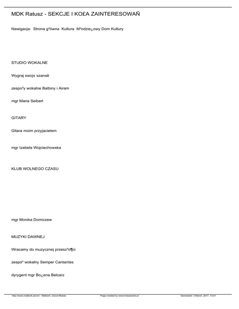 MDK Ratusz - SEKCJE I KO£A ZAINTERESOWAÑ Nawigacja: Strona g³ówna Kultura M³odzie¿owy Dom Kultury STUDIO WOKALNE Wygraj swoj± szansê zespo³y wokalne Balbiny i Airam mgr Maria Seibert GITARY Gitara moim przyjacielem mgr Izabela Wojciechowska KLUB WOLNEGO CZASU mgr Monika Domiczew MUZYKI DAWNEJ Wracamy do muzycznej przesz³o¶ci zespó³ wokalny Semper Cantantes dyrygent mgr Bo¿ena Belcarz http://www.malbork.pl/um/ - Malbork, Urz±d Miasta Page created by www.kraszewski.pl Generated: 3 March, 2017, 13:41 TANIEC NOWOCZESNY mgr Ma³gorzata Wo¼niak ZESPÓ£ INSTRUMENTALNY MUZYKI DAWNEJ mgr Marcin Skotnicki PLASTYCZNA ¦wiat naszej wyobra¼ni mgr Magdalena Krzemiñska Oller GIMNASTYKI KOREKCYJNEJ Zdrowie to skarb mgr Anna Kita CHOREOGRAFICZNA Tañczyæ ka¿dy musi zespó³ Brusztynki choreograf Celina Pacanowska JÊZYKOWE Z ka¿dym dobrze jest pogadaæ Jêzyk angielski Ma³gorzata Z³otkowska http://www.malbork.pl/um/ - Malbork, Urz±d Miasta Page created by www.kraszewski.pl Generated: 3 March, 2017, 13:41 Jêzyk niemiecki mgr Joanna Drelich TEATRALNO POETYCKA Jestem aktorem mgr Mariola Kulpa KOMPUTEROWO INTERNETOWA Ca³y ¶wiat w komputerze mgr Anna Sza³wiñska MATEMATYCZNA MIM £amig³ówki m±drej g³ówki mgr in¿. Bo¿ena Wereszczyñska HISTORII KREATYWNEJ Jestem rycerzem obyczaje i gry rycerskie, strzelanie z ³uku i kuszy, rzemios³o ¶redniowieczne. mgr Arkadiusz Dzikowski MUZEALNA KRONIKARSKO To co ju¿ minê³o mgr Monika Tyborska http://www.malbork.pl/um/ - Malbork, Urz±d Miasta Page created by www.kraszewski.pl Generated: 3 March, 2017, 13:41 MODELARSKA Model dobra rzecz mgr Andrzej Pokora GOSPODARSTWA DOMOWEGO Wiesz co jesz mgr Teresa O¶ci³owska ¦WIETLICA ARTYSTYCZNA Klub Pszczó³ki Mai Bajkolandia mgr Maria Wiatr http://www.malbork.pl/um/ - Malbork, Urz±d Miasta Page created by www.kraszewski.pl Generated: 3 March, 2017, 13:41