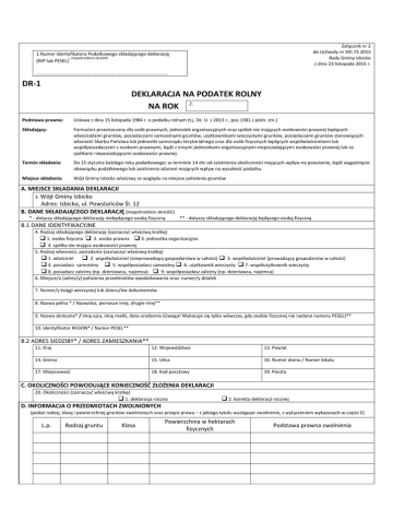 Załącznik nr 2 do Uchwały nr XIII.73.2015 Rady Gminy Izbicko z dnia 23 listopada 2015 r. 1.Numer Identyfikatora Podatkowego składającego deklarację niepotrzebne skreślić (NIP lub PESEL)* ................................................................................................... DR-1 DEKLARACJA NA PODATEK ROLNY NA ROK 2. Podstawa prawna: Ustawa z dnia 15 listopada 1984 r. o podatku rolnym (t.j. Dz. U. z 2013 r., poz.1381 z późn. zm.) Składający: Formularz przeznaczony dla osób prawnych, jednostek organizacyjnych oraz spółek nie mających osobowości prawnej będących właścicielami gruntów, posiadaczami samoistnymi gruntów, użytkownikami wieczystymi gruntów, posiadaczami gruntów stanowiących własność Skarbu Państwa lub jednostki samorządu terytorialnego oraz dla osób fizycznych będących współwłaścicielami lub współposiadaczami z osobami prawnymi, bądź z innymi jednostkami organizacyjnymi nieposiadającymi osobowości prawnej lub ze spółkami nieposiadającymi osobowości prawnej. Termin składania: Do 15 stycznia każdego roku podatkowego; w terminie 14 dni od zaistnienia okoliczności mających wpływ na powstanie, bądź wygaśnięcie obowiązku podatkowego lub zaistnienia zdarzeń mających wpływ na wysokość podatku. Miejsce składania: Wójt Gminy Izbicko właściwy ze względu na miejsce położenia gruntów A. MIEJSCE SKŁADANIA DEKLARACJI 3. Wójt Gminy Izbicko Adres: Izbicko, ul. Powstańców Śl. 12 B. DANE SKŁADAJĄCEGO DEKLARACJĘ (niepotrzebne skreślić) * - dotyczy składającego deklarację niebędącego osobą fizyczną ** - dotyczy składającego deklarację będącego osobą fizyczną B.1 DANE IDENTYFIKACYJNE 4. Rodzaj składającego deklarację (zaznaczyć właściwą kratkę) 1. osoba fizyczna 2. osoba prawna 3. jednostka organizacyjna 4. spółka nie mająca osobowości prawnej 5. Rodzaj własności, posiadania (zaznaczyć właściwą kratkę) 1. właściciel 2. współwłaściciel (nieprowadzący gospodarstwa w całości) 3. współwłaściciel (prowadzący gospodarstw w całości) 4. posiadacz samoistny 5. współposiadacz samoistny 6. użytkownik wieczysty 7. współużytkownik wieczysty 8. posiadacz zależny (np. dzierżawca, najemca) 9. współposiadasz zależny (np. dzierżawca, najemca) 6. Miejsce/a (adres/y) położenia przedmiotów opodatkowania oraz numer/y działek 7. Numer/y księgi wieczystej lub zbioru/ów dokumentów 8. Nazwa pełna * / Nazwisko, pierwsze imię, drugie imię** 9. Nazwa skrócona* / imię ojca, imię matki, data urodzenia (Uwaga! Wykazuje się tylko wówczas, gdy osobie fizycznej nie nadano numeru PESEL)** 10. Identyfikator REGON* / Numer PESEL** B.2 ADRES SIEDZIBY* / ADRES ZAMIESZKANIA** 11. Kraj 12. Województwo 13. Powiat 14. Gmina 15. Ulica 16. Numer domu / Numer lokalu 17. Miejscowość 18. Kod pocztowy 19. Poczta C. OKOLICZNOŚCI POWODUJĄCE KONIECZNOŚĆ ZŁOŻENIA DEKLARACJI 20. Okoliczności (zaznaczyć właściwą kratkę) 1. deklaracja roczna 2. korekta deklaracji rocznej D. INFORMACJA O PRZEDMIOTACH ZWOLNIONYCH (podać rodzaj, klasę i powierzchnię gruntów zwolnionych oraz przepis prawa – z jakiego tytułu występuje zwolnienie, z wyłączeniem wykazanych w części E) L.p. Rodzaj gruntu Klasa Powierzchnia w hektarach fizycznych Podstawa prawna zwolnienia E. DANE DOTYCZĄCE PRZEDMIOTÓW OPODATKOWANIA (włącznie z zwolnionymi) Grunty orne Użytki zielone (łąki, pastwiska) I II III IV V VI VIz Sady I II IIIa IIIb IVa IVb V VI VIz I II IIIa IIIb IVa IVb V VI VIz Grunty pod stawami I II IIIa IIIb IVa IVb V VI VIz Grunty rolne zabudowane Klasy użytków wynikające z ewidencji gruntów i budynków a) Zarybione łososiem, trocią, głowacicą, palią i pstrągiem; grunty rolne zabudowane (bez oznaczenia klasy) b) Zarybione innymi gatunkami ryb niż w pozycji a; grunty pod stawami niezarybionymi; grunty zadrzewione i zakrzewione na użytkach rolnych oraz grunty pod rowami (bez oznaczenia klasy) Powierzchnia w hektarach fizycznych (z dokładnością do 4 miejsc po przecinku) Niepodlegają Podlegające ce przeliczeniu przeliczeniu OGÓŁEM na hektary na ha przeliczenio przeliczenio we we 1 2 3 Liczba hektarów przeliczen iowych Stawka za 1 ha przeliczenio wego lub fizycznego) w zł, gr Wymiar podatku rolnego w zł, gr 4 5 6 Grunty zadrzewione i zakrzaczone położone na UR Rowy I II IIIa IIIb IVa IVb V VI VIz RAZEM (bez zwolnień) F. ULGI W PODATKU ROLNYM OD GRUNTÓW (do obliczenia w danym roku podatkowym) 1. z tytułu nabycia lub objęcia w zagospodarowanie gruntów 2. inwestycyjne 3. górskie 4. inne Razem G. ŁĄCZNA KWOTA PODATKU ROLNEGO 21. ŁĄCZNA KWOTA PODATKU ROLNEGO (z uwzględnienie ulg) - należy zaokrąglić do pełnych złotych H. INFORMACJA O UŻYTKACH ROLNYCH POŁOŻONYCH NA TERENIE INNYCH GMIN (MIAST) RZECZPOSPOLITEJ POLSKIEJ (podać nazwę gminy, powiat, województwo, rodzaj klasy oraz powierzchnię użytków rolnych) I. OŚWIADCZENIE I PODPIS SKŁADAJĄCEGO / OSOBY REPREZENTUJĄCEJ SKŁADAJĄCEGO Oświadczam, że podane przeze mnie dane są zgodne z prawdą. 22. Imię 24. Data wypełnienia (dzień - miesiąc - rok) 23. Nazwisko 25. Podpis (pieczęć) składającego / osoby reprezentującej składającego J. ADNOTACJE ORGANU PODATKOWEGO 26. Uwagi organu podatkowego 27. Identyfikator przyjmującego formularz 28. Data i podpis przyjmującego formularz Pouczenie: 1. Obliczony w deklaracji podatek rolny należy wpłacić bez wezwania na rachunek bankowy Urzędu Gminy, w ratach proporcjonalnych do czasu trwania obowiązku podatkowego, w terminach do: 15 marca, 15 maja, 15 września i 15 listopada roku podatkowego. 2. W przypadku, gdy kwota podatku nie przekracza 100 zł podatek jest płatny jednorazowo w terminie płatności I raty. 3. W przypadku nie wpłacenia w obowiązujących terminach i ratach kwoty podatku z poz. 21 lub wpłacenia jej w niepełnej wysokości, niniejsza deklaracja stanowi podstawę do wystawienia tytułu wykonawczego, zgodnie z przepisami us