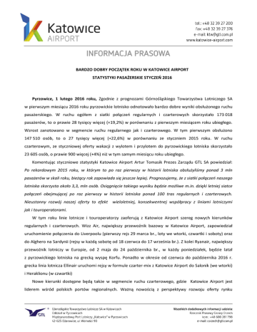 BARDZO DOBRY POCZĄTEK ROKU W KATOWICE AIRPORT STATYSTYKI PASAŻERSKIE STYCZEŃ 2016 Pyrzowice, 1 lutego 2016 roku, Zgodnie z prognozami Górnośląskiego Towarzystwa Lotniczego SA w pierwszym miesiącu 2016 roku pyrzowickie lotnisko odnotowało bardzo dobre wyniki obsłużonego ruchu pasażerskiego. W ruchu ogółem z siatki połączeń regularnych i czarterowych skorzystało 173 018 pasażerów, to o prawie 28 tysięcy więcej (+19,2%) w porównaniu z pierwszym miesiącem roku ubiegłego. Wzrost zanotowano w segmencie ruchu regularnego jak i czarterowego. W tym pierwszym obsłużono 147 510 osób, to o 27 tysięcy więcej (+22,6%) w porównaniu ze styczniem 2015 roku. W ruchu czarterowym, ze styczniowej oferty wakacji z wylotem i przylotem do pyrzowickiego lotniska skorzystało 23 605 osób, o prawie 900 więcej (+4%) niż w tym samym miesiącu roku ubiegłego. Komentując styczniowe statystyki Katowice Airport Artur Tomasik Prezes Zarządu GTL SA powiedział: Po rekordowym 2015 roku, w którym to po raz pierwszy w historii lotniska obsłużyliśmy ponad 3 mln pasażerów w skali roku, bieżący rok zapowiada się jeszcze lepiej. Prognozujemy, że z siatki połączeń naszego lotniska skorzysta około 3,3, mln osób. Osiągnięcie takiego wyniku będzie możliwe m.in. dzięki letniej siatce połączeń obejmującej po raz pierwszy w historii lotniska ponad 100 tras regularnych i czarterowych. Nieustanny rozwój naszej oferty to efekt wieloletniej, konsekwentnej współpracy z liniami lotniczymi jak i touroperatorami. W tym roku linie lotnicze i touroperatorzy zaoferują z Katowice Airport szereg nowych kierunków regularnych i czarterowych. Wizz Air, największy przewoźnik bazowy w Katowice Airport, zapowiedział uruchomienie połączenia do Liverpoolu (pierwszy rejs 29 marca br., loty we wtorki, czwartki i soboty) oraz do Alghero na Sardynii (rejsy w każdą sobotę od 18 czerwca do 17 września br.). Z kolei Ryanair, największy przewoźnik lotniczy w Europie, od 2 maja do 24 października br., w każdy poniedziałek, będzie latał z pyrzowickiego lotniska na grecką wyspę Korfu. Ponadto w okresie od czerwca do października 2016 r. grecka linia lotnicza Ellinair uruchomi rejsy w formule czarter-mix z Katowice Airport do Salonik (we wtorki) i Heraklionu (w czwartki) Nowe kierunki dostępne będą także w segmencie ruchu czarterowego, gdzie Katowice Airport jest liderem wśród polskich portów regionalnych. Ważną nowością z perspektywy rozwoju oferty rynku czarterowego w Pyrzowicach jest Dominikana oferowana przez biuro podróży TUI. Będzie to pierwsze na polskim rynku, bezpośrednie, dalekodystansowe połączenie czarterowe z portu regionalnego. Trasa z Katowice Airport do Punta Cany na Dominikanie zostanie zainaugurowana w czwartek 7 lipca 2016 roku. Połączenie realizowane będzie raz w tygodniu, do końca października, szerokokadłubowym Boeingiem 767-300 TUIFly. Samolot może wziąć na pokład, w trzech klasach, w sumie 285 pasażerów. Ponadto w segmencie ruchu czarterowego w sezonie lato 2016 pojawią się takie nowe kierunki jak Cagliari (BP Itaka), Almeria (Rainbow), Evia (Grecos) i Lesbos (Grecos). W maju 2016 roku w Katowice Airport do użytku oddany zostanie nowy terminal cargo wraz z infrastrukturą towarzyszącą, zakończony zostanie także generalny remont terminalu pasażerskiego A. Ponadto trwać będzie inwestycja związana z przekształceniem starej drogi startowej w drogę kołowania oraz dostosowanie pola manewrowego lotniska do II kategorii operacji lotniczych. Polska Agencja Żeglugi Powietrznej rozpocznie budowę nowej wieży kontroli ruchu lotniczego, a spółka Chopin Airport Development na podstawie umowy franczyzowej z Marriott International rozpocznie budowę hotelu pod marką Moxy.