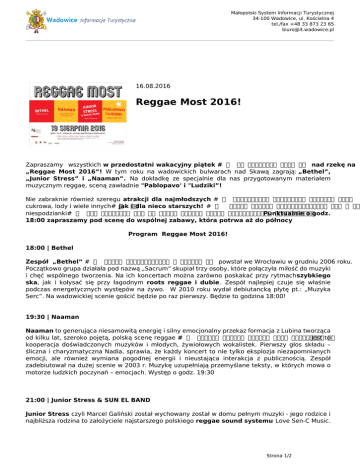 Małopolski System Informacji Turystycznej 34-100 Wadowice, ul. Kościelna 4 tel./fax +48 33 873 23 65 [email protected] 16.08.2016 Reggae Most 2016! Zapraszamy wszystkich w przedostatni wakacyjny piątek #℣佐⌡⌀㤀 猀椀攀爀瀀渀椀愀 ㈀ 㘀⌡⍃倣℣ nad rzekę na „Reggae Most 2016”! W tym roku na wadowickich bulwarach nad Skawą zagrają: „Bethel”, „Junior Stress” i „Naaman”. Na dokładkę ze specjalnie dla nas przygotowanym materiałem muzycznym reggae, sceną zawładnie "Pablopavo' i "Ludziki”! Nie zabraknie również szeregu atrakcji dla najmłodszych #℣佐⌡⌀搀洀甀挀栀愁䐀挀攀Ⰰ 愀渀椀洀愀挀樀攀Ⰰ 稀愀戀愀眀礀Ⰰ 眀愀琀a cukrowa, lody i wiele innych#℣䍐⌡⌀Ⰰ jak i dla nieco starszych! #℣佐⌡⌀ 洀⸀椀渀⸀ 稀愀戀愀眀礀 稀爁ᤀ挀稀渀漁嬀挀椀漀眀攀Ⰰ 最爀礀 椀 椀渀 niespodzianki#℣䍐⌡⌀⸀吀漀 眀猀稀礀猀琀欀漀 樀甁簀 渀愀 欀椀氀欀愀 最漀搀稀椀渀 瀀爀稀攀搀 爀漀稀瀀漀挀稁ᤀ挀椀攀洀 欀漀渀挀攀爀琀眀⸀ Punktualnie o godz. 18:00 zapraszamy pod scenę do wspólnej zabawy, która potrwa aż do północy Program Reggae Most 2016! 18:00 | Bethel Zespół „Bethel” #℣佐⌡⌀渀愀稀眀愀 稀愀挀稀攀爀瀀渀椁ᤀ琀愀 稀 䈀椀戀氀椀椀⌡⍃倣℣ powstał we Wrocławiu w grudniu 2006 roku. Początkowo grupa działała pod nazwą „Sacrum” skupiał trzy osoby, które połączyła miłość do muzyki i chęć wspólnego tworzenia. Na ich koncertach można zarówno poskakać przy rytmachszybkiego ska, jak i kołysać się przy łagodnym roots reggae i dubie. Zespół najlepiej czuje się właśnie podczas energetycznych występów na żywo. W 2010 roku wydał debiutancką płytę pt.: „Muzyka Serc”. Na wadowickiej scenie gościć będzie po raz pierwszy. Będzie to godzina 18:00! 19:30 | Naaman Naaman to generująca niesamowitą energię i silny emocjonalny przekaz formacja z Lubina tworząca od kilku lat, szeroko pojętą, polską scenę reggae #℣佐⌡⌀爀漀漀琀猀Ⰰ 洀漀搀攀爀渀 爀漀漀琀猀Ⰰ 搀甀戀Ⰰ 搀愀渀挀攀栀愀氀氀⌡⍃倣℣ . Jest to kooperacja doświadczonych muzyków i młodych, żywiołowych wokalistek. Pierwszy głos składu – śliczna i charyzmatyczna Nadia, sprawia, że każdy koncert to nie tylko eksplozja niezapomnianych emocji, ale również wymiana pogodnej energii i nieustająca interakcja z publicznością. Zespół zadebiutował na dużej scenie w 2003 r. Muzykę uzupełniają przemyślane teksty, w których mowa o motorze ludzkich poczynań – emocjach. Występ o godz. 19:30 21:00 | Junior Stress & SUN EL BAND Junior Stress czyli Marcel Galiński został wychowany został w domu pełnym muzyki - jego rodzice i najbliższa rodzina to założyciele najstarszego polskiego reggae sound systemu Love Sen-C Music. Strona 1/2 Małopolski System Informacji Turystycznej 34-100 Wadowice, ul. Kościelna 4 tel./fax +48 33 873 23 65 [email protected] Wokalista polskiej sceny reggae i dancehall pochodzi z Lublina. Pod skrzydłami krewnych i znajomych w sound systemie nabierał wiedzy o muzyce i swobody na scenie. Po kilku latach powstał pierwszy niezależny projekt Juniora Stressa, czyli Geto Blasta. Junior Stress współpracował z m.in. Eastwest Rockers, Mariką, Grubsonem, Ras Lutą, a także usłyszeć go można na ostatniej płycie Hemp Gru. 22:30 | Pablopavo i Ludziki Pablopavo, a właściwie Paweł Sołtys urodził się w 1978 roku w Warszawie. Jest on polskim wokalistą reggae i raggamuffin, jednym z pierwszych wokalistów śpiewających raggamuffin po polsku. Jego specjalnością są bardzo długie i skomplikowane partie wokalne oparte na freestyle. Karierę rozpoczął w zespole „Saduba”. Od 2002 wraz z Reggaeneratorem i Krzakiem współtworzy „Zjednoczenie Sound System”, od 2003 jest wokalistą „Vavamuffin”, prócz tego od 2006 udziela się w "Ba-Lan Soundsystem" oraz w zespole "Sedativa". Współpracował m.in. z Fu #℣佐⌡⌀伀氀猀攀渀⼀䘀甀Ⰰ 娀椀瀀攀爀愀Ⰰ 娀䤀倀 匀欁䈀愀搀⌡⍃倣 Hemp Gru, O.S.T.R., Sidneyem Polakiem, Sedativą, Dreadsquadem, Magierą, James Ashen, Habakuk, Junior Stress i Maleo Reggae Rockers. Poza śpiewem w Vavamuffin i sound - systemach Pablopavo rozpoczął karierę solową. Jego debiutancki album zatytułowany „Telehon” pojawił się 26 września 2009 nakładem wydawnictwa Karrot Kommando i jest sygnowany nazwą "Pablopavo & Ludziki". 30 marca 2011, w dzień jego trzydziestych trzecich urodzin, premierę miał drugi album Pablopavo i Ludzików, nazwany "10 piosenek". Trzecią płytę pod tytułem "Głodne kawałki" wydał 28 listopada 2011 we współpracy z producentem Praczasem. Strona 2/2 Powered by TCPDF (www.tcpdf.org)