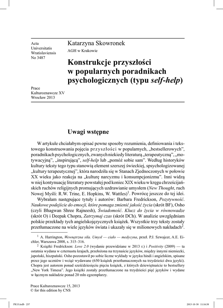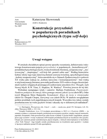 Acta Universitatis Wratislaviensis No 3487 Katarzyna Skowronek AGH w Krakowie Konstrukcje przyszłości w popularnych poradnikach psychologicznych (typu self-help) Prace Kulturoznawcze XV Wrocław 2013 Uwagi wstępne W artykule chciałabym opisać pewne sposoby rozumienia, definiowania i tekstowego konstruowania pojęcia przysz ł oś c i w popularnych, „bestsellerowych”, poradnikach psychologicznych, zwanych niekiedy literaturą „terapeutyczną”, „motywacyjną”, „inspirującą”, self-help lub „pomóż sobie sam”. Według historyków kultury teksty tego typu stanowią element szerszej świeckiej, spsychologizowanej „kultury terapeutycznej”, która narodziła się w Stanach Zjednoczonych w połowie XX wieku jako reakcja na „kulturę narcyzmu i konsumpcjonizmu”. Inni widzą w niej kontynuację literatury powstałej pod koniec XIX wieku w kręgu chrześcijańskich ruchów religijnych promujących uzdrawianie umysłem (New Thought, ruch Nowej Myśli: R.W. Trine, E. Hopkins, W. Wattles)1. Powrócę jeszcze do tej idei. Wybrałam następujące tytuły i autorów: Barbara Fredrickson, Pozytywność. Naukowe podejście do emocji, które pomaga zmienić jakość życia (skrót BF), Osho (czyli Bhagwan Shree Rajneesh), Świadomość. Klucz do życia w równowadze (skrót O) i Deepak Chopra, Zatrzymaj czas (skrót DCh). W analizie uwzględniam polskie przekłady tych angielskojęzycznych książek. Wszystkie trzy teksty zostały przetłumaczone na wiele języków świata i ukazały się w milionowych nakładach2. 1 A. Harrington, Wewnętrzna siła. Umysł — ciało — medycyna, przeł. P.J. Szwajcer, A.E. Eichler, Warszawa 2008, s. 315–316. 2 Książki Fredrickson: Love 2.0 (wydanie przewidziane w 2013 r.) i Positivity (2009) — ta ostatnia wydana w czternastu krajach, przełożona na trzynaście języków, między innymi niemiecki, japoński, hiszpański. Osho pozostawił po sobie liczne wykłady w języku hindi i angielskim, spisane przez jego uczniów i wciąż wydawane (650 książek przetłumaczonych na trzydzieści dwa języki). Chopra jest autorem ponad sześćdziesięciu pięciu książek, z których dziewiętnaście to bestsellery „New York Timesa”. Jego książki zostały przetłumaczone na trzydzieści pięć języków i wydane w łącznym nakładzie ponad 20 mln egzemplarzy. Prace Kulturoznawcze 15, 2013 © for this edition by CNS PK15.indb 257 2013-10-30 11:16:38 258 Katarzyna Skowronek Są zróżnicowane treściowo i stylistycznie, jednak wszystkie mają za cel podniesienie jakości życia potencjalnych czytelników. Wybrałam tych autorów, ponieważ pod wieloma względami są oni typowi dla tego rodzaju piśmiennictwa (można odnaleźć wiele podobnych tytułów i autorów), a jednocześnie różnią się od siebie w „powierzchownej” lekturze, między innymi genezą myśli i sposobami jej eksplikacji oraz proponowanymi metodami terapeutycznymi. Określenie „poradnik psychologiczny” jest najbardziej adekwatne w stosunku do książki Fredrickson. Trzy konstrukcje przysz ł o śc i opiszę i skontrastuję z sobą, następnie pokrótce wskażę zaplecze intelektualne ich autorów, ponieważ ono w znacznym stopniu tłumaczy różnice w sposobie rozumienia przyszłości. Wreszcie pokażę to, co je w moim przekonaniu, mimo tych widocznych różnic, łączy, co stanowi ich „wspólny mianownik”3. Artykuł jest więc studium trzech różnych przypadków, ale z próbą interpretacji i ekstrapolacji wniosków na całość tego rodzaju literatury. Interesują mnie przede wszystkim elementy treściowe, które składają się na pojęcie przyszłości w tych tekstach, sposoby jej definiowania i wartościowania. Jak sądzę, ważne jest też odniesienie do t era ź n i ej s zoś ci i p rzes zł o ś c i, ogólna koncepcja cz asu prezentowana w tych tekstach. Ponadto chciałabym ukazać, jak w wyniku doboru odpowiednich środków stylistyczno-tekstowych, pewnych mechanizmów językowych formułowany jest ten dyskurs. Jaki typ narracji mu towarzyszy. Rzecz jasna, gramatyczno-językowe mechanizmy będą mniej istotne, szczególnie że obserwacje dokonywane są w aspekcie polskiego tłumaczenia. Znacznie ważniejsze okaże się odnalezienie pewnych ogólnych mechanizmów tekstowych, dyskursywnych, które — zakładam — są wspólne zarówno angielskojęzycznym oryginałom, jak i ich polskim tłumaczeniom. Zrekonstruowanie modelu przyszłości pozwoli, mam nadzieję, zastanowić się, jaka jest funkcja takich tekstów we współczesnej kulturze. Dlaczego są dziś tak popularne? A może także pokazać pewien wspólny rys współczesnej mentalności, wrażliwości człowieka czy pewnego typu common sense współczesnej kultury. Analiza tekstowa 1) Koncepcja Fredrickson: Jeśli chcesz — zmień t eraz swoją p rzy s zł o ś ć (na lepsze) Taka lapidarna formuła może przedstawiać wizję przyszłości w opracowaniu Barbary Fredrickson, amerykańskiej psycholożki. 3 Są zresztą także pewne podobieństwa między samymi autorami: dwoje z nich to Amerykanie (Fredrickson, Chopra), trzeci długo przebywał w Ameryce, zakładając komunę w stanie Oregon w latach 80. (Osho). Dwóch (Osho, Chopra) ma indyjskie pochodzenie. Ten splot kultury zachodniej i wschodniej u tych autorów nie jest bez znaczenia. Także wzajemnie się komentują, jakby odbijają się w swoich tekstach niczym w „lustrach” — na okładce książki Osho znajduje się krótka recenzja Chopry, w książce Zatrzymaj czas są nawiązania do tekstów Osho. To jedynie powierzchowne oznaki ich głębszych związków. Prace Kulturoznawcze 15, 2013 © for this edition by CNS PK15.indb 258 2013-10-30 11:16:38 Konstrukcje przyszłości w popularnych poradnikach 259 Wśród sześciu wymienianych przez nią najistotniejszych faktów dotyczących pozytywności jeden brzmi: „Pozytywność kształtuje twoją przyszłość; pozytywność zmienia przyszłość na lepsze”4, przybierając nieki