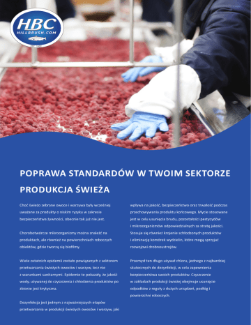 POPRAWA STANDARDÓW W TWOIM SEKTORZE PRODUKCJA ŚWIEŻA Choć świeżo zebrane owoce i warzywa były wcześniej wpływa na jakość, bezpieczeństwo oraz trwałość podczas uważane za produkty o niskim ryzyku w zakresie przechowywania produktu końcowego. Mycie stosowane bezpieczeństwa żywności, obecnie tak już nie jest. jest w celu usunięcia brudu, pozostałości pestycydów i mikroorganizmów odpowiedzialnych za stratę jakości. Chorobotwórcze mikroorganizmy można znaleźć na Stosuje się również krojenie schłodzonych produktów produktach, ale również na powierzchniach roboczych i eliminację komórek wydzielin, które mogą sprzyjać obiektów, gdzie tworzą się biofilmy. rozwojowi drobnoustrojów. Wiele ostatnich epidemii zostało powiązanych z sektorem Przemysł ten długo używał chloru, jednego z najbardziej przetwarzania świeżych owoców i warzyw, lecz nie skutecznych do dezynfekcji, w celu zapewnienia z warunkami sanitarnymi. Epidemie te pokazały, że jakość bezpieczeństwa swoich produktów. Czyszczenie wody, używanej do czyszczenia i chłodzenia produktów po w zakładach produkcji świeżej obejmuje usunięcie zbiorze jest krytyczna. odpadków z reguły z dużych urządzeń, podłóg i powierzchni roboczych. Dezynfekcja jest jednym z najważniejszych etapów przetwarzania w produkcji świeżych owoców i warzyw, jaki WYBÓR KILKU PRODUKTÓW IDEALNYCH DLA TWOJEGO SEKTORA... Szczotka do szorowania, twarda ST8 Wzmocniony, jednoczęściowy styl z polipropylenu PLH3 Zastosowanie: Średnie i duże cząstki; czyszczenie dookoła kątów; taśmy produkcyjne. Rozmiar: 152 x 60mm PP n nnn Szczotka z krótką rączką, miękka D5 Wąska szczotka, miękka B1082 Włosie falowane. Zastosowanie: Linie produkcyjne. Rozmiar: 254 x 72mm Włosie falowane. Zastosowanie: Małe cząstki; małe powierzchnie. Rozmiar: 390 x 50mm PP n nnnnn PP n nnnnn Zmiotka ręczna, miękka B861 Elastyczna plastikowa skrobaczka FLPSC3 Włosie falowane. Zastosowanie: Lekkie cząstki; linie produkcyjne. Rozmiar: 317 x 36mm Zastosowanie: Wygarnianie z misek; cięcie ciasta. Rozmiar: 90 x 200mm PP n nnnnn PP nnnn Szufelka zamknięta DP3 Elastyczna szczotka, twarda ST10 Zastosowanie: Usuwanie dużej ilości odpadów. Rozmiar: 180 x 300mm Tylko biały korpus. NIE STERYLIZOWAĆ PP nnnn PP n nnnn Ściągaczka z podwójną gumą 60 cm SQCAS6 Wieszak ścienny na sprzęt WLBR1 Odpowiednie uchwyty: ALH7, ALH8, PLH3 Zastosowanie: Intensywne użytkowanie. Rozmiar: 600mm Zastosowanie: Przechowywanie narzędzi czyszczących Salmon Hygiene Technology. Rozmiar: 206 x 75mm PP nnnn PP n nnn 28 79° 6 -18° 134°° 44 79° 6 -18° 134°° 57 79° 6 -18° 134°° 79° -18° 134°° 79° -18° 134°° Sterylizacja w autoklawie n 1 Rozmiar: 1400mm PP n nnnnn 134°° n Używaj z naszymi szczotkami i ściągaczkami. n 43 79° PBT 0.60mm -18° 134°° PBT 0.30mm 10 47 134°° PBT 0.30mm 79° -18° 25 79° -18° 79° 6 -18° n 79° -18° Odporność na temperaturę Ilość sztuk w opakowaniu – możliwość rozpakowania n PBT PBT 0.30mm 4 10 W AUTOKLAWIE. Zastosowanie: Kontenery, wiadra, orurowanie. Rozmiar: 176 x 70mm 6 Długość włosia 79° -18° 25mm PP n n Włosie poliestrowe n 6 2 PBT 0.40mm 6 TPR Ilość sztuk w opakowaniu – bez możliwości rozpakowania Korpus polipropylenowy Średnica uchwytu n TPR Guma termoplastyczna