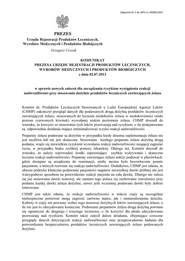 Załącznik Nr 2 do SPO nr UR/BOJ/001 Grzegorz Cessak KOMUNIKAT PREZESA URZĘDU REJESTRACJI PRODUKTÓW LECZNICZYCH, WYROBÓW MEDYCZNYCH I PRODUKTÓW BIOBÓJCZYCH z dnia 02.07.2013 w sprawie nowych zaleceń dla zarządzania ryzykiem wystąpienia reakcji nadwrażliwości przy stosowaniu dożylnie produktów leczniczych zawierających żelazo Komitet ds. Produktów Leczniczych Stosowanych u Ludzi Europejskiej Agencji Leków (CHMP) zakończył przegląd danych dla podawanych drogą dożylną produktów leczniczych zawierających żelazo, stosowanych do leczenia niedoborów żelaza w niedokrwistości (niski poziom czerwonych krwinek) wywołanej niskim poziomem żelaza. CHMP doszedł do wniosku, że korzyści ze stosowania tych leków przeważają nad ryzykiem, o ile podejmowane są odpowiednie działania mające zminimalizować ryzyko reakcji nadwrażliwości. Preparaty żelaza podawane są dożylnie w przypadku kiedy doustna suplementacja żelaza nie jest możliwa lub nie jest skuteczna. Stosowanie każdego preparatu żelaza dożylną drogą podania, wiąże się niewielkim ryzykiem wywołania reakcji nadwrażliwości mogącej zagrażać życiu, w przypadku braku szybkiej pomocy lekarskiej. Dlatego też, Komitet doszedł do wniosku, że należy wprowadzić środki zapewniające szybkie wykrywanie i skuteczne leczenie reakcji nadwrażliwości. Preparaty zawierające żelazo należy podawać w placówkach, gdzie dostępne są urządzenia do reanimacji, ażeby można było bezzwłocznie pomóc pacjentom, u których rozwinie się reakcja nadwrażliwości. Dodatkowo, CHMP jest zdania, że obecna praktyka kliniczna podawania pacjentowi najpierw niewielkiej dawki próbnej nie jest wiarygodnym sposobem na przewidzenie reakcji pacjenta na całą dawkę. Dlatego nie zaleca się już stosowania dawki testowej, ale zamiast tego poleca się zachowanie ostrożności przy podaniu każdej dawki żelaza dożylnie, nawet jeśli wcześniej podawane dawki były dobrze tolerowane. CHMP jest także zdania, że reakcje nadwrażliwości w trakcie ciąży są szczególnie niebezpieczne ponieważ mogą zagrozić zarówno matce, jak i nienarodzonemu dziecku. Kobiety w ciąży nie powinny wobec tego stosować dożylnych leków zawierających żelazo, o ile nie jest to zdecydowanie konieczne. Podawanie preparatów żelaza drogą dożylną powinno się ograniczać do drugiego i trzeciego trymestru, o ile korzyści dla płodu zdecydowanie przeważają nad ryzykiem. Komitet także zalecił dalsze działania, obejmujące coroczne przeglądy danych dotyczących reakcji nadwrażliwości oraz przeprowadzenie badania dla potwierdzenia bezpieczeństwa produktów leczniczych zawierających żelazo podawanych dożylnie. Przegląd danych dla dożylnych leków zawierających żelazo został rozpoczęty przez francuski urząd leków, Agencję ds. Bezpieczeństwa Leków i Produktów Medycznych (ANSM), po dokonaniu w roku 2010 przeglądu krajowych danych. Przegląd danych wykazał ryzyko wystąpienia ciężkich reakcji nadwrażliwości, w szczególności u kobiet w ciąży, którym podano dożylne leki zawierające żelazo. Zalecenie CHMP zostanie przekazane Komisji Europejskiej do przyjęcia w formie decyzji prawnie obowiązującej w całej UE. Informacje dla pacjentów Produkty lecznicze zawierające żelazo podawane dożylnie są cenną alternatywą w przypadkach kiedy suplementacja żelaza drogą doustną jest niemożliwa lub jest nieskuteczna. W niektórych przypadkach iniekcje mogą wywołać ciężkie reakcje nadwrażliwości. Jeśli przyjmujecie Państwo dożylne leki zawierające żelazo, lekarz będzie uważnie Państwa obserwował przynajmniej przez 30 minut od zrobienia zastrzyku. Jeśli przepisano Państwu lek zawierający żelazo do podania dożylnego, należy niezwłocznie poinformować lekarza jeżeli mieliście Państwo kiedykolwiek reakcję alergiczną na dożylne preparaty zawierające żelazo. Należy także poinformować lekarza, jeśli chorujecie Państwo na określone schorzenia mające wpływ na układ odpornościowy, w tym choroby przebiegające ze stanem zapalnym (np. reumatoidalne zapalenie stawów), chorujecie na astmę oskrzelową, egzemę lub inne choroby z nadwrażliwości, ponieważ te czynniki sprawiają, że wystąpienie reakcji alergicznej na dożylny lek zawierający żelazo jest bardziej prawdopodobne. W przypadku oznak reakcji nadwrażliwości (np. zawroty głowy, obrzęk twarzy i utrudnione oddychanie), należy bezzwłocznie poinformować lekarza lub pielęgniarkę. W przypadku pytań, należy się zwrócić do lekarza lub farmaceuty. Informacje dla przedstawicieli zawodów medycznych Wszystkie preparaty zawierające żelazo do podawania dożylnego mogą wywołać ciężkie reakcje nadwrażliwości, które mogą być śmiertelne w skutkach. Ponieważ istnieją dane sugerujące, że reakcje nadwrażliwości mogą wystąpić u pacjentów, którzy nie mieli reakcji na dawkę testową, nie jest już zalecane podawanie dawek próbnych. Zamiast tego poleca się ostrożność przy podawaniu każdej dawki żelaza dożylnie, nawet jeśli poprzednie podania leku były dobrze tolerowane. Preparaty żelaza do stosowania dożylnego powinny być podawane jedynie przez pracowników przeszkolonych pod kątem oceny i leczenia reakcji anafilaktycznych i anafilaktoidalnych oraz dysponujących urządzeniami do reanimacji. Należy dokładnie obserwować pacjentów pod kątem oznak i objawów reakcji nadwrażliwości w trakcie i przez przynajmniej 30 minut po każdej iniekcji leku zawierającego żelazo. W przypadku wystąpienia reakcji nadwrażliwości należy natychmiast zaprzestać podawania żelaza i wdrożyć odpowiednie postępowanie lecznicze. Produkty zawierające żelazo do podania dożylnego nie są wskazane dla pacjentów z nadwrażliwością na ich substancje czynne lub pomocnicze. Produkty te nie mogą być stosowane u pacjentów z ciężką nadwrażliwością na inne produkty zawierające żelazo podawane