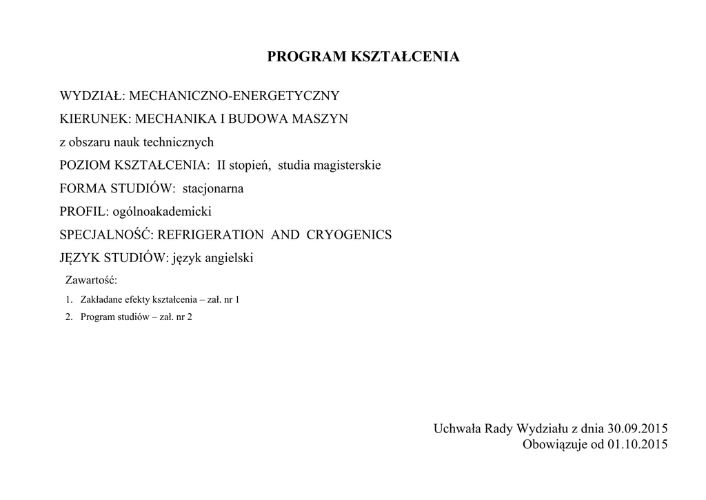 PROGRAM KSZTAŁCENIA WYDZIAŁ: MECHANICZNO-ENERGETYCZNY KIERUNEK: MECHANIKA I BUDOWA MASZYN z obszaru nauk technicznych POZIOM KSZTAŁCENIA: II stopień, studia magisterskie FORMA STUDIÓW: stacjonarna PROFIL: ogólnoakademicki SPECJALNOŚĆ: REFRIGERATION AND CRYOGENICS JĘZYK STUDIÓW: język angielski Zawartość: 1. Zakładane efekty kształcenia – zał. nr 1 2. Program studiów – zał. nr 2 Uchwała Rady Wydziału z dnia 30.09.2015 Obowiązuje od 01.10.2015 Zał. nr 2 do Programu kształcenia PROGRAM STUDIÓW 1. Opis Liczba semestrów: 3 Liczba punktów ECTS konieczna do uzyskania kwalifikacji: 90 Wymagania wstępne (w szczególności w przypadku studiów Po ukończeniu studiów absolwent uzyskuje tytuł zawodowy: magister inżynier II stopnia): kwalifikacje I stopnia oraz kompetencje do kwalifikacje II stopnia kontynuowania kształcenia na studiach II stopnia: wiedza z zakresu matematyki, fizyki i chemii, umożliwiająca zrozumienie podstaw mechaniki, materiałoznawstwa i zasad konstrukcji maszyn, wiedza z zakresu mechaniki, wytrzymałości materiałów oraz podstaw konstrukcji maszyn, umożliwiająca zrozumienie i projektowanie podstawowych elementów maszyn, umiejętność wykorzystania do formułowania i rozwiązywania zadań inżynierskich metod analitycznych, symulacyjnych i eksperymentalnych, wiedza z zakresu przepływu płynów z uwzględnieniem wszystkich procesów cieplnych, wiedza na temat zapisu konstrukcji z wykorzystaniem CAD 2D i 3D, umiejętność komunikacji w języku angielskim oraz prezentacji i dokumentacji wyników eksperymentu oraz prezentacji i dokumentacji wyników zadania o charakterze projektowym. Możliwość kontynuacji studiów: studia III stopnia doktoranckie Sylwetka absolwenta, możliwości zatrudnienia: Absolwent posiada wiedzę i umiejętności w zakresie: mechaniki, projektowania, wytwarzania i eksploatacji maszyn i systemów wytwórczych oraz technologii proekologicznych i bezpieczeństwa technicznego. Jest przygotowany do: twórczego wykorzystania metod i technologii informatycznych wspomagających projektowanie, wytwarzanie i eksploatację maszyn oraz dobór materiałów inżynierskich; kierowania i rozwijania produkcji w przedsiębiorstwach przemysłowych oraz zarządzania procesami technologicznymi; prowadzenia badań w instytutach naukowo-badawczych; zarządzania pracowniami projektowymi z zakresu konstrukcji maszyn i procesów technologicznych; prowadzenia działalności gospodarczej. Posiada niezbędną wiedzę i umiejętności w zakresie 1 projektowania, badania i eksploatacji maszyn i urządzeń generujących niskie temperatury, odpowiednio do -35 C w chłodnictwie oraz w zakresie od 120 K (-153 C) do ułamków Kelwina w kriogenice, m.in. dla potrzeb techniki, nauki i medycyny. Zna język obcy na poziomie biegłości B2+ oraz drugi język obcy na poziomie A1 lub A2 Wskazanie związku z misją Uczelni i strategią jej rozwoju: Program kształcenia zgodny jest z misją uczelni w zakresie przekazywania wiedzy i umiejętności z zachowaniem wysokiej jakości kształcenia oraz kształtowanie twórczych, krytycznych i tolerancyjnych osobowości studentów, poprzez rozwijanie i pielęgnowanie silnego poczucia wspólnoty akademickiej opartej na łączności intelektualnej i społecznej studentów i pracowników. 2. Dziedziny nauki i dyscypliny naukowe, do których odnoszą się efekty kształcenia: nauki techniczne 3. Zwięzła analiza zgodności zakładanych efektów kształcenia z potrzebami rynku pracy: Zakładane efekty kształcenia zapewniają przyrost kompetencji inżynierskich uzyskanych na I stopniu kształcenia, głównie w zakresie wiedzy i umiejętności, ze szczególnym uwzględnieniem kreatywności w rozwiązywaniu określonych problemów technicznych. Program kształcenia wyposaża więc absolwenta w atrybuty umożliwiające mu dostosowanie się do dynamicznie zmieniających się wymagań rynku pracy. 2 4. Lista modułów kształcenia: 4.1. Lista modułów obowiązkowych: 4.1.1. Lista modułów kształcenia ogólnego 4.1.1.1. Moduł Przedmioty humanistyczno-menedżerskie (min. 3 pkt. ECTS): Lp 1 Kod kursu/ grupy kursów ZMZ0135 Nazwa kursu/grupy kursów (grupę kursów oznaczyć symbolem GK) Marketing and Management Tygodniowa liczba godzin w ć l p s K2MBM_W08 K2MBM_K05 2 Razem Symbol kierunk. efektu kształcenia 2 Liczba godzin Liczba pkt. ECTS 2 zajęć 1 BK Forma kursu/ grupy kursów T ZZU CNPS łączna 30 90 3 1,5 30 90 3 1,5 Spo3 sób zaliczenia Z Kurs/grupa kursów ogólno -uczel4 niany o charakt. prakty5 cznym rodzaj KO 6 typ 7 Ob Razem dla modułów kształcenia ogólnego Łączna liczba godzin w 2 ć l p s Łączna liczba godzin ZZU Łączna liczba godzin CNPS Łączna liczba punktów ECTS Liczba punktów ECTS zajęć BK1 30 90 3 1,5 1 BK – liczba punktów ECTS przypisanych godzinom zajęć wymagających bezpośredniego kontaktu nauczycieli i studentów Tradycyjna – T, zdalna – Z 3 Egzamin – E, zaliczenie na ocenę – Z. W grupie kursów po literze E lub Z w nawiasie wpisać formę kursu końcowego (w, c, l, s, p) 4 Kurs/ grupa kursów Ogólnouczelniany – O 5 Kurs/ grupa kursów Praktyczny – P. W grupie kursów w nawiasie wpisać liczbę punktów ECTS dla kursów o charakterze praktycznym 6 KO - kształcenia ogólnego, PD – podstawowy, K – kierunkowy, S – specjalnościowy 7 W - wybieralny, Ob – obowiązkowy 2 3 4.1.2. Lista modułów z zakresu nauk podstawowych 4.1.2.1. Moduł Matematyka Lp 1 2 Kod kursu/ grupy kursów MSN0617 MSN0617 Tygodniowa liczba godzin Nazwa kursu/grupy kursów (grupę kursów oznaczyć symbolem GK) w Modelling and Optimisation Modelling and Optimisation Razem ć l p s 1 1 Symbol kierunk. efektu kształcenia K2MBM_W04 K2MBM_U03 2 2 Liczba godzin Liczba pkt. ECTS ZZU CNPS łączna 15 30 45 60 60 120 2 2 4 zajęć 1 BK 1 1,5 2,5 2 Forma kursu/ grupy kursów Spo3 sób zaliczenia T T E Z Kurs/grupa kursów ogólno -uczel4 niany o charakt. prakty5 cznym P rodzaj 6 PD PD typ 7 Ob 