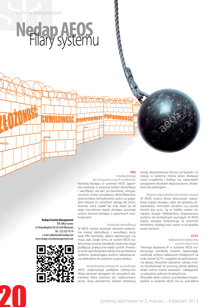 systemy zintegrowane Nedap AEOS Filary systemu Nedap Security Management BTC Office Center al. Niepodległości 69, 02-626 Warszawa tel.: (22) 322 76 74 e-mail: [email protected] www.nedap-securitymanagement.com SKD Uzyskaj dostęp do nieograniczonych możliwości Kontrola dostępu w systemie AEOS zapewnia swobodę w wyborze metod identyfikacji i weryfikacji, od kart po biometrię, nieograniczonej liczbie posiadaczy identyfikatorów: pracowników, kontrahentów, gości czy pojazdów. Można im umożliwić dostęp do drzwi, bramek, wind, szafek itp. Gdy doda się do tego warunkowe reguły dostępu, powstaje system kontroli dostępu o ogromnych możliwościach. Swoboda identyfikacji W AEOS można stosować dowolne połączenie metod identyfikacji i weryfikacji: karty, kody PIN, biometria, tablice rejestracyjne czy masa ciała. Dzięki temu, że system AEOS wykorzystuje otwarte standardy, można do niego podłączyć praktycznie każdy czytnik. Powstaje w ten sposób bardzo elastyczna architektura systemu, gwarantująca poziom zabezpieczenia adekwatny do poziomu ryzyka obiektu. Kontrolowany dostęp do wszystkiego AEOS wykorzystuje podejście holistyczne. Może sterować dostępem do wszystkich elementów, które powinny być nadzorowane: drzwi, śluzy powietrzne, bramki obrotowe, windy, depozytariusze kluczy czy kopiarki. Co więcej, w systemie można łatwo dodawać nowe urządzenia i funkcje, np. wprowadzić zarządzanie skrytkami depozytowymi, drukarkami lub parkingiem. Reguły odpowiednie do każdej sytuacji W AEOS można łatwo aktywować warunkowe reguły dostępu, takie jak globalny antypassback, menedżer zliczania czy zasada dwóch par oczu. Są to bardzo ważne narzędzia służące dokładnemu dopasowaniu systemu do konkretnych wymagań. W AEOS reguły dostępu funkcjonują na poziomie kontrolera, działają więc nawet w przypadku awarii serwera. CCTV Najbardziej reaktywny system dozorowy Telewizja dozorowa IP w systemie AEOS wykorzystuje standardy otwarte, zapewniając swobodę wyboru najlepszych dostępnych na rynku kamer CCTV i urządzeń do archiwizowania obrazu. Wszystkie zdarzenia i obrazy można monitorować za pomocą jednej aplikacji, dzięki czemu można zauważyć i zareagować na zdarzenia szybciej niż dotychczas. Wszystkie dane z kamer są przesyłane bezpośrednio w systemie AEOS, nie są potrzebne systemy alarmowe nr 2, marzec – kwiecień 2013 więc ani dodatkowe urządzenia do przechowywania danych, ani oprogramowanie zewnętrzne. Wyjątkowo prosta platforma bezpieczeństwa AEOS firmy Nedap jest bezkonkurencyjnie wydajnym systemem zarządzania bezpieczeństwem, łączy bowiem systemy telewizji dozorowej, kontroli dostępu oraz sygnalizacji włamania i napadu za pomocą pojedynczego kontrolera i w środowisku jednoserwerowym. Dzięki temu nakłady na infrastrukturę i sprzęt mogą być ograniczone do minimum. Koniec z technologicznymi kompromisami Telewizja dozorowa IP w systemie AEOS obsługuje wszystkie kamery generujące obraz z kompresją MJPEG oraz H.264. Spełnia też standardy ONVIF, nie ma więc potrzeby stosowania dedykowanych sterowników do obsługi kamer różnych producentów – w przeciwieństwie do innych systemów bezpieczeństwa, które obsługują wyłącznie kamery tej samej firmy. System AEOS jest rozwiązaniem niezależnym, użytkownicy mają do dyspozycji system otwarty na zmiany w przyszłości, do którego zawsze można będzie podłączyć najnowsze kamery. Swoboda wyboru metody magazynowania obrazu W przypadku telewizji dozorowej IP w systemie AEOS administratorzy sami decydują, gdzie będzie przechowywany materiał wideo. Może on być zapisywany centralnie na serwerze, lokalnie na dysku zewnętrznym USB podłączonym do kontrolera albo na urządzeniach NAS. AEOS nie wymaga zakupu drogich dedykowanych urządzeń do przechowywania obrazu, takich jak rejestratory cyfrowe (DVR) czy sieciowe rejestratory (NVR). sieciowej przeglądarki wideo – graficznego interfejsu użytkownika. Można uzyskać podgląd na żywo, a także przeglądać zapisane materiały ze wszystkich kamer podłączonych do sieci. Okna w przeglądarce wideo są dowolnie konfigurowane. Wystarczy wybrać nagrania według konkretnego zdarzenia albo pory dnia. SSWiN Zawsze uzbrojony, nawet jeśli się go rozbroi Dylemat związany z posiadaniem dwóch oddzielnych systemów polega na tym, że o ile system kontroli dostępu musi zapewnić selektywny dostęp, o tyle system sygnalizacji włamania i napadu musi zabezpieczyć cały obiekt przed dostępem osób nieupoważnionych. System AEOS integruje te dwa obszary, oferując ciekawe połączenia funkcjonalne. Prowadzi to do zmniejszenia liczby fałszywych alarmów, np. drzwi pozostają zamknięte w kluczowym momencie uzbrajania albo rozbrajania systemu. System sygnalizacji włamania i napadu AEOS jest najbardziej skalowalną opcją spośród rozwiązań dostępnych na rynku. Zapewnia też nieograniczone możliwości dodawania użytkowników, stref czy obszarów. Jeden system do wszystkich zadań W AEOS system sygnalizacji włamania i napadu korzysta z tej samej centrali, co systemy kontroli dostępu, a obydwa te systemy są zarządzane przez tę samą aplikację, która zarządza telewizją dozorową. Umożliwia to inteligentne lokalne połączenia funkcjonalne, redukując jednocześnie całkowity koszt zakupu i utrzymania systemu. Z kolei upraw- Natychmiastowy podgląd na wszystko W AEOS wszystkimi procesami związanymi z telewizją dozorową można zarządzać z poziomu systemy alarmowe nr 2, marzec – kwiecień 2013 nienia użytkowników i kody PIN są przydzielane centralnie. Pozwala to zaoszczędzić czas i sprawia, że w systemie znajdują się zawsze zaktualizowane dane, co w efekcie podnosi bezpieczeństwo. W gotowości, a nie w stresie Koniec z fałszywymi alarmami, mniej także negatywnych konsekwencji związanych z rozproszeniem uwagi podczas uzbrajania systemu sygnalizacji włamania i napadu. W trakcie tego proce