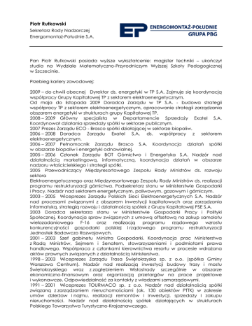 Piotr Rutkowski Sekretarz Rady Nadzorczej Energomontaż-Południe S.A. Pan Piotr Rutkowski posiada wyższe wykształcenie: magister techniki – ukończył studia na Wydziale Matematyczno-Przyrodniczym Wyższej Szkoły Pedagogicznej w Szczecinie. Przebieg kariery zawodowej: 2009 – do chwili obecnej Dyrektor ds. energetyki w TP S.A. Zajmuje się koordynacją współpracy Grupy Kapitałowej TP z sektorem elektroenergetycznym. Od maja do listopada 2009 Doradca Zarządu w TP S.A. - budowa strategii współpracy TP z sektorem elektroenergetycznym, opracowanie strategii zarządzania obszarem energetyki w strukturach grupy Kapitałowej TP. 2008 – 2009 Główny specjalista w Departamencie Sprzedaży Exatel S.A. Koordynował działania sprzedaży spółki w sektorze publicznym. 2007 Prezes Zarządu ECO - Brasco spółki działającej w sektorze biopaliw. 2006 – 2008 Doradca Zarządu Exatel S.A. ds. współpracy z sektorem elektroenergetycznym. 2006 – 2007 Pełnomocnik Zarządu Brasco S.A. Koordynacja działań spółki w obszarze biopaliw i energetyki odnawialnej. 2005 – 2006 Członek Zarządu BOT Górnictwo i Energetyka S.A. Nadzór nad działalnością marketingową, informatyczną, koordynacja działań w obszarze nadzoru właścicielskiego i strategii spółki. 2005 Przewodniczący Międzyresortowego Zespołu Rady Ministrów ds. rozwoju sektora Elektroenergetycznego oraz Międzyresortowego Zespołu Rady Ministrów ds. realizacji programu restrukturyzacji górnictwa. Podsekretarz stanu w Ministerstwie Gospodarki i Pracy. Nadzór nad sektorem energetycznym, paliwowym, gazowym i górniczym. 2003 – 2005 Wiceprezes Zarządu Polskich Sieci Elektroenergetycznych S.A. Nadzór nad procesami związanymi z obszarem inwestycji kapitałowych oraz zarządzania informatyką, strategią rozwoju i działalnością spółek z Grupy Kapitałowej PSE S.A. 2003 Doradca sekretarza stanu w Ministerstwie Gospodarki Pracy i Polityki Społecznej. Koordynacja spraw związanych z umową offsetową na zakup samolotu wielozadaniowego F-16 oraz realizacją programu rządowego wzrostu konkurencyjności gospodarki polskiej i rządowego programu restrukturyzacji Jednostek Badawczo Rozwojowych. 2001 – 2003 Szef gabinetu Ministra Gospodarki. Koordynacja prac Ministerstwa z Radą Ministrów, Sejmem i Senatem, stowarzyszeniami i podmiotami prawa handlowego. Współpraca z członkami kierownictwa resortu w procesie wdrażana aktów prawnych związanych z działalnością Ministerstwa. 1998 – 2003 Wiceprezes Zarządu Trasa Świętokrzyska sp. z o.o. (spółka Gminy Warszawa Centrum). Nadzór nad realizacją inwestycji budowy trasy i mostu Świętokrzyskiego wraz z zagłębieniem Wisłostrady szczególnie w obszarze ekonomiczno-finansowym oraz organizacją przetargów na prace projektowe i wykonawcze. Odpowiedzialność za kontakty z władzami samorządowymi. 1991 – 2001 Wiceprezes TOURMACO sp. z o.o. Nadzór nad działalnością spółki związaną z zarządzaniem nieruchomościami (ok. 130 obiektów PTTK) w zakresie umów dzierżaw i najmu, realizacji remontów i inwestycji, sprzedaży i zakupu nieruchomości. Nadzór nad działalnością spółek działających w strukturach Polskiego Towarzystwa Turystyczno-Krajoznawczego. 1992 – 2001 Wiceprezes Zarządu FIN-CO-MA sp. z o.o. Opracowywanie na zlecenie banków, firm, osób fizycznych analiz ekonomiczno-finansowych, prawnych, marketingowych przedsięwzięć gospodarczych z wykorzystaniem tych opracowań przy udzielaniu kredytów lub pozyskiwaniu dofinansowania na realizację inwestycji ze szczególnym uwzględnieniem sektora turystycznego. 1986 – 1991 Wicedyrektor Departamentu Upowszechniania Turystyki i Wypoczynku w Głównym Komitecie Kultury Fizycznej i Turystyki, a następnie Komitecie Młodzieży i Kultury Fizycznej. Koordynacja współpracy resortu z organizacjami i towarzyszeniami z obszaru masowej kultury fizycznej i turystyki. 1982 – 1985 Sekretarz Rady Naczelnej Zrzeszenia Studentów Polskich. Nadzór nad działalnością organizacyjną i administracyjną stowarzyszenia, współpracą z organizacjami państwowymi i samorządowymi. 1980 – 1992 Przewodniczący Rady Okręgowej w Szczecinie Socjalistycznego Związku Studentów w Szczecinie. Udział w Radach Nadzorczych spółek prawa handlowego: 2012 – nadal członek Rady Nadzorczej ELTUR-SERWIS sp. z o.o. 2011 – nadal członek Rady Nadzorczej RAFAKO S.A. 2011 – nadal członek Rady Nadzorczej Elektrownia Wiatrowa Kamieńsk sp. z o. o. 2011 – nadal członek Rady Nadzorczej GREENBET S.A. 2009 – nadal przewodniczący RN PGE Elektrociepłownia Gorzów S.A. 2005 – 2006 przewodniczący RN Elektrowni Bełchatów 2003 – 2005 wiceprzewodniczący RN Przedsiębiorstwa Eksploatacji Rurociągów Naftowych PERN S.A. 2003 – 2005 wiceprzewodniczący RN Exatel S.A. 1997 – 1999 przewodniczący RN Dziesiątego Narodowego Funduszu Inwestycyjnego FOKSAL S.A. 1992 – 2000 przewodniczący RN Okręgowego Zarządu Działalności Gospodarczej PZMot w Szczecinie sp. z o.o. 1991 – 2000 przewodniczący RN Okręgowego Oddziału Działalności Gospodarczej PTTK w Szczecinie sp. z o.o. 1991 – 2001 członek RN Stoczni Szczecińskiej PORTA HOLDING S.A. 1989 – 1991 prezes Polskiego Związku Triathlonu. Pan Piotr Rutkowski zasiada w Radzie Nadzorczej Energomontaż-Południe S.A. od dnia 12 kwietnia 2012 roku. Pan Piotr Rutkowski nie prowadzi działalności konkurencyjnej w stosunku do działalności Emitenta. Nie uczestniczy w spółce konkurencyjnej jako wspólnik spółki cywilnej, spółki osobowej lub jako członek organu spółki kapitałowej bądź w innej konkurencyjnej osobie prawnej jako członek organu. Nie figuruje w Rejestrze Dłużników Niewypłacalnych, prowadzonym na podstawie ustawy o KRS.