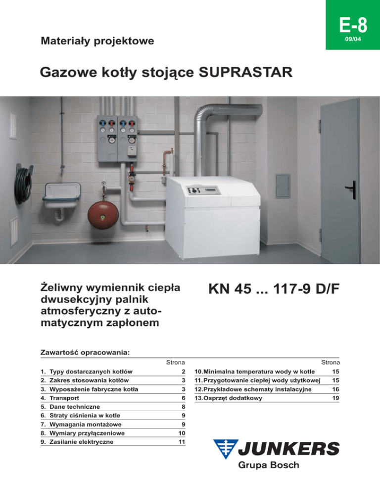E-8 Materia³y projektowe 09/04 Gazowe kot³y stoj¹ce SUPRASTAR ¯eliwny wymiennik ciep³a dwusekcyjny palnik atmosferyczny z automatycznym zap³onem KN 45 ... 117-9 D/F Zawartoœæ opracowania: Strona 1. 2. 3. 4. 5. 6. 7. 8. 9. Typy dostarczanych kot³ów Zakres stosowania kot³ów Wyposa¿enie fabryczne kot³a Transport Dane techniczne Straty ciœnienia w kotle Wymagania monta¿owe Wymiary przy³¹czeniowe Zasilanie elektryczne 2 3 3 6 8 9 9 10 11 Strona 10.Minimalna temperatura wody w kotle 11.Przygotowanie ciep³ej wody u¿ytkowej 12.Przyk³adowe schematy instalacyjne 13.Osprzêt dodatkowy 15 15 16 19 SUPRASTAR KN 45...117-9 1. Typy dostarczanych kot³ów KN 45...117-9 Oznaczenia: KN = kocio³ gazowy z obni¿on¹ emisj¹ NOx 45...117 = nominalna moc kot³a [kW] 9 = generacja kot³a D = cyfrowy panel steruj¹cy TAC-M z regulacj¹ pogodow¹ F = nad¹¿ny panel steruj¹cy (stosowany jako 2 do 9 w uk³adach kaskadowych) M = blok cz³onów ¿eliwnych zmontowany w ca³oœci L = blok cz³onów ¿eliwnych w czêœciach E-8 09/04 Kocio³ z cyfrowym panelem steruj¹cym TAC-M i zmontowanym blokiem: Kocio³ z nad¹¿nym panelem steruj¹cym i zmontowanym blokiem: Typ kot³a KN 45-9 DM 23 KN 54-9 DM 23 KN 63-9 DM 23 KN 72-9 DM 23 KN 81-9 DM23 KN 90-9 DM 23 KN 99-9 DM 23 KN 108-9 DM23 KN 117-9 DM23 Typ kot³a KN 45-9 FM 23 KN 54-9 FM 23 KN 63-9 FM 23 KN 72-9 FM 23 KN 81-9 FM 23 KN 90-9 FM 23 KN 99-9 FM 23 KN 108-9 FM 23 KN 117-9 FM 23 Nr katalogowy 7 715 430 073 7 715 430 095 7 715 430 129 7 715 430 177 7 715 430 228 7 715 430 276 7 715 430 335 7 715 430 381 7 715 430 435 Rodzaj gazu Przystosowany na gaz ziemny GZ 50 (dysze na gaz GZ 41,5 w komplecie) Nr katalogowy tylko na ¿yczenie tylko na ¿yczenie 7 715 430 131 7 715 430 179 7 715 430 230 7 715 430 278 7 715 430 337 7 715 430 383 7 715 430 437 Rodzaj gazu Przystosowany na gaz ziemny GZ 50 (dysze na gaz GZ 41,5 w komplecie) Kocio³ z cyfrowym panelem steruj¹cym TAC-M i blokiem w czêœciach: Kocio³ z nad¹¿nym panelem steruj¹cym i blokiem w czêœciach: Typ kot³a KN 45-9 DL 23 KN 54-9 DL 23 KN 63-9 DL 23 KN 72-9 DL 23 KN 81-9 DL 23 KN 90-9 DL 23 KN 99-9 DL 23 KN 108-9 DL 23 KN 117-9 DL 23 Typ kot³a KN 45-9 FL 23 KN 54-9 FL 23 KN 63-9 FL 23 KN 72-9 FL 23 KN 81-9 FL 23 KN 90-9 FL 23 KN 99-9 FL 23 KN 108-9 FL 23 KN 117-9 FL 23 Nr katalogowy tylko na ¿yczenie tylko na ¿yczenie 7 715 430 130 7 715 430 178 7 715 430 229 7 715 430 277 7 715 430 336 7 715 430 382 7 715 430 436 Typ KN 45...117-9 KN 45...72-9 KN 81...117-9 Gaz GZ 35* p³ynny p³ynny Nr katalogowy 7 715 430 072 7 715 430 094 7 715 430 128 7 715 430 176 7 715 430 227 7 715 430 275 7 715 430 334 7 715 430 380 7 715 430 434 Rodzaj gazu Przystosowany na gaz ziemny GZ 50 (dysze na gaz GZ 41,5 w komplecie) Istnieje mo¿liwoœæ przezbrojenia kot³a na gaz GZ 35 oraz gaz p³ynny. Zestawy do przezbrojenia kot³a na inne rodzaje gazu: Infolinia 0801 600 801 Przystosowany na gaz ziemny GZ 50 (dysze na gaz GZ 41,5 w komplecie) Nr katalogowy 7 715 429 203 7 715 449 205 7 715 449 412 * 1 komplet dla kot³ów KN 45...63-9 D/F, 2 komplety dla kot³ów KN 72...117-9 D/F 2 Rodzaj gazu SUPRASTAR KN 45...117-9 2. Zakres stosowania kot³ów Kot³y ¿eliwne stoj¹ce z palnikiem atmosferycznym dwustopniowym, elektronicznym zap³onem, kontrol¹ jonizacyjn¹ p³omienia i grawitacyjnym odprowadzeniem spalin do komina, przeznaczone do stosowania w niskotemperaturowych zamkniêtych instalacjach c.o. o maksymalnej temp. zasilania 90°C i maksymalnym ciœnieniu roboczym do 6 bar. Kot³y Suprastar KN 45...117 mog¹ dzia³aæ jako jednostki pojedyncze pracuj¹ce samodzielnie, wzglêdnie w uk³adach kaskadowych (kaskada 2 do 10 jednostek kot³owych, przy czym jeden kocio³ w wersji KN 45...117 D M/L, natomiast pozosta³e w wersji KN 45...117 F M/L szczegó³y patrz kot³y MKN). Po pod³¹czeniu zasobnika pojemnoœciowego z wê¿ownic¹, umo¿liwiaj¹ podgrzewanie ciep³ej wody u¿ytkowej, przy czym panel steruj¹cy TAC-M (standardowe wyposa¿enie kot³ów wersji D M/L) realizuje funkcjê priorytetu c.w.u., pracy równoleg³ej c.o. i c.w.u. oraz pracy c.w.u. bez priorytetu. 3. Wyposa¿enie fabryczne kot³a Ð Blok kot³a wykonany z ¿eliwa GG20 jest zmontowany na p³ycie dennej lub w postaci poszczególnych cz³onów kot³a do samodzielnego monta¿u. Ð Blok kot³a i skrzynka przerywacza ci¹gu izolowane we³n¹ mineraln¹ o gruboœci 100 mm. W komorze spalania pod palnikiem znajduje siê p³yta izolacyjna z w³ókien ceramicznych o gruboœci 10 mm. Ð Skrzynka przerywacza ci¹gu wyposa¿ona w du¿y otwór rewizyjny. Ð Wbudowana przepustnica reguluj¹ca optymalnie iloœæ powietrza do spalania. Ð Palnik atmosferyczny z komor¹ wstêpnego zmieszania (niska zawartoœæ NOx) dla gazu ziemnego i gazu p³ynnego. Ð Dwusekcyjny palnik z dwiema armaturami gazowymi. Ð Automat zap³onowy z palnikiem zap³onowym i jonizacyjn¹ kontrol¹ obecnoœci p³omienia. Ð Kompletnie oprzewodowana skrzynka sterownicza zawieraj¹ca wszystkie niezbêdne elementy zabezpieczaj¹ce: - wy³¹cznik g³ówny - prze³¹cznik trybu pracy - przycisk resetuj¹cy - ogranicznik temperatury bezpieczeñstwa (110°C) z przyciskiem „test” - bezpiecznik 4 A - termostat kot³a (regulator temperatury) - lampki trybu pracy i usterek - termometr (tylko nad¹¿ny panel steruj¹cy) Ð Kocio³ w wersji D z regulatorem pogodowym TAC-M (stosowany jako kocio³ pojedynczy lub kocio³ wiod¹cy w uk³adzie kaskadowym) Ð Obudowa kot³a z blachy stalowej pokryta warstw¹ tworzywa sztucznego w kolorze bia³ym. Panel cyfrowy TAC-M (menu w jêzyku polskim, Infolinia 0801 600 801 niemieckim lub angielskim) jest bardzo zaawansowanym uk³adem sterowania prac¹ kot³a, który daje nastêpuj¹ce mo¿liwoœci: Ð sterowanie pogodowe (czujnik temperatury zewnêtrznej na wyposa¿eniu kot³a) 1 obiegu c.o. bez zaworu mieszaj¹cego; Ð mo¿liwoœæ sterowania 1 lub 2 dodatkowymi obiegami c.o. z zaworami mieszaj¹cymi (wyposa¿enie dodatkowo 1 lub 2 p³ytki MMX); Ð mo¿l