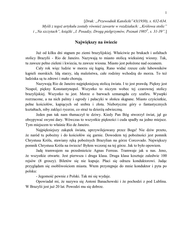 1 [Druk: „Przewodnik Katolicki”43(1930), s. 632-634. Myśli z tegoż artykułu zostały również zawarte w rozdziałach: „Królowa stolic” i „Na szczytach”, książki „I. Posadzy, Drogą pielgrzymów, Poznań 19855, s. 31-39”.] Największy na świecie Już od kilku dni stąpam po ziemi brazylijskiej. Właściwie po brukach i asfaltach stolicy Brazylii - Rio de Janeiro. Nazywają to miasto stolicą wiekuistej wiosny. Tak, tu zawsze pełno zieleni i kwiecia, tu zawsze wiosna. Miasto jest położone nad oceanem. Cały rok więc ludzie w morzu się kąpią. Rano widać rzesze całe lubowników kąpieli morskich. Idą starzy, idą maleństwa, całe rodziny wchodzą do morza. To też ludziska są tu zdrowi i mało chorują. Nazywają Rio de Janeiro najpiękniejszą stolicą świata. I to jest prawdą. Piękny jest Neapol, piękny Konstantynopol. Wszystko to niczym wobec tej czarownej stolicy brazylijskiej. Wszystko tu jest. Morze o barwach szmaragdu czy szafiru. Wysepki rozrzucone, a na nich palmy i ogrody i pałacyki w słońcu skąpane. Miasto czyściutkie, pełne kościołów, kapiących od srebra i złota. Niebotyczne góry o fantastycznych kształtach, niby zaklęci rycerze, co straż tu dzierżą odwieczną. Jeden pan tak nam tłumaczył te dziwy. Kiedy Pan Bóg stworzył świat, jął go obsypywać swymi dary. Wówczas to wszystkie piękności i cuda spadły na jedno miejsce. Tym miejscem to właśnie Rio de Janeiro. Najpiękniejszy zakątek świata, uprzywilejowany przez Boga! Nie dziw przeto, że naród tu pobożny i do kościołów się garnie. Dowodem tej pobożności jest pomnik Chrystusa Króla, stawiany ręką pobożnych Brazylian na górze Corcovado. Największy pomnik Chrystusa Króla na świecie! Byłem wczoraj na tej górze. Jak to było opowiem. Jadę tramwajem na przedmieście Agnas Ferreas. Tramwaje jak u nas. Jeno, że wszystkie otwarte. Jest pierwsza i druga klasa. Druga klasa kosztuje zaledwie 100 rejsów (8 groszy). Biletów się nie kupuje. Płaci się odrazu konduktorowi. Jadąc przyglądam się osobliwościom miasta. Wtem przystępuje do mnie konduktor i pyta po polsku: - Jegomość pewnie z Polski. Tak mi się wydaje. Opowiadał mi, że nazywa się Antoni Banachowski i że pochodzi z pod Lublina. W Brazylii jest już 20 lat. Powodzi mu się dobrze. 2 Dojeżdżamy do stacji końcowej. Stąd też wjeżdża osobna kolejka zębata na górę Corcovado. Jest jeszcze czas, więc chodzę sobie po ulicy. Staję przed małym sklepikiem z owocami. Leżą tam sterty całe bananów, ananasów i pomarańczy. Gospodarz mulat, pół biały, pół czarny zaprasza by wejść. Od razu podaje talerz i kładzie najpiękniejsze owoce na stole. - Jedz padre, jeżeli smakuje. Skorzystałem z zaproszenia. W końcu, kiedy chcę płacić, pieniędzy nie przyjmuje. - Był to dla mnie zaszczyt, odpowiada z uśmiechem. Co prawda takie owoce jak banany, pomarańcze kosztują tu grosze tylko. Nie widać ich też po sklepach większych ulic. To by nie uchodziło. Tam za to sprzedają egzotyczne owoce jak gruszki, jabłka - 50 groszy i więcej za sztukę. Siadamy do kolejki. Towa-[s. 632]rzystwo liczne. Przeważnie Anglicy i Francuzi. Powoli jedziemy w górę. Wspinamy się w licznych zakrętach po północnym, potem zachodnim zboczu góry. Z okienka wagonu widać na przemian to gęstą ścianę lasu, to znowu miasto i morze. Widok coraz piękniejszy. Las jakiś dziwnie odrębny. Palmy, mimozy, drzewa gumowe i żelazne o listkach drobnych jak u akacji. W słońcu wydawało się wszystko jakby utkane z płynnego złota. Do tego ta woń rozlicznych krzewów kwitnących i ziół. Nad tym wszystkim unoszą się wielkie motyle, co mają skrzydła pisane srebrem i złotem. Miasto coraz więcej maleje. Drapacze chmur, ogromne, kamienice, wydają się jak zabawki. A wyspy i góry pomniejsze! A ten ogromny ocean, po którym płyną wielkie okręty, wygląda jak staw maleńki. A my coraz wyżej pędzimy, coraz dalej w górę, 300, 400, 600 m. I jeszcze wyżej. Na wysokości 700 metrów stajemy. To szczyt góry Corcovado. Tu stawia Brazylia pomnik Chrystusowy. Ale co za pomnik! Wysokość jego wynosi 32 m. Rozpiętość ramion 12 m. Palec wskazujący prawej ręki przeszło l m. Pomnik już na wykończeniu. Pracuje tam kilkudziesięciu robotników. Ogromne żurawie wciągają do góry żelazo, cement, marmury. Święte oblicze już ukończone. Majestat, boskość bije z niego. Chrystus zwrócony jest w stronę miasta i oceanu. Ręce ma rozkrzyżowane, jakoby chciał wszystkich do siebie przygarnąć, co tam u jego stóp żyją i umierają. Twarz taka wyraźna, a usta takie żywe! Zdaje się nam, że za chwilę się otworzą i wypowiedzą owe boskie słowa: Pójdźcie do mnie wszyscy, którzy pracujecie i obciążeni jesteście, a ja was ochłodzę. 3 Później, po ukończeniu umieści się wzdłuż pomnika tysiące światełek, co świecić będą przez całą noc. Okrętom na pełnym morzu będzie ten Chrystus jaśniejący drogowskazem, a ludziom w mieście i w dalekiej dolinie przypomnieniem. Patrzymy przed siebie. Przed nami widok najpiękniejszy może na świecie. Stąd też twierdzą Brazyljanie, że szatan kusząc Chrystusa, przywiódł go właśnie na górę Corcovado i ukazywał mu wszystkie królestwa ziemskie. Gwar tu żaden nie dochodzi, ani szum morza, ani odgłos ludzki. Jeno żurawie żelazne skrzypią monotonnie. Chmury pachną i niesione lekkim wietrzykiem liżą nasze stopy. Milczymy, oniemieli potęgą i ogromem piękna. Raz po raz tylko bezwiednie z niektórych piersi wyrwie [s. 633] się głos: Oh, que c’est merveilleux - o jakie to cudowne. To znowu, jaki wielki jest Bóg! Naprawdę dobrze nam tu być! Chciałoby się w nieskończoność przedłużyć chwile pobytu. Ale słońce zapada. Szczyty gór pobliskich pala: się jak rubiny. Więc na pożegnanie klękamy u stóp Chrystusa, a z ust naszych płyną słowa modlitwy kapłańskiej: Królowi wieków, Nieśmiertelnemu B