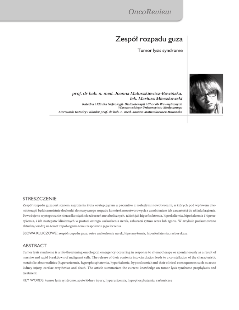 Zespół rozpadu guza Tumor lysis syndrome prof. dr hab. n. med. Joanna Matuszkiewicz-Rowińska, lek. Mariusz Mieczkowski Katedra i Klinika Nefrologii, Dializoterapii i Chorób Wewnętrznych Warszawskiego Uniwersytetu Medycznego Kierownik Katedry i Kliniki: prof. dr hab. n. med. Joanna Matuszkiewicz-Rowińska Streszczenie Zespół rozpadu guza jest stanem zagrożenia życia występującym u pacjentów z rozległymi nowotworami, u których pod wpływem chemioterapii bądź samoistnie dochodzi do masywnego rozpadu komórek nowotworowych z uwolnieniem ich zawartości do układu krążenia. Powoduje to występowanie nierzadko ciężkich zaburzeń metabolicznych, takich jak hiperfosfatemia, hiperkaliemia, hipokalcemia i hiperurykemia, i ich następstw klinicznych w postaci ostrego uszkodzenia nerek, zaburzeń rytmu serca lub zgonu. W artykule podsumowano aktualną wiedzę na temat zapobiegania temu zespołowi i jego leczenia. Słowa kluczowe: zespół rozpadu guza, ostre uszkodzenie nerek, hiperurykemia, hiperfosfatemia, rasburykaza Abstract Tumor lysis syndrome is a life-threatening oncological emergency occurring in response to chemotherapy or spontaneously as a result of massive and rapid breakdown of malignant cells. The release of their contents into circulation leads to a constellation of the characteristic metabolic abnormalities (hyperuricemia, hyperphosphatemia, hyperkalemia, hypocalcemia) and their clinical consequences such as acute kidney injury, cardiac arrythmias and death. The article summarizes the current knowledge on tumor lysis syndrome prophylaxis and treatment. Key words: tumor lysis syndrome, acute kidney injury, hyperuricemia, hypophosphatemia, rasburicase Zespół rozpadu guza J. Matuszkiewicz-Rowińska, M. Mieczkowski Zespół rozpadu guza (TLS, Tumor Lysis Syndrome) występuje terapii (tab. 1). Wysokie ryzyko wystąpienia tego zespołu mają najczęściej u osób z chorobami rozrostowymi układu krwiotwór- chorzy z dużą masą szybko proliferujących komórek, otrzymują- czego, takimi jak chłoniaki, białaczki czy szpiczak mnogi. Wraz cy złożoną, intensywną terapię, szczególnie gdy są na nią bardzo z rozwojem onkologii klinicznej w ostatnich latach obserwuje się wrażliwi. Zaawansowany wiek, istniejąca już nefropatia, odwod- także wzrost liczby przypadków TLS w przebiegu szybko prolife- nienie i jednoczesne stosowanie innych leków nefrotoksycznych rujących guzów litych. Zespół rozpadu guza obejmuje grupę za- są kolejnymi czynnikami sprzyjającymi temu powikłaniu [5–7]. burzeń metabolicznych spowodowanych gwałtownym rozpadem W tabeli 2 podano zmodyfikowane w 2004 r. kryteria rozpozna- komórek nowotworowych, do którego dochodzi albo pod wpły- nia TLS [6]. Zespół ten może mieć postać utajoną, z zaburzenia- wem chemioterapii, albo samoistnie. Nagłe masywne uwolnienie mi wykrywanymi jedynie laboratoryjnie, lub klinicznie jawną. do krążenia dużych ilości jonów potasu, fosforanów nieorganicznych i kwasów nukleinowych prowadzi do rozwoju hiperkaliemii, hiperfosfatemii, hiperurykemii i hipokalcemii. Konsekwencje tych stanów mogą być groźne, a należą do nich ostre uszkodzenie nerek i innych narządów, zaburzenia rytmu serca, a nawet zgon chorego. Ostre uszkodzenie nerek Ostre uszkodzenie nerek jest w TLS spowodowane przede wszystkim precypitacją moczanów oraz fosforanów wapnia w cewkach nerkowych, rozwojem stanu zapalnego i uszkodzeniem śródmiąższu nerek. Dodatkowo kwas moczowy może powodować skurcz naczyń nerkowych z upośledzeniem autoregulacji i spadkiem przepływu krwi przez nerki [1, 2]. Z kolei uwalniane w czasie roz- Tabela 2. Kryteria rozpoznania zespołu rozpadu guza (TLS) [6]. Laboratoryjny TLS kwas moczowy ≥ 8 mg/dl (lub wzrost o 25%) fosforany ≥ 6,5 mg/dl (lub wzrost o 25%) u dzieci fosforany ≥ 4,5 mg/dl (lub wzrost o 25%) u dorosłych potas ≥ 6,0 mmol/l (lub wzrost o 25%) wapń ≤ 7 mg/dl (lub spadek o 25%) padu komórek guza cytokiny nasilają stan zapalny [3]. Wreszcie, u chorych leczonych allopurinolem dochodzi do akumulacji prekursora kwasu moczowego – ksantyny, która ze względu na słabą rozpuszczalność w moczu (bez względu na pH) również może powodować zatkanie cewek [4]. Czynniki ryzyka rozwoju TLS można podzielić na zależne od pacjenta, typu i rozległości nowotworu oraz zależne od rodzaju Klinicznie jawny TLS zaburzenia rytmu serca lub nagły zgon sercowy z powodu hiperpotasemii zaburzenia rytmu serca, nagły zgon, drgawki lub cechy nadpobudliwości nerwowo-mięśniowej*, hipotensja, niewydolność serca spowodowana hipokalcemią ostre uszkodzenie nerek: kreatynina: wzrost o 0,3 mg/dl lub 1,5 raza powyżej normy, lub oliguria ≥ 6 h (< 0,5 ml/kg m.c./h) * tężyczka, parestezje, kurcze mięśniowe, objaw Chvostka, objaw Trousseau, skurcz mięśni stopy, stridor, skurcz oskrzeli Tabela 1. Czynniki ryzyka rozwoju zespołu rozpadu guza. Czynniki zależne od nowotworu szybka proliferacja komórek duża masa guza (rozmiary, dwukrotny wzrost LDH, liczba krwinek białych > 25 000/mm3) rozległe zajęcie szpiku kostnego lub układu limfatycznego wrażliwość na chemioterapię Czynniki zależne od chorego podwyższone wyjściowo stężenie kwasu moczowego/fosforanów w surowicy odwodnienie niskie pH moczu skąpomocz (wolny przepływ moczu przez cewki) istniejąca nefropatia zaawansowany wiek Czynniki zależne od leczenia intensywna wielolekowa terapia wspomagająca radioterapia 2012/Vol. 2/Nr 2/88-92 Do rozpoznania utajonego (laboratoryjnego) TLS konieczne jest spełnienie przynajmniej 2 z 4 laboratoryjnych kryteriów w okresie od 3 dni przed rozpoczęciem do 7 dni po rozpoczęciu chemioterapii. Klinicznie jawny TLS rozpoznajemy natomiast wtedy, gdy laboratoryjnemu TLS towarzyszy jedno z 4 następujących kryteriów klinicznych: ostre uszkodzenie nerek, drgawki, zaburzenia rytmu serca lub zgon [6]. Zapobieganie i leczenie Podstawą zarówno profilaktyki, jak i leczenia TLS 