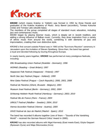 ________________________________________________________________________________ KROKE (which means Kraków in Yiddish) was formed in 1992 by three friends and graduates of the Kraków Academy of Music: Jerzy Bawoł (accordion), Tomasz Kukurba (viola) and Tomasz Lato (double bass). The members of the group completed all stages of standard music education, including jazz and contemporary music. KROKE began by playing klezmer music, which is deeply set in Jewish tradition, and adding a strong influence of Balkan music. Currently, they draw inspiration from a variety of ethnic music from around the world, combining it with elements of jazz and improvisation, creating their own distinctive style. KROKE’s first concert outside Poland was in 1993 at the "Survivors Reunion” ceremony in Jerusalem upon the invitation of Steven Spielberg. Since then, the band has gained a loyal and devoted following by touring throughout Europe. In nearly twenty years together, KROKE has performed at many prestigious festivals, including: EBU Broadcasting Union Festival (Roskilde - Denmark); 1996 WOMAD (Reading – Great Britain); 1997 Haapavesi Folk Festival (Haapavesi - Finland); 1997 North Sea Jazz Festival (Hague - Holland); 1999 Nine Gates Festival (Prague – Czech Republic); 2000, 2003, 2008 Festival de Flandres (Ghent, Brussels - Belgium); 2001 Museum Insel Festival (Berlin - Germany); 2002; 2004 Schlezwig Holstein Musik Festival (Hamburg - Germany); 2003; 2010 Festival Ille de France (Paris - France); 2004 URKULT Festival (Näsåker - Sweden); 2004; 2010 Vienna Accordion Festival (Vienna - Austria); 2005 XXVII Festival de Jazz de Madrid (Madrid - Spain); 2010 The band has recorded 8 albums together (one of them – "Sounds of the Vanishing World” – received the German Record Critics' Award in 2000). KROKE has also recorded albums with Nigel Kennedy (East meets East), Edyta Geppert (Śpiewam Życie) and Maja Sikorowska (Avra) MUSICIANS: Jerzy Bawoł – accordion Tomasz Kukurba – viola Tomasz Lato – double bass DISCOGRAPHY: [1996] „Trio” (Oriente Musik) [1997] „Eden” (Oriente Musik) [1998] „Live at The Pit” (Oriente Musik) [1999] „Sounds of the Vanishing World” (Oriente Musik) [2003] „Ten Pieces To Save The World” (Oriente Musik) [2003] „East meets East” – with Nigel Kennedy (EMI) [2004] „Quartet - Live At Home” (Oriente Musik) [2006] „Śpiewam życie” – with Edyta Geppert (Agencja Artystyczna Edyta) (in 2007 released in Europe by Oriente Musik as „I Sing Life”) [2007] „Seventh Trip” (Oriente Musik) [2009] „Out of Sight” (Oriente Musik) [2011] „Avra” – with Maja Sikorowska (Pomaton EMI) KROKE ON THE WEB: http://www.kroke.krakow.pl – official bandʼs website http://www.facebook.com/kroke.trio http://www.myspace.com/kroketrio http://www.oriente.de – record label releasing Krokeʼs albums http://www.shop.gigicd.com – CDʼs distribution in Poland
