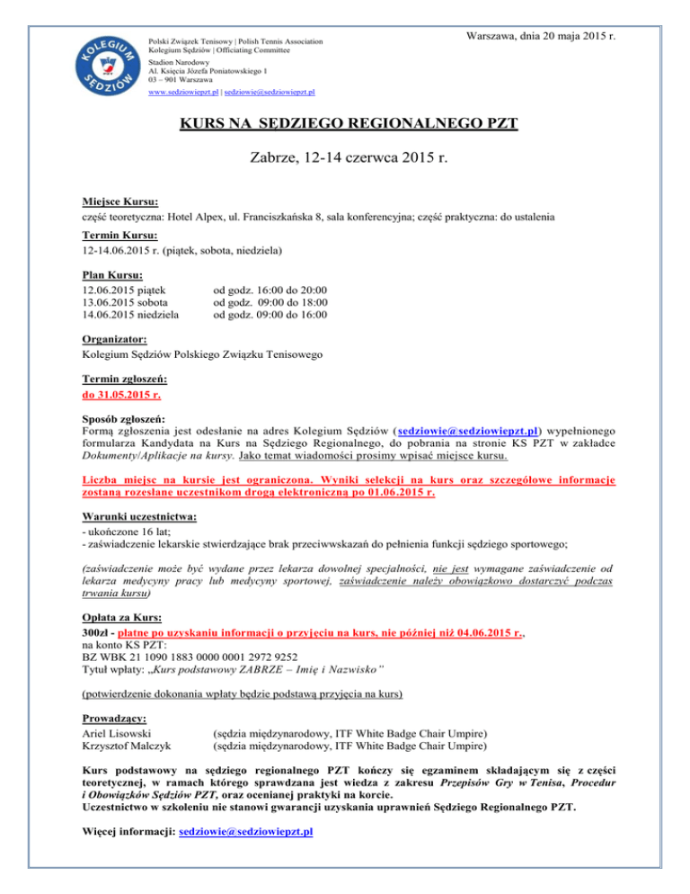 Polski Związek Tenisowy | Polish Tennis Association Kolegium Sędziów | Officiating Committee Warszawa, dnia 20 maja 2015 r. Stadion Narodowy Al. Księcia Józefa Poniatowskiego 1 03 – 901 Warszawa www.sedziowiepzt.pl | [email protected] KURS NA SĘDZIEGO REGIONALNEGO PZT Zabrze, 12-14 czerwca 2015 r. Miejsce Kursu: część teoretyczna: Hotel Alpex, ul. Franciszkańska 8, sala konferencyjna; część praktyczna: do ustalenia Termin Kursu: 12-14.06.2015 r. (piątek, sobota, niedziela) Plan Kursu: 12.06.2015 piątek 13.06.2015 sobota 14.06.2015 niedziela od godz. 16:00 do 20:00 od godz. 09:00 do 18:00 od godz. 09:00 do 16:00 Organizator: Kolegium Sędziów Polskiego Związku Tenisowego Termin zgłoszeń: do 31.05.2015 r. Sposób zgłoszeń: Formą zgłoszenia jest odesłanie na adres Kolegium Sędziów ([email protected]) wypełnionego formularza Kandydata na Kurs na Sędziego Regionalnego, do pobrania na stronie KS PZT w zakładce Dokumenty/Aplikacje na kursy. Jako temat wiadomości prosimy wpisać miejsce kursu. Liczba miejsc na kursie jest ograniczona. Wyniki selekcji na kurs oraz szczegółowe informacje zostaną rozesłane uczestnikom drogą elektroniczną po 01.06.2015 r. Warunki uczestnictwa: - ukończone 16 lat; - zaświadczenie lekarskie stwierdzające brak przeciwwskazań do pełnienia funkcji sędziego sportowego; (zaświadczenie może być wydane przez lekarza dowolnej specjalności, nie jest wymagane zaświadczenie od lekarza medycyny pracy lub medycyny sportowej, zaświadczenie należy obowiązkowo dostarczyć podczas trwania kursu) Opłata za Kurs: 300zł - płatne po uzyskaniu informacji o przyjęciu na kurs, nie później niż 04.06.2015 r., na konto KS PZT: BZ WBK 21 1090 1883 0000 0001 2972 9252 Tytuł wpłaty: „Kurs podstawowy ZABRZE – Imię i Nazwisko” (potwierdzenie dokonania wpłaty będzie podstawą przyjęcia na kurs) Prowadzący: Ariel Lisowski Krzysztof Malczyk (sędzia międzynarodowy, ITF White Badge Chair Umpire) (sędzia międzynarodowy, ITF White Badge Chair Umpire) Kurs podstawowy na sędziego regionalnego PZT kończy się egzaminem składającym się z części teoretycznej, w ramach którego sprawdzana jest wiedza z zakresu Przepisów Gry w Tenisa, Procedur i Obowiązków Sędziów PZT, oraz ocenianej praktyki na korcie. Uczestnictwo w szkoleniu nie stanowi gwarancji uzyskania uprawnień Sędziego Regionalnego PZT. Więcej informacji: [email protected]