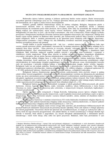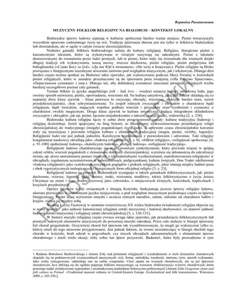 Вераніка Раманенкава MUZYCZNY FOLKLOR RELIGIJNY NA BIAŁORUSI – KONTEKST LOKALNY РЕ П О ЗИ ТО РИ Й БГ УК И Białoruskie śpiewy ludowe zajmują w kulturze społecznej bardzo ważne miejsce. Pieśni towarzyszyły wszystkim sprawom codziennego życia na wsi. Tradycja śpiewania obecna jest nie tylko w folklorze białoruskim lub słowiańskim, ale w ogóle w całym świecie chrześcijańskim. Niektóre gatunki folkloru białoruskiego należą do kultury religijnej. Religijne, liturgiczne pieśni z kanonicznymi tekstami, które są wykonywane w świątyni nazywają się sakralnymi. Pieśni z tekstami dostosowanymi do rozumienia przez ludzi prostych, lub te pieśni, które stały się zrozumiałe dla wiernych dzięki długiej tradycji ich wykonywania, noszą nazwę: wiersze duchowne, pieśni religijne, pieśni pielgrzyma lub bohogłasnika («Слава Богу за ўсё», «Да мы Юр’я пачынаем», «Hе хачу я Божухна»). Pieśni religijne są blisko powiązane z liturgicznymi mszalnymi utworami zarówno pod względem muzycznym, jak i tekstowym. Dlatego dziś bardzo często można spotkać na Białorusi takie zjawisko, jak wykonywanie podczas Mszy Świętej w kościołach pieśni religijnych, które w zasadzie przeznaczone są do śpiewania poza świątynią («На Расство Хрыстова», «Перастаньма сумаваці» і інш.). Dlatego też, aby dokładniej zrozumieć znaczenie piosenek religijnych trzeba bardziej szczegółowo poznać cały gatunek. Termin folklor (z języka angielskiego folk – lud, lore – wiedza) oznacza kulturę umysłową ludu, jego swoisty sposób mówienia, pieśni, opowiadania, wierzenia itd. Na kulturę umysłową, jaką jest folklor składają się co najmniej dwie klasy zjawisk – klasa pierwsza to zwyczaje, obrzędy, wierzenia, niekiedy bardzo stare, nawet przedchrześcijańskie, choć schrystianizowane. To zespół różnych zwyczajów i obrzędów o charakterze bądź religijnym, bądź świeckim, mających wspólne podłoże wierzeń i przesądów oraz wyobrażeń i czynności o charakterze zwykle magicznym. Druga klasa zjawisk to kultura artystyczna, będącą integralnym składnikiem zwyczajów i obrzędów, jak np. pieśni, łączone niejednokrotnie z tańcem, oracje, gadki, widowiska [2, s. 238]. Białoruska kultura religijna łączy w sobie dwie przeciwstawne zasady: kulturę tradycyjną (ludową) i religijną (kościelną). Jeżeli spojrzymy na bieg historii, to zauważymy niekwestionowane przeniknięcie religii chrześcijańskiej do tradycyjnego (niegdyś pogańskiego) życia ludzi. Z upływem czasu chrześcijańskie korzenie stały się mocniejsze i powstała religijna kultura z elementami tradycyjnej (magia, pieśni, wróżby, legendy). Religijność ludzi nie jest jednak jednolita. Katolicyzm współistnieje z prawosławiem i odwrotnie. Taki religijny konglomerat naukowcy określają jako: «ludową religijność» [3, s. 8], «folklor religijny», «religijność społeczną» [4, с. 91-100] «pobożność ludową», «katolicyzm ludowy», «religię ludową», «religijność tradycyjną». Religijność ludowa charakteryzuje się m.in. swoistym synkretyzmem, który pozwala wiązać w spójną całość relikty wierzeń pogańskich z elementami doktryny chrześcijańskiej; wyróżnia się skłonnością do sakralizacji świata, np. przez utożsamianie postaci świętych z ich materialnymi wyobrażeniami, manifestowaniem religijności w obrzędach, regularnym uczestnictwem w nabożeństwach, pielgrzymkami, kultem świętych. Don Yoder zdefiniował «ludową religijność» jako «całokształt wszystkich poglądów i praktyk religijnych, jakie istnieją między ludźmi poza i obok rygorystycznych teologicznych i liturgicznych form oficjalnej religii» [3, s. 23]. Religijność ludowa na terenach Białoruskich występuje w takich gatunkach folklorystycznych, jak: pieśni duchowne, wiersze, legendy, bajki, baśnie, znaki, wierzenia, modlitwy, teksty folklorystyczne o życiu Jezusa Chrystusa na ziemi i Jego drodze życiowej jako człowieka, o miejscowych świętych, kościołach, kapliczkach i krzyżach przydrożnych. Oprócz śpiewów ściśle związanych z liturgią Kościoła, funkcjonują jeszcze śpiewy religijne ludowe, ułożone przeważnie w codziennym języku miejscowym, a pod względem muzycznym pochodzące często ze śpiewu liturgicznego. Pieśni te są wytworem umysłu i uczucia różnych narodów, zatem, zależnie od charakteru ludów i krajów, różnią się między sobą. Według Larisy Gustowoj w ostatnim ćwierćwieczu XX wieku białoruska świadomość religijna objawia się w nowy sposób – jako jedność kanonicznej religijnej sztuki muzycznej i ludowej duchowości, co stanowi jedność ludowej sztuki muzycznej i religijnej sztuki chrześcijańskiej [5, s. 126-131]. W historii muzyki religijnej często zwraca uwagę takie zjawisko, jak przeniknięcie folklorystycznych lub prostych ludowych elementów muzycznych do poważnej muzyki sakralnej. Przez całe stulecia w liturgii śpiewany był chorał gregoriański. Oczywiście chorał był śpiewem tak wysublimowanym, że mogli go wykonywać tylko ci, którzy mieli do tego stosowne przygotowanie. Jest jednak faktem, że wierni uczestniczący w liturgii słuchali tego chorału w kościele, brali udział w pogrzebach, czy innych obrzędach sakramentalnych z elementami śpiewu chorałowego i mieli wiele okazji, żeby sobie ten śpiew przyswoić. Badania1, które były prowadzone w tym 1 Badania Bolesława Bartkowskiego i Antoni Zoły nad pieśniami religijnymi i wyodrębnienie w nich elementów chorałowych skupiały się na podstawowych wyznacznikach muzycznych: styl, forma, melodyka, tonalność, metrum, rytm, sposób wykonania. Jako cechy zintegrowane, oddziałują one na siebie wzajemnie. Choć oparte na wzorach chorałowych, nie są już śpiewem chorałowym, lecz zbliżają się d