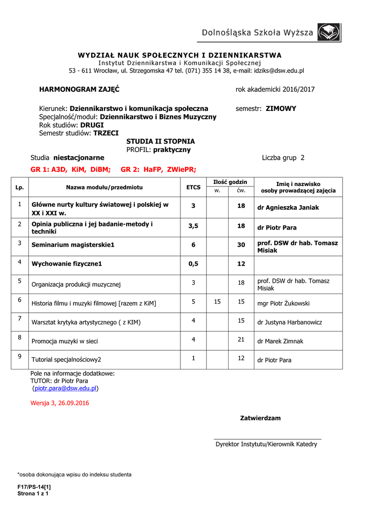 WYDZIAŁ NAUK SPOŁECZNYCH I DZIENNIKARSTWA In st yt ut D zie n ni kar stw a i Kom u ni ka c ji S po łe c zne j 53 - 611 Wrocław, ul. Strzegomska 47 tel. (071) 355 14 38, e-mail: [email protected] HARMONOGRAM ZAJĘĆ rok akademicki 2016/2017 Kierunek: Dziennikarstwo i komunikacja społeczna Specjalność/moduł: Dziennikarstwo i Biznes Muzyczny Rok studiów: DRUGI Semestr studiów: TRZECI STUDIA II STOPNIA PROFIL: praktyczny Studia niestacjonarne GR 1: A3D, KiM, DiBM; Lp. Nazwa modułu/przedmiotu Główne nurty kultury światowej i polskiej w XX i XXI w. 2 Opinia publiczna i jej badanie-metody i techniki 3 Seminarium magisterskie1 4 Wychowanie fizyczne1 6 7 8 9 Liczba grup 2 GR 2: HaFP, ZWiePR; 1 5 semestr: ZIMOWY ETCS Ilość godzin w. ćw. Imię i nazwisko osoby prowadzącej zajęcia 3 18 dr Agnieszka Janiak 3,5 18 dr Piotr Para 6 30 prof. DSW dr hab. Tomasz Misiak 0,5 12 Organizacja produkcji muzycznej 3 18 prof. DSW dr hab. Tomasz Misiak Historia filmu i muzyki filmowej [razem z KiM] 5 15 mgr Piotr Żukowski Warsztat krytyka artystycznego ( z KIM) 4 15 dr Justyna Harbanowicz Promocja muzyki w sieci 4 21 dr Marek Zimnak Tutorial specjalnościowy2 1 12 dr Piotr Para 15 Pole na informacje dodatkowe: TUTOR: dr Piotr Para ([email protected]) Wersja 3, 26.09.2016 Zatwierdzam ________________________________ Dyrektor Instytutu/Kierownik Katedry *osoba dokonująca wpisu do indeksu studenta F17/PS-14[1] Strona 1 z 1 sobota 24.09.16 r. Opinia publiczna i jej badanie – metody i techniki (1) dr P. Para s.310 niedziela 25.09.16 r. Historia filmu i muzyki filmowej wykład (1) mgr P. Żukowski s.313 Zjazd nr 1 (24, 25 września 2016 r.) 10.25 – 12.40 12.50 - 15.05 15.20 - 17.35 Organizacja Organizacja Warsztat krytyka produkcji produkcji artystycznego muzycznej muzycznej (1) (1) (2) dr J. Harbanowicz prof. DSW dr hab. prof. DSW dr hab. s.312 T. Misiak T. Misiak s.304 s.304 Historia filmu i Historia filmu i Historia filmu i muzyki filmowej muzyki filmowej muzyki filmowej ćwiczenia wykład ćwiczenia (1) (2) (2) mgr P. Żukowski mgr P. Żukowski mgr P. Żukowski s.313 s.313 s.313 8.00 – 10.15 Organizacja produkcji muzycznej (3) prof. DSW dr hab. T. Misiak s.304 Seminarium magisterskie1 (1) prof. DSW dr hab. T. Misiak s. 304 Zjazd nr 2 (8, 9 października 2016 r.) 10.25 – 12.40 12.50 - 15.05 15.20 - 17.35 Organizacja Opinia publiczna i produkcji Promocja muzyki w jej badanie – muzycznej sieci metody i techniki (4) (1) (2) prof. DSW dr hab. dr M. Zimnak dr P. Para T. Misiak s.313 s.313 s.304 Seminarium Warsztat krytyka magisterskie1 artystycznego (2) (2) prof. DSW dr hab. dr J. Harbanowicz T. Misiak s.312 s. 304 8.00 – 10.15 Zjazd nr 3 (22, 23 października 2016 r.) 10.25 – 12.40 12.50 - 15.05 15.20 - 17.35 8.00 – 10.15 sobota 8.10.16 r. niedziela 9.10.16 r. 17.45 - 20.00 17.45 - 20.00 Promocja muzyki w sieci (2) dr M. Zimnak s.313 17.45 - 20.00 sobota 22.10.16 r. x x x x x Warsztat krytyka artystycznego (3) dr J. Harbanowicz s.314 12.50 – 14.00 14.00 – 16.15 16.30 – 18.45 niedziela 23.10.16 r. Promocja muzyki w sieci (3) dr M. Zimnak s.217 Czas na dojazd WF ul. Szkocka 64 WF ul. Szkocka 64 15.20 - 17.35 17.45 - 20.00 8.00 – 10.15 sobota 5.11.16 r. niedziela 6.11.16 r. Opinia publiczna i jej badanie – metody i techniki (3) dr P. Para s.312 Promocja muzyki w sieci (4) dr M. Zimnak s.313 Zjazd nr 4 (5, 6 listopada 2016 r.) 10.25 – 12.40 12.50 - 15.05 Główne nurty Seminarium kultury światowej i magisterskie1 polskiej w XX i XXI (3) w. prof. DSW dr hab. (1) T. Misiak dr A. Janiak s. 304 s.312 Promocja muzyki w Historia filmu i sieci muzyki filmowej (5) ćwiczenia dr M. Zimnak (3) s.313 mgr P. Żukowski s.313 *osoba dokonująca wpisu do indeksu studenta F17/PS-14[1] Strona 1 z 1 Warsztat krytyka artystycznego (4) dr J. Harbanowicz s.312 Historia filmu i muzyki filmowej wykład (3) mgr P. Żukowski s.313 sobota 26.11.16 r. niedziela 27.11.16 r. 8.00 – 10.15 Organizacja produkcji muzycznej (5) prof. DSW dr hab. T. Misiak s.304 Warsztat krytyka artystycznego (5) dr J. Harbanowicz s.313 8.00 – 10.15 sobota 10.12.16 r. Opinia publiczna i jej badanie – metody i techniki (5) dr P. Para s.312 niedziela 11.12.16 r. Historia filmu i muzyki filmowej wykład (4) mgr P. Żukowski s.313 8.00 – 10.15 sobota 7.01.17 r. Seminarium magisterskie1 (7) prof. DSW dr hab. T. Misiak s.304 niedziela 8.01.17 r. X 8.00 – 10.15 sobota 21.01.17 r. Promocja muzyki w sieci (7) dr M. Zimnak s.217 niedziela 22.01.17 r. X Zjazd nr 5 (26, 27 listopada 2016 r.) 10.25 – 12.40 12.50 – 14.00 Opinia publiczna i jej badanie – metody i techniki (4) dr P. Para s.310 Seminarium magisterskie1 (4) prof. DSW dr hab. T. Misiak s. 304 16.30 – 18.45 Czas na dojazd WF ul. Szkocka 64 WF ul. Szkocka 64 12.50 - 15.05 15.20 - 17.35 17.45 - 20.00 15.20 - 17.35 17.45 - 20.00 Seminarium magisterskie1 (5) prof. DSW dr hab. T. Misiak s. 304 Promocja muzyki w sieci (6) dr M. Zimnak s.217 Historia filmu i muzyki filmowej wykład (5) mgr P. Żukowski s.313 Seminarium magisterskie1 (6) prof. DSW dr hab. T. Misiak s. 304 15.20 - 17.35 17.45 - 20.00 Tutorial specjalnościowy (1) dr P. Para s.312 Tutorial specjalnościowy (2) dr P. Para s.312 X X Zjazd nr 6 (10, 11 grudnia 2016 r.) 10.25 – 12.40 12.50 - 15.05 Główne nurty Główne nurty kultury światowej i kultury światowej i polskiej w XX i XXI polskiej w XX i XXI w. w. (2) (3) dr A. Janiak dr A. Janiak s.312 s.312 Historia filmu i Historia filmu i muzyki filmowej muzyki filmowej ćwiczenia ćwiczenia (4) (5) mgr P. Żukowski mgr P. Żukowski s.313 s.313 Zjazd nr 7 (7, 8 stycznia 2017 r.) 10.25 – 12.40 12.50 - 15.05 Główne nurty Seminarium kultury światowej i magisterskie1 polskiej w XX i XXI (8) w. prof. DSW dr hab. (4) T. Misiak dr A. Janiak s.304 s.312 X X Zjazd nr 8 (21, 22 stycznia 2017 r.) 10.25 – 12.40 12.50 - 15.05 15.20 - 17.35 Główne nurty Seminarium Seminarium kultury światowej i magisterskie1 magisterskie1 polskiej w XX i XXI (9) (10) w. prof.