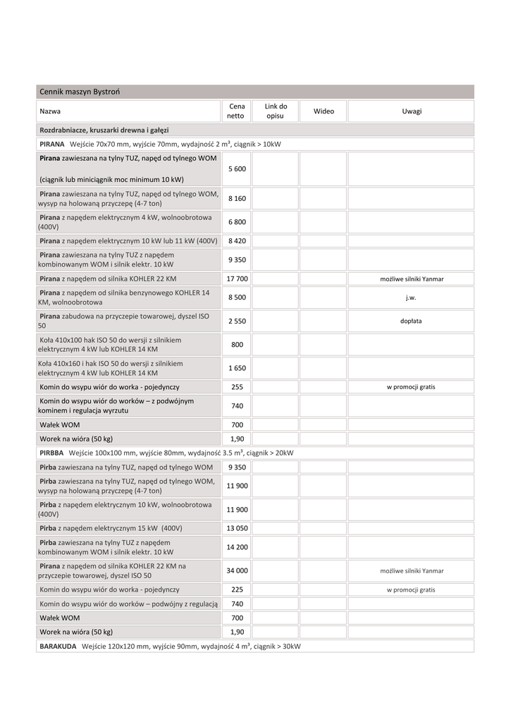Cennik maszyn Bystroń Nazwa Cena netto Link do opisu Wideo Uwagi Rozdrabniacze, kruszarki drewna i gałęzi PIRANA Wejście 70x70 mm, wyjście 70mm, wydajność 2 m³, ciągnik > 10kW Pirana zawieszana na tylny TUZ, napęd od tylnego WOM 5 600 (ciągnik lub miniciągnik moc minimum 10 kW) Pirana zawieszana na tylny TUZ, napęd od tylnego WOM, wysyp na holowaną przyczepę (4-7 ton) 8 160 Pirana z napędem elektrycznym 4 kW, wolnoobrotowa (400V) 6 800 Pirana z napędem elektrycznym 10 kW lub 11 kW (400V) 8 420 Pirana zawieszana na tylny TUZ z napędem kombinowanym WOM i silnik elektr. 10 kW 9 350 Pirana z napędem od silnika KOHLER 22 KM 17 700 możliwe silniki Yanmar Pirana z napędem od silnika benzynowego KOHLER 14 KM, wolnoobrotowa 8 500 j.w. Pirana zabudowa na przyczepie towarowej, dyszel ISO 50 2 550 dopłata Koła 410x100 hak ISO 50 do wersji z silnikiem elektrycznym 4 kW lub KOHLER 14 KM 800 Koła 410x160 i hak ISO 50 do wersji z silnikiem elektrycznym 4 kW lub KOHLER 14 KM 1 650 Komin do wsypu wiór do worka - pojedynczy 255 Komin do wsypu wiór do worków – z podwójnym kominem i regulacja wyrzutu 740 Wałek WOM 700 Worek na wióra (50 kg) 1,90 w promocji gratis PIRBBA Wejście 100x100 mm, wyjście 80mm, wydajność 3.5 m³, ciągnik > 20kW Pirba zawieszana na tylny TUZ, napęd od tylnego WOM 9 350 Pirba zawieszana na tylny TUZ, napęd od tylnego WOM, wysyp na holowaną przyczepę (4-7 ton) 11 900 Pirba z napędem elektrycznym 10 kW, wolnoobrotowa (400V) 11 900 Pirba z napędem elektrycznym 15 kW (400V) 13 050 Pirba zawieszana na tylny TUZ z napędem kombinowanym WOM i silnik elektr. 10 kW 14 200 Pirana z napędem od silnika KOHLER 22 KM na przyczepie towarowej, dyszel ISO 50 34 000 możliwe silniki Yanmar Komin do wsypu wiór do worka - pojedynczy 225 w promocji gratis Komin do wsypu wiór do worków – podwójny z regulacją 740 Wałek WOM 700 Worek na wióra (50 kg) 1,90 BARAKUDA Wejście 120x120 mm, wyjście 90mm, wydajność 4 m³, ciągnik > 30kW Barakuda zawieszana na tylny TUZ, napęd od tylnego WOM 19 580 Barakuda zawieszana na tylny TUZ, napęd od tylnego WOM, wysyp na holowaną przyczepę (4-7 ton) 22 100 Barakuda z napędem elektrycznym 15 kW (400V) 25 360 Wałek WOM 700 PIRANA LONGA Wejście 70x70 mm, wyjście 150mm, wydajność 2 m³, ciągnik > 20kW Pirana Longa zawieszana na tylny TUZ, napęd od tylnego WOM 5 610 Pirana Longa z napędem elektrycznym 4 kW, wolnoobrotowa (400V) 6 800 Pirana longa z napędem od silnika benzynowego KOHLER 14 KM, wolnoobrotowa 8 500 Koła 410x100 i hak ISO 50 do wersji z silnikiem elektrycznym 4 kW lub KOHLER 14 KM 800 Koła 410x160 i hak IS0 50 do wersji z silnikiem elektrycznym 4 kW lub KOHLER 14 KM 1 650 możliwe silniki Yanmar PIRBA LONGA Wejście 100x100 mm, wyjście 150mm, wydajność 3.5 m³, ciągnik > 30kW Pirba Longa zawieszana na tylny TUZ, napęd od tylnego WOM 9 350 MURENA I Wejście 90x100 mm, wyjście 5-10 mm (regulacja), wydajność 2 m³, ciągnik > 30kW Murena I zawieszana na tylny TUZ, napęd od tylnego WOM 23 800 Murena I zawieszana na tylny TUZ, napęd od tylnego WOM, wysyp na holowaną przyczepę (4-7 ton) 30 600 Murena I z napędem od silnika Yanmar 32 KM na przyczepie towarowej, dyszel ISO 50 42 500 Murena I z napędem elektrycznym 10 kW, wolnoobrotowa (400V) 26 350 MŁYNEK DO KORY Wyjście 30 mm, wydajność 2 - 4 m³, ciągnik 12 - 20kW Młynek do kory stacjonarny DK 200, silnik elektryczny 4 kW (400V) wydajność 2 m³ , wejście 200 mm 8 150 Młynek do kory stacjonarny DK 400, silnik elektryczny 5,5 kW (400V wydajność 3 m³,wejście 400 mm 10 200 Młynek do kory stacjonarny DK 600, silnik elektryczny 7,5 kW (400V) wydajność 4 m³, wejście 600 mm 12 200 Młynek do kory DK 200,zawieszany na tylny TUZ, napęd od tylnego WOM, wyd. 2 m³ , wejście 200 mm 7 900 Młynek do kory DK 400,zawieszany na tylny TUZ, napęd od tylnego WOM, wyd. 3 m³ , wejście 400 mm 9 990 Młynek do kory DK 600,zawieszany na tylny TUZ, napęd od tylnego WOM, wyd. 4 m³ , wejście 600 mm 12 050 ROZDRABNIACZ I PRASA DO OWOCÓW Rozdrabniacz i prasa do owoców, silnik 1,5 kW (400 V), wydajność do 200 litrów/min, lakiery spożywcze 4 420 Zbiornik ze stali nierdzewnej 700 RĘBAK DREWNA HOBBY 4 T Maksymalna drewna długość 500 mm / średnica 400 mm Stacjonarny. Nacisk 4 Tony, silnik 3 kW (400V) 3 740 - RĘBAK DREWNA FAMILY 6 T Maksymalna drewna długość 950 mm / średnica 400 mm Stacjonarny. Nacisk 6 Ton, silnik 3 kW (400V) 6 500 jak wyżej plus narzędzie do wytwarzania gontu dachowego 6 730 RĘBAK DREWNA JOLLY 10 T Maksymalna drewna długość 1100 mm / średnica 500 mm Stacjonarny. Nacisk 10 Ton, napęd od silnika elektrycznego 3 kW (400V) 7 150 Na TUZ ciągnika. Nacisk 10 Ton, napęd od obwodu hydraulicznego ciągnika, ciągnik > 20kW 7 100 Na TUZ ciągnika. Nacisk 10 Ton, napęd od pompy hydraulicznej napędzanej WOM, ciągnik > 20kW 8 450 RĘBAK DREWNA KING 20 T Maksymalna drewna długość 1200 mm / średnica 600 mm Stacjonarny. Nacisk 20 Ton, napęd od silnika elektrycznego 4 kW (400V) 10 500 Na TUZ ciągnika. Nacisk 20 Ton, napęd od obwodu hydraulicznego ciągnika, ciągnik > 20kW 8 300 Na TUZ ciągnika. Nacisk 20 Ton, napęd od pompy hydraulicznej napędzanej WOM, ciągnik > 20kW 11 700 WCIĄGARKI LEŚNE Sterowanie sprzęgłem - siłownik powietrzny lub hydrauliczny do wyboru Wciągarka leśna uciąg 2.5 Tony 5 960 Wciągarka leśna uciąg 4 Tony 6 154 Wciągarka leśna uciąg 7 Tony 11 050 Sterowanie przewodowe 3 740 Sterowanie bezprzewodowe (radiowe) 6 800 Hak do holowania przyczepy 281 FREZARKA DO PNIAKÓW, KARP Ciągnik > 30 kW, Wydajność do 100 pni / dzień Frezarka do pni, wałek WOM w cenie, sterowanie hydrauliczne, napęd od WOM 16 800 Nóż wymienny 1sztuka (głowica wyposażona w 18 noży) 93 WIERTŁO DO ZIEMI Ciągnik > 30 kW, głębokość do 1000 mm Wiertło do ziemi plus dwa wiertła 180 mm i 300 mm 6 320 Wiertło 180 mm 650 Wiertło 300 mm 1 030 Wiertło 500 mm 1 700 BRONY ŁĄKOWE Brona łąkowa 2 