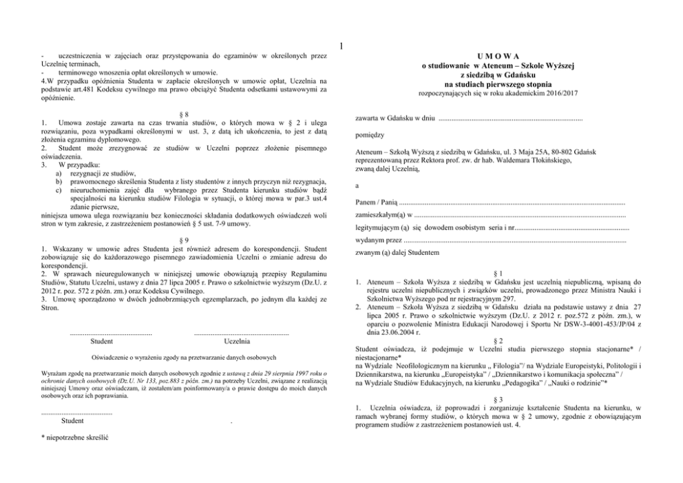 1 uczestniczenia w zajęciach oraz przystępowania do egzaminów w określonych przez Uczelnię terminach, terminowego wnoszenia opłat określonych w umowie. 4.W przypadku opóźnienia Studenta w zapłacie określonych w umowie opłat, Uczelnia na podstawie art.481 Kodeksu cywilnego ma prawo obciążyć Studenta odsetkami ustawowymi za opóźnienie. §8 1. Umowa zostaje zawarta na czas trwania studiów, o których mowa w § 2 i ulega rozwiązaniu, poza wypadkami określonymi w ust. 3, z datą ich ukończenia, to jest z datą złożenia egzaminu dyplomowego. 2. Student może zrezygnować ze studiów w Uczelni poprzez złożenie pisemnego oświadczenia. 3. W przypadku: a) rezygnacji ze studiów, b) prawomocnego skreślenia Studenta z listy studentów z innych przyczyn niż rezygnacja, c) nieuruchomienia zajęć dla wybranego przez Studenta kierunku studiów bądź specjalności na kierunku studiów Filologia w sytuacji, o której mowa w par.3 ust.4 zdanie pierwsze, niniejsza umowa ulega rozwiązaniu bez konieczności składania dodatkowych oświadczeń woli stron w tym zakresie, z zastrzeżeniem postanowień § 5 ust. 7-9 umowy. §9 1. Wskazany w umowie adres Studenta jest również adresem do korespondencji. Student zobowiązuje się do każdorazowego pisemnego zawiadomienia Uczelni o zmianie adresu do korespondencji. 2. W sprawach nieuregulowanych w niniejszej umowie obowiązują przepisy Regulaminu Studiów, Statutu Uczelni, ustawy z dnia 27 lipca 2005 r. Prawo o szkolnictwie wyższym (Dz.U. z 2012 r. poz. 572 z późn. zm.) oraz Kodeksu Cywilnego. 3. Umowę sporządzono w dwóch jednobrzmiących egzemplarzach, po jednym dla każdej ze Stron. ............................................. Student .................................................... Uczelnia Oświadczenie o wyrażeniu zgody na przetwarzanie danych osobowych Wyrażam zgodę na przetwarzanie moich danych osobowych zgodnie z ustawą z dnia 29 sierpnia 1997 roku o ochronie danych osobowych (Dz.U. Nr 133, poz.883 z późn. zm.) na potrzeby Uczelni, związane z realizacją niniejszej Umowy oraz oświadczam, iż zostałem/am poinformowany/a o prawie dostępu do moich danych osobowych oraz ich poprawiania. ....................................... Student * niepotrzebne skreślić . UMOWA o studiowanie w Ateneum – Szkole Wyższej z siedzibą w Gdańsku na studiach pierwszego stopnia rozpoczynających się w roku akademickim 2016/2017 zawarta w Gdańsku w dniu ............................................................................... pomiędzy Ateneum – Szkołą Wyższą z siedzibą w Gdańsku, ul. 3 Maja 25A, 80-802 Gdańsk reprezentowaną przez Rektora prof. zw. dr hab. Waldemara Tłokińskiego, zwaną dalej Uczelnią, a Panem / Panią ............................................................................................................................ zamieszkałym(ą) w .................................................................................................................... legitymującym (ą) się dowodem osobistym seria i nr............................................................... wydanym przez .......................................................................................................................... zwanym (ą) dalej Studentem §1 1. Ateneum – Szkoła Wyższa z siedzibą w Gdańsku jest uczelnią niepubliczną, wpisaną do rejestru uczelni niepublicznych i związków uczelni, prowadzonego przez Ministra Nauki i Szkolnictwa Wyższego pod nr rejestracyjnym 297. 2. Ateneum – Szkoła Wyższa z siedzibą w Gdańsku działa na podstawie ustawy z dnia 27 lipca 2005 r. Prawo o szkolnictwie wyższym (Dz.U. z 2012 r. poz.572 z późn. zm.), w oparciu o pozwolenie Ministra Edukacji Narodowej i Sportu Nr DSW-3-4001-453/JP/04 z dnia 23.06.2004 r. §2 Student oświadcza, iż podejmuje w Uczelni studia pierwszego stopnia stacjonarne* / niestacjonarne* na Wydziale Neofilologicznym na kierunku „ Filologia”/ na Wydziale Europeistyki, Politologii i Dziennikarstwa, na kierunku „Europeistyka” / „Dziennikarstwo i komunikacja społeczna” / na Wydziale Studiów Edukacyjnych, na kierunku „Pedagogika” / „Nauki o rodzinie”* §3 1. Uczelnia oświadcza, iż poprowadzi i zorganizuje kształcenie Studenta na kierunku, w ramach wybranej formy studiów, o których mowa w § 2 umowy, zgodnie z obowiązującym programem studiów z zastrzeżeniem postanowień ust. 4. 2 2. W wykonaniu zobowiązania, o którym mowa w ust. 1, Uczelnia zorganizuje i przeprowadzi wymagane w programie studiów wykłady, ćwiczenia, lektoraty z języków obcych, zaliczenia i egzaminy z poszczególnych przedmiotów oraz egzamin dyplomowy warunkujący uzyskanie dyplomu ukończenia studiów pierwszego stopnia z tytułem licencjata. 3. Uczelnia zobowiązuje się: zapewnić właściwą organizację studiów i odpowiedni poziom nauczania z przedmiotów objętych programem studiów, zapewnić kadrę naukowo – dydaktyczną o wysokich kwalifikacjach oraz właściwą organizację procesu dydaktycznego. 4. Uczelnia oświadcza, że dla uruchomienia zajęć na określonym kierunku studiów oraz na określonej specjalności na kierunku studiów wymagane jest wypełnienie minimum limitu przyjęć, ustalonego przez Rektora. Uczelnia oświadcza, że dla uruchomienia zajęć na określonej specjalności i specjalizacji na kierunku studiów wymagane jest wypełnienie minimum limitu chętnych Studentów, ustalonego przez Rektora. 5. W przypadku Wydziału Neofilologicznego – Studenta od pierwszego semestru na kierunku obowiązuje jedna z wybranych przez niego specjalności: Filologia angielska, Filologia germańska, Filologia włoska albo Filologia hiszpańska. W ramach wybranej specjalności student na drugim semestrze wybiera specjalizację, która rozpoczyna się od semestru trzeciego. W przypadku Wydziału Europeistyki, Politologii i Dziennikarstwa oraz Wydziału Studiów Edukacyjnych – Student na drugim semestrze wybiera sp