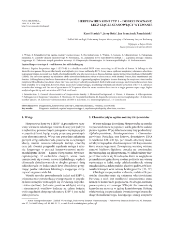 HERPESWIRUS KONI TYP 1 – DOBRZE POZNANY, LECZ CIĄGLE STANOWIĄCY WYZWANIE POST. MIKROBIOL., 2016, 55, 4, 351–360 http://www.pm.microbiology.pl Karol Stasiak1*, Jerzy Rola1, Jan Franciszek Żmudziński1 Zakład Wirusologii, Państwowy Instytut Weterynaryjny – Państwowy Instytut Badawczy 1 Wpłynęło w lutym 2016 r. Zaakceptowano w kwietniu 2016 r. 1. Wstęp. 2. Charakterystyka ogólna rodziny Herpesviridae. 3. Rys historyczny. 4. Wirion. 5. Genom. 6. Glikoproteiny. 7. Patogeneza zakażenia. 8. Choroby układu oddechowego. 9. Poronienia. 10. Zakażenia nowo narodzonych źrebiąt. 11. Zapalenia mózgu i rdzenia kręgowego. 12. Zakażenia innych gatunków zwierząt. 13. Diagnostyka laboratoryjna. 14. Immunoprofilaktyka. 15. Podsumowanie Equine Herpesvirus type 1 – well known, but still challenging Abstract: Equine herpesvirus type 1 (EHV-1) is a double-stranded DNA virus occurring in all breeds of horses. It belongs to the Varicellovirus genus, Herpesviridae family and Alphaherpesvirinae subfamily. EHV-1 may cause epidemic respiratory disorders, abortions in pregnant mares, neonatal foal death, chorioretinopathy and also neurological disease, termed equine herpesvirus myeloencephalopathy (EHM). The infection spreads by inhalation of the aerosolised infectious virus or close contact with aborted fetuses, fetal membranes and fomites. Lifelong latency has been demonstrated especially in trigeminal ganglion, lymphatic tissues draining the respiratory tract and in peripheral blood leukocytes, from where the virus can be periodically reactivated. Both traditional serologic and virus isolation tests have been available for a long time, however, these assays have disadvantages, interfering with fast and reliable detection of EHV-1. Advances in molecular biology and the use of quantitative PCR system allow for more sensitive detection in a single genome copy range, higher analytical specificity and calculation of EHV-1 viral loads. 1. Introduction. 2. General characteristics of Herpesviridae family. 3. Historical background. 4. Virion. 5. Genome. 6. Glycoproteins. 7. Pathogenesis 8. Respiratory disorders. 9. Abortions. 10. Neonatal foal deaths. 11. Equine herpesvirus myeloencephalopathy. 12. Infections in other species. 13. Laboratory demonstration of EHV-1 infections. 14. Immunoprophylaxis. 15. Conclusion Słowa kluczowe: Diagnostyka, herpeswirus koni typ 1, mieloencefalopatia, ronienia, szczepionki Key words: Diagnostic methods, equine herpesvirus type 1, myeloencephalopathy, abortions, vaccines 1.Wstęp 2.Charakterystyka ogólna rodziny Herpesviridae Herpeswirus koni typ 1 (EHV-1), początkowo nazywany wirusem zakaźnego ronienia klaczy jest jednym z najbardziej powszechnych patogenów występujących w populacji koni, będąc częstą przyczyną poważnych strat ekonomicznych. Wirus ten powoduje zakażenia górnych dróg oddechowych, poronienia u ciężarnych klaczy, śmierć nowonarodzonych źrebiąt, choroby oczu jak również przypadki zapalenia mózgu i rdzenia kręgowego w postaci herpeswirusowej mieloencefalopatii (EHM – Equine Herpesvirus Myeloencephalopathy). U osobni ków chorych, wirus może umiejscowić się w zwoju nerwu trójdzielnego, węzłach chłonnych zlokalizowanych w obrębie górnych dróg oddechowych i w leukocytach krwi obwodowej przyjmując postać zakażenia latentnego, mogącego utrzymywać się przez wiele lat. Wyniki szeroko prowadzonych badań nad EHV-1, jednoznacznie potwierdzają występowanie w populacji koni szczepów różniących się wirulencją (wysokoi słabo-zjadliwe). Jednakże pomimo zdobytej wiedzy i nieustannych wysiłków badaczy na całym świecie, wiele zagadnień dotyczących natury EHV-1 jest nadal słabo poznana. Wirusy należące do rodziny Herpesviridae są szeroko rozpowszechnione w populacji wielu gatunków ssaków, ptaków i gadów. W jej skład zaliczamy trzy podrodziny: Alphaherpesvirinae, Betaherpesvirinae i Gammaherpesvirinae. Posiadają one liniowy, dwuniciowy DNA (o wielkości 124–230 tys. par zasad), otoczony ikosaedralnym kapsydem zbudowanym ze 162 kapsomerów, które otacza tegument. Zewnętrzną warstwę wirionu stanowi białkowo-lipidowa otoczka na powierzchni której znajdują się glikoproteiny. W skład rodziny Herpesviridae zalicza się 14 rodzajów, które ze względu na przynależność gatunkową można podzielić na: wirusy występujące u ludzi, małp człekokształtnych, wirusy innych ssaków, a także ptaków, płazów i gadów, ryb kostnoszkieletowych oraz wirusy bezkręgowców [35, 57]. Z biologicznego punktu widzenia, rodzina Herpes viridae charakteryzuje się czterema właściwościami. Pierwszą z nich jest możliwość ustanowienia stanu latencji w komórkach gospodarza. Po drugie, zarówno proces syntezy wirusowego DNA jak i formowania się kapsydu ma miejsce w jądrze komórkowym. Kolejną właściwością jest posiadanie dwuniciowego kwasu deoksyrybonukleinowego, kodującego szereg enzymów * Autor korespondencyjny: Zakład Wirusologii, Państwowy Instytut Weterynaryjny – Państwowy Instytut Badawczy, Al. Partyzantów 57, 24-100 Puławy; tel. 81 889 31 21, e-mail: [email protected] 352 KAROL STASIAK, JERZY ROLA, JAN FRANCISZEK ŻMUDZIŃSKI biorących udział w metabolizmie kwasów nukleinowych, białek i w syntezie DNA. Czwartą cechą jest śmierć komórki gospodarza na skutek uwalniania się wirusów potomnych [57]. 3.Rys historyczny Badania nad czynnikami zakaźnymi o etiologii wirusowej wywołującymi ronienia u klaczy miały swój początek w latach trzydziestych ubiegłego wieku na Uniwersytecie Rolniczym w stanie Kentucky (USA). Infekcja, za wywołanie której podejrzewano nieznany współczesnej nauce wirus, została po raz pierwszy opisana w 1933 roku na podstawie zaobserwowanych zmian anatomopatologicznych u poronionego końskiego płodu [16]. Niecałe dwie dekady późnej w dia g nostyce zakaźnego ronienia klaczy posłużono się metodami serologicznymi z których najszersze zastosow