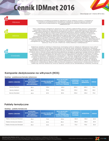 Cennik IDMnet 2016 Obowiązuje od 1 marca 2016 roku archirama.pl, architektura.muratorplus.pl, dekoteria.pl, eska.pl, eskago.pl, murator.tv, muratordom.pl, muratorplus.pl, poradnikzdrowie.pl, tuznajdziesz.pl, urzadzamy.pl, wymarzonyogrod.pl, podroze.pl, zagle.com.pl, budujeurzadzam.pl, dom.pl,galeriaprojektow.pl, polityka.pl, mniammniam.com, wielkiezarcie.com PREMIUM eska.tv, eskacinema.pl, eskagames.pl, eskarock.pl, fokus.tv, glamki.pl, mjakmama24.pl, sport.se.pl, superauto24.pl, superseriale.pl, 90minut.pl, allani.pl, android.com.pl, anonser.pl, apartamenty.pl, appleworld.pl, artimperium.pl, babiniec-cafe.pl, babyboom.pl, biblionetka.pl, biomedical.pl, budnews.tv, cyberfoto.pl, deko-rady.pl, dekorady.tv, dekoratorniatv.pl, digi-tv.pl, dominnowacji.pl, domowe-gotowanie.pl, domowe-wypieki.pl, domtrendy.pl dorzeczy.pl, drogapozdrowie.pl, dzieci.org.pl, dziecirosna.pl, dziennikwschodni.pl, edupedia.pl, e-zdrowie.info, fishing.pl, gazetapolska.pl, gazetaolsztynska.pl, glow.pl, gsmonline.pl, i-apteka.pl, idealnydom.pl, informatorbudowlany.pl, legeo.pl, lubimyczytac.pl, marketing.org.pl, modny-dom.pl, mojeprzepisy.pl, msg.org.pl, najlepszylekarz.pl, neurobiz.pl, newseria.pl, ng24.ie, nieruchomosci-online.pl, niezalezna.pl, nowyekran.pl, objawy.net, odachach.pl, openkontakt.com, pies.pl, polskastacja.pl, pychotka.pl, razem.tv, remontuj.pl, rolnicy.com, salekonferencyjne.pl, samsung-mobile.pl, sciaga.pl, solarkurier.pl, solidnydom.pl, sportbiznes.pl, sprzedajemy.pl, strefavod.pl, stronywnetrza.pl swiatogrodow.pl, szafa.pl, szafka.pl, teleman.pl, twojadieta.pl, twojdeser.pl, twojeinnowacje.pl, twojprojekt.pl, uczelnie.pl, vipnews.pl, wm.pl, wrc.com, wmeritum.pl, wnetrza.webzine.pl, wszelkieprzepisy.pl MEDIUM drzyjlacha.pl, eskainfo.pl, hotplota.pl, miastownia.pl, mowimyjak.pl, polotv.pl, radioplus.pl, radiowawa.pl, se.pl, voxfm.pl, voxmusic.tv,4clubbers.com.pl, 4free.pl, bobomarket.pl, bumovista.pl, cba.pl, chamsko.pl, charaktery.eu, choroby.biz, ciekawemiejsca.org,cro.pl, czary.pl, deblin24.eu, discoclipy.com, disco-polo.info, discopoloz.pl, discowrzuta.com, doadopcji.pl, dresscloud.pl,e-conomica.pl, ekonews.com.pl, filmowo.pl, forum.cyanmod.pl, forumfs.pl, forummedyczne.pl, forumowisko.pl, funpark.pl, urora.tv, futbol.pl, futmal.pl, gieromaniak.pl, globtroter.pl, gmagazyn.pl, grzenda.pl, hopaj.pl, how2win.pl, idolina.pl, inowroclaw.info.pl, karmiepsiaki.pl, kawusia.pl, kibice.net, kiszona.pl, kolorowanki-dla-dzieci.pl, kortensa.pl, koty.org.pl kozienice24.pl, krainatapet.pl, legalne.info, leki.med.pl, liczby.pl, magiafutbolu.pl, manga-lib.pl, mapa-online.pl, matura.pl, mecze24.pl, meczelive.tv, meczenazywo.pl, meczenazywo.tv, meczyki.pl, medpytania.pl, miastogier.pl, modowo.pl, morusek.pl, morze.turystyka.pl, nadmorze.pl, nocowanie.pl, ny.pl, o.pl, of.pl, okazje.info.pl, open-bar.pl, ozwierzakach.pl, pdaclub.pl, pieknewlosy.pl, pionki24.pl, playody.com , polskaniezwykla.pl, polskieszlaki.pl, popler.tv, popularnie.pl, portalisko.pl, promoceny.pl, promocyjni.pl, prywatnezdrowie.pl, psy.elk.pl, radio.nadaje.com, reseton.pl, satkurier.pl, sciaga-online.pl, sekrety-zdrowia.org, sennik.org.pl, sheyk.pl, siatkicentylowe.com, soccer-live.pl, splawik.com, stacjakultura.pl, suwaczki.com, swiatpodrozy.pl, szybko.pl, teksty.org, temysli.pl, terazpasy.pl, trophyhunters.pl, turystyka-online.pl, twitch.tv, widelec.org, wiocha.pl, xboxforum.pl, xmoon.pl, zadane.pl, zamiasto.com.pl, ziemiaklodzka.pl, zwolen24.pl, zwyrole.org STANDARD Kampanie dedykowane na witrynach (ROS) Desktop - podstawowe formaty reklamowe GRUPA CENOWA BILLBOARD / SKYSCRAPPER RIGHT / RECTANGLE / MEGAŚRÓDTEKST DOUBLE BILLBOARD / HALFPAGE TRIPLE BILLBOARD / WIDEBOARD / DOUBLE WIDEBOARD / HALFPAGE PREMIUM SCREENING / TOPLAYER / FLOORAD FULL PAGE / INTERSTITIAL INREAD Serwisy Premium 80 zł 120 zł 160 zł 200 zł 240 zł 90 zł Serwisy Medium 60 zł 90 zł 120 zł 150 zł 180 zł 80 zł Serwisy Standard 40 zł 60 zł 80 zł 100 zł 120 zł 70 zł GRUPA CENOWA BILLBOARD / SKYSCRAPPER RIGHT / RECTANGLE / MEGAŚRÓDTEKST DOUBLE BILLBOARD / HALFPAGE TRIPLE BILLBOARD / WIDEBOARD / DOUBLE WIDEBOARD / HALFPAGE PREMIUM SCREENING / TOPLAYER / FLOORAD INTERSTITIAL INREAD Pakiety tematyczne Premium 50 zł 75 zł 100 zł 125 zł 150 zł 65 zł Pakiety tematyczne Medium 40 zł 60 zł 80 zł 100 zł 120 zł 60 zł Pakiety tematyczne Standard 30 zł 45 zł 60 zł 75 zł 90 zł 55 zł Pakiety tematyczne Desktop - pakiety tematyczne Internetowy Dom Mediowy net S.A z siedziba w Warszawie, 04-190 Warszawa, ul. Jubilerska 10, NIP 525-21-95-690, REGON 016867360, wpisana do Krajowego Rejestru Sadowego prowadzonego przez Sad Rejonowy dla m.st. Warszawy, XIII Wydział Gospodarczy pod numerem KRS 0000300667, kapitał zakładowy (opłacony w całosci) 13 610 000,00 złotych Najbardziej multimedialna grupa w Polsce Cennik IDMnet 2016 Obowiązuje od 1 marca 2016 roku PREMIUM architektura, biznes i finanse, budownictwo, informacje, kulinaria, wnętrza, zdrowie MEDIUM ciąża, diety, fitness, lifestyle, moda i uroda, motoryzacja, nieruchomości, ogród, parenting STANDARD projekty, rozrywka, sport, turystyka Desktop - pakiety dedykowane, minimum 5 serwisów GRUPA CENOWA BILLBOARD / SKYSCRAPPER RIGHT / RECTANGLE / MEGAŚRÓDTEKST DOUBLE BILLBOARD / HALFPAGE TRIPLE BILLBOARD / WIDEBOARD / DOUBLE WIDEBOARD / HALFPAGE PREMIUM TOPLAYER / FLOORAD INTERSTITIAL INREAD Serwisy Premium + Medium 60 zł 90 zł 120 zł 150 zł 180 zł 80 zł Serwisy Premium + Standard 50 zł 75 zł 100 zł 125 zł 150 zł 75 zł Serwisy Premium, Medium + Standard 50 zł 75 zł 100 zł 125 zł 150 zł 75 zł Serwisy Medium + Standard 40 zł 60 zł 80 zł 100 zł 120 zł 65 zł Kampanie zasięgowe (RON) GRUPA CENOWA BILLBOARD / SKYSCRAPPER RIGHT / RECTANGLE / MEGAŚRÓDTEKST DOUBLE BILLBOARD / HALFPAGE TRIPLE BILLBOARD / WIDEBOARD / DOUBLE WIDEBOARD / HALFPAGE PREMIUM TOPLAYER / FLOORAD INTERSTITIAL INREAD Pakiet zasięgowy RON IDMnet 10 zł 12 zł 14 zł 16 zł 20 zł 40 zł GRUPA CENOWA BILLBOARD / 